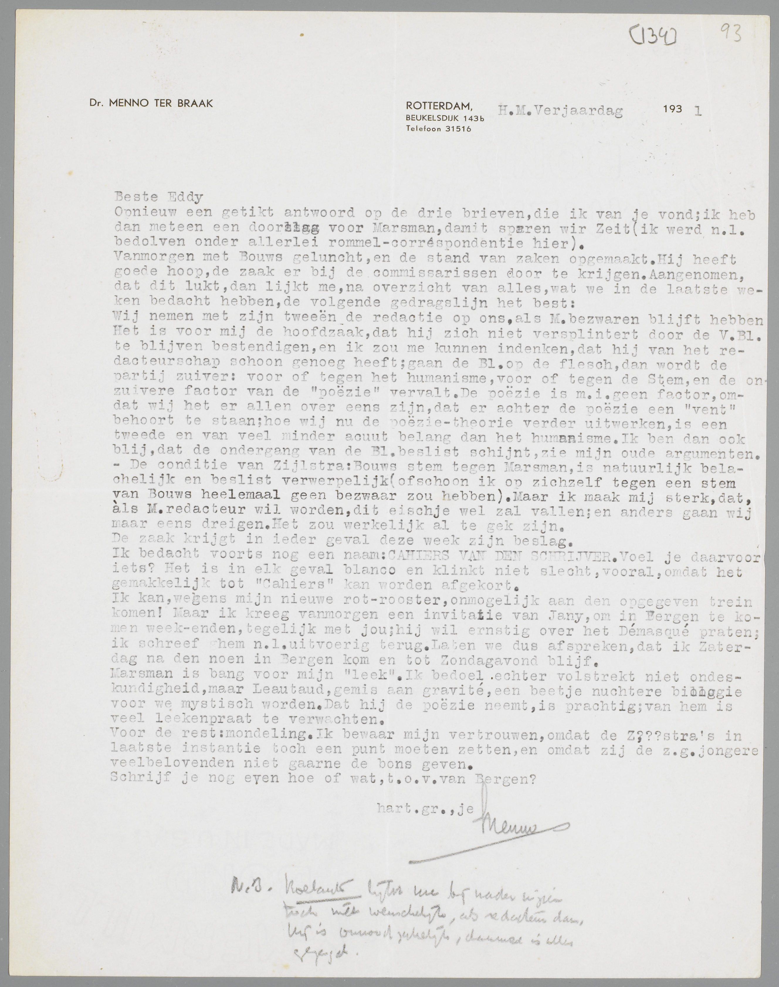 Wij nemen met zijn tweeën de redactie op ons, als M. bezwaren blijft hebben. Het is voor mij de hoofdzaak, dat hij zich niet versplintert door de V. Bl. te blijven bestendigen, en ik zou me kunnen indenken, dat hij van het redacteurschap schoon genoeg heeft; gaan de Bl. op de flesch, dan wordt de partij zuiver: voor of tegen het humanisme, voor of tegen de Stem, en de onzuivere factor van de ‘poëzie’ vervalt. De poëzie is m.i. geen factor, omdat wij het er allen over eens zijn, dat er achter de poëzie een ‘vent’ behoort te staan; hoe wij nu de poëzie-theorie verder uitwerken, is een tweede en van veel minder acuut belang dan het humanisme. Ik ben dan ook blij, dat de ondergang van de Bl. beslist schijnt, zie mijn oude argumenten. - De conditie van Zijlstra: Bouws stem tegen Marsman, is natuurlijk belachelijk en beslist verwerpelijk (ofschoon ik op zichzelf tegen een stem van Bouws heelemaal geen bezwaar zou hebben). Maar ik maak mij sterk, dat, àls M. redacteur wil worden, dit eischje wel zal vallen; en anders gaan wij maar eens dreigen. Het zou werkelijk al te gek zijn.