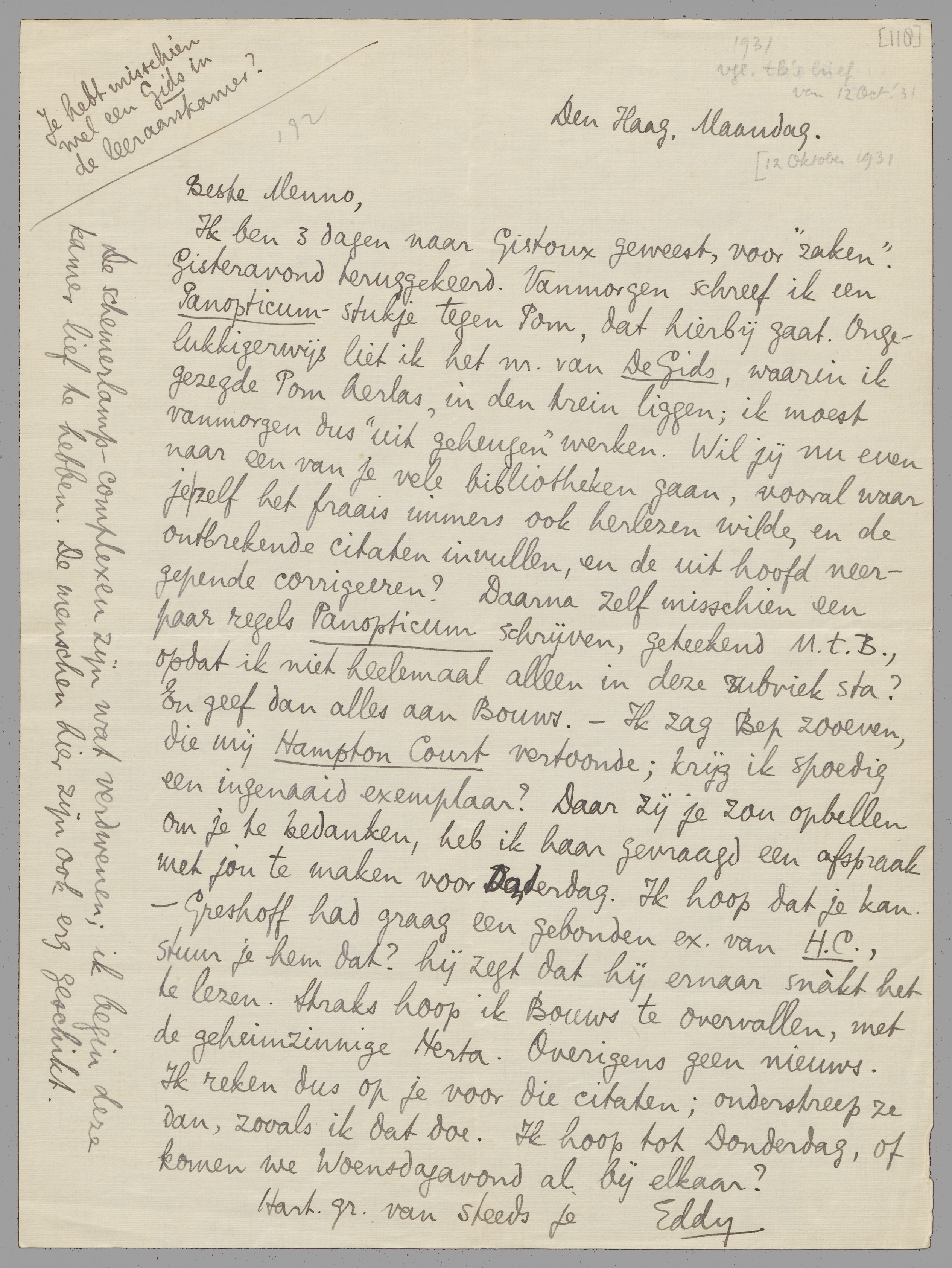 Ik ben 3 dagen naar Gistoux geweest, voor ‘zaken’. Gisteravond teruggekeerd. Vanmorgen schreef ik een Panopticum-stukje tegen Pom, dat hierbij gaat. Ongelukkigerwijs liet ik het nr. van De Gids, waarin ik gezegde Pom herlas, in den trein liggen; ik moest vanmorgen dus ‘uit geheugen’ werken. Wil jij nu even naar een van je vele bibliotheken gaan, vooral waar je zelf het fraais immers ook herlezen wilde, en de ontbrekende citaten invullen, en de uit hoofd neergepende corrigeeren? Daarna zelf misschien een paar regels Panopticum schrijven, geteekend M.t.B., opdat ik niet heelemaal alleen in deze rubriek sta? En geef dan alles aan Bouws. - Ik zag Bep zooeven, die mij Hampton Court vertoonde; krijg ik spoedig een ingenaaid exemplaar? Daar zij je zou opbellen om je te bedanken, heb ik haar gevraagd een afspraak met jou te maken voor Donderdag. Ik hoop dat je kan. - Greshoff had graag een gebonden ex. van H.C., stuur je hem dat? hij zegt dat hij er naar snàkt het te lezen. Straks hoop ik Bouws te overvallen, met de geheimzinnige Herta. Overigens geen nieuws. Ik reken dus op je voor die citaten; onderstreep ze dan, zooals ik dat doe. Ik hoop tot Donderdag, of komen we Woensdagavond al bij elkaar?