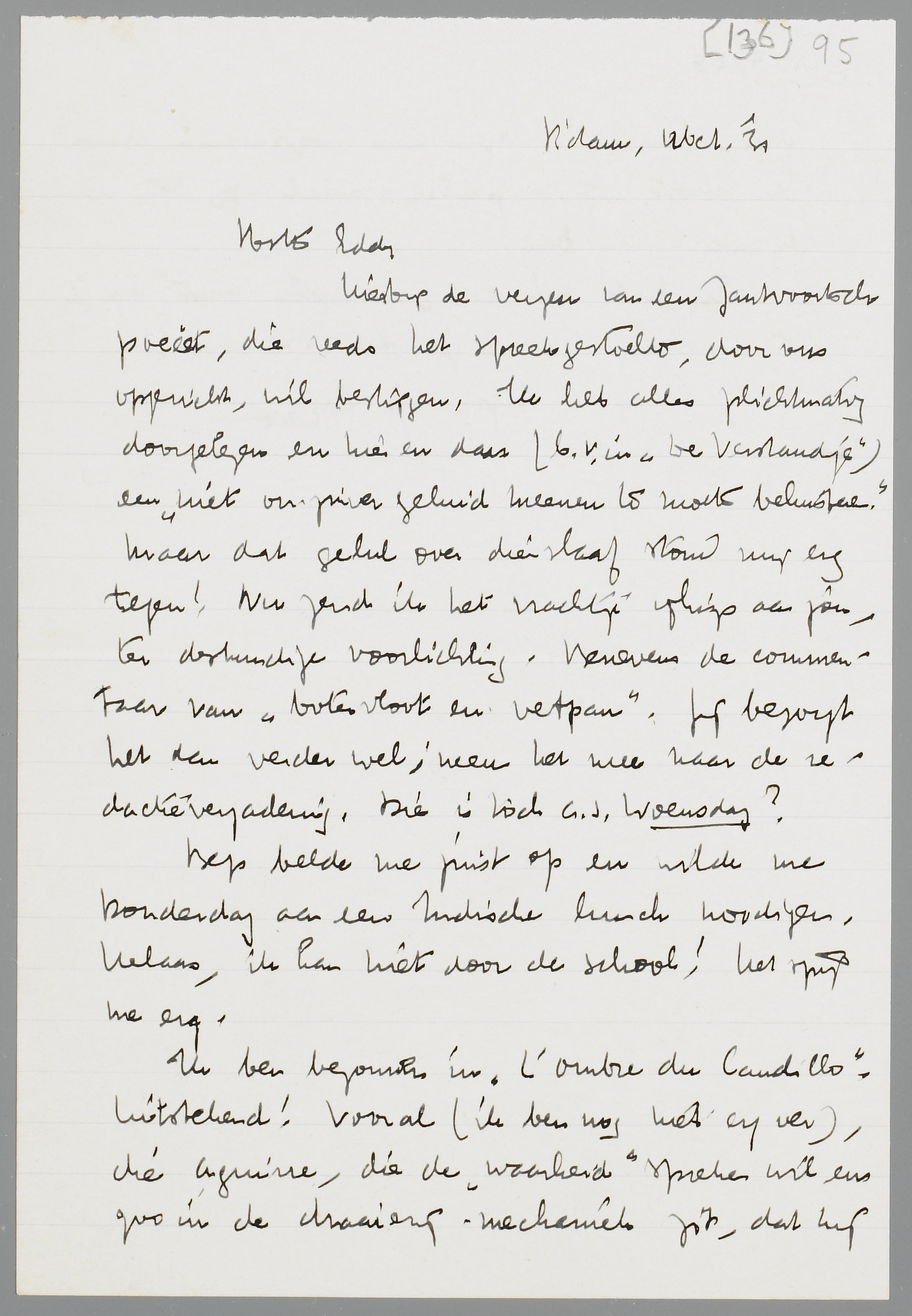 Hierbij de verzen van een Zantvoortsch poeëet, die reeds het spreekgestoelte, door ons opgericht, wil bestijgen. Ik heb alles plichtmatig doorgelezen en hier en daar (b.v. in De Verstandige) een ‘niet onzuiver geluid meenen te moeten beluisteren.’ Maar dat gelul over dien slaaf stond mij erg tegen! Nu zend ik het vrachtje ijlings aan jou, ter deskundige voorlichting. Benevens de commentaar van ‘botervloot en vetpan’. Jij bezorgt het dan verder wel; neem het mee naar de redactievergadering. Die is toch a.s. Woensdag?