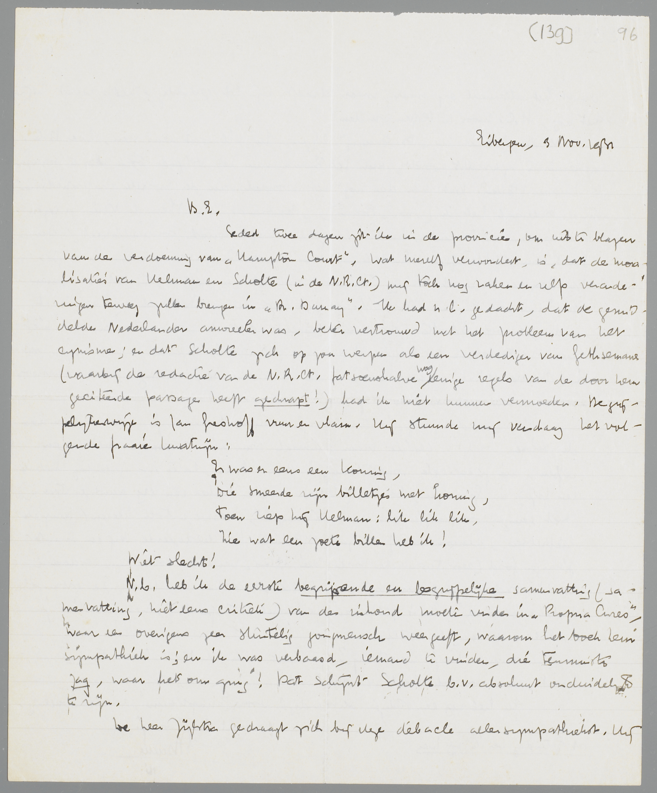 Sedert twee dagen zit ik in de provincie, om uit te blazen van de verdoeming van Hampton Court. Wat mezelf verwondert, is, dat de moralisaties van Helman en Scholte (in de N.R.Cr.) mij toch nog raken en zelfs veranderingen teweeg zullen brengen in de Dr. Dumay. Ik had n.l. gedacht, dat de gemiddelde Nederlander amoreeler was, beter vertrouwd met het probleem van het cynisme; en dat Scholte zich op zou werpen als een verdediger van Gethsemane (waarbij de redactie van de N.R.Cr. fatsoenshalve nog eenige regels van de door hem geciteerde passage heeft geschrapt!) had ik niet kunnen vermoeden. Begrijpelijkerwijze is Jan Greshoff vuur en vlam. Hij stuurde mij vandaag het volgende fraaie kwatrijn:
