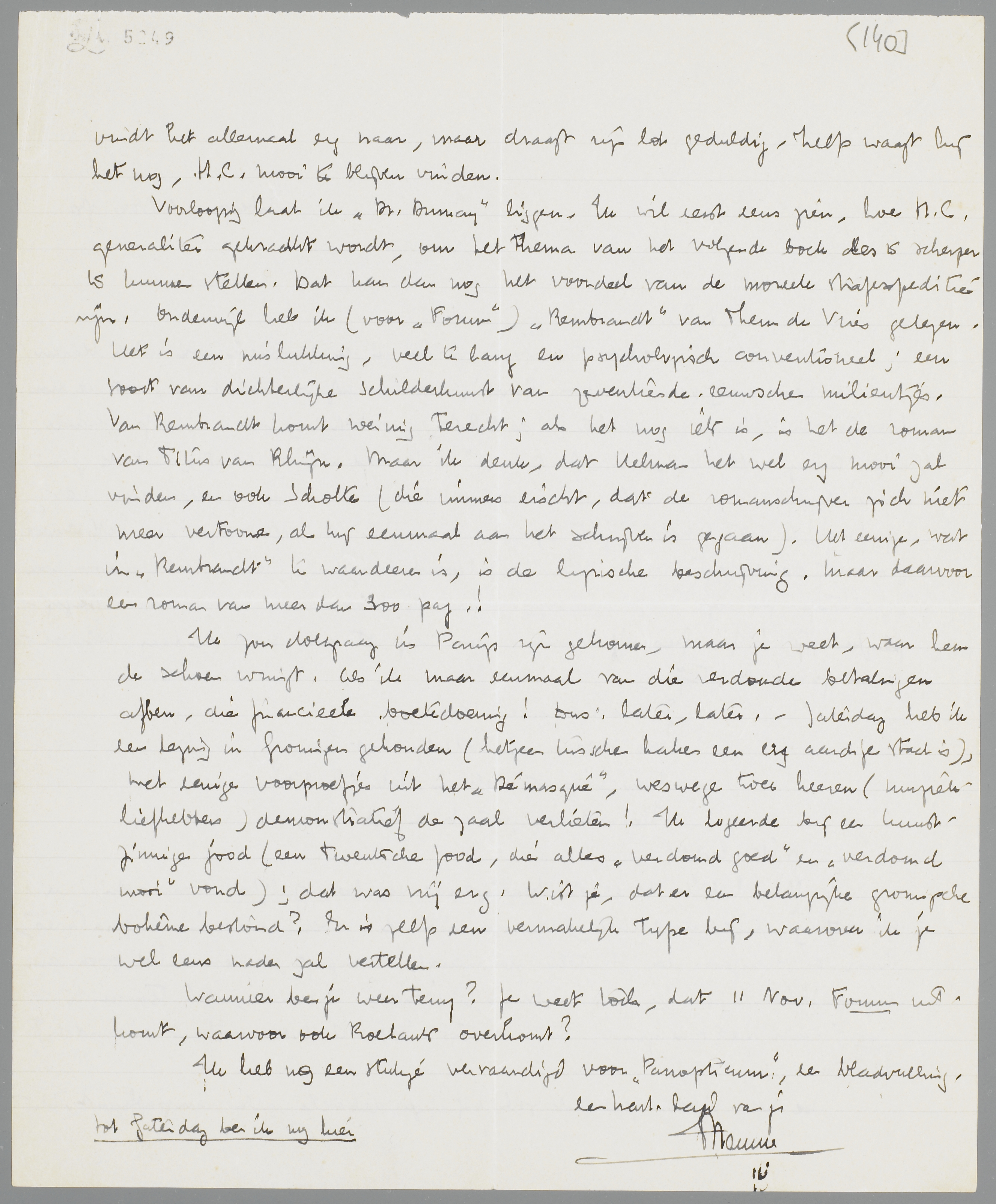 Voorloopig laat ik Dr. Dumay liggen. Ik wil eerst eens zien, hoe H.C. generaliter gebracht wordt, om het thema van het volgende boek des te scherper te kunnen stellen. Dat kan dan nog het voordeel van de moreele strafexpeditie zijn. Onderwijl heb ik (voor Forum) Rembrandt van Theun de Vries gelezen. Het is een mislukking, veel te lang en psychologisch conventioneel; een soort van dichterlijke schilderkunst van zeventiende-eeuwsche milieutjes. Van Rembrandt komt weinig terecht; als het nog iets is, is het de roman van Titus van Rhijn. Maar ik denk, dat Helman het wel erg mooi zal vinden, en ook Scholte (die immers eischt, dat de romanschrijver zich niet meer vertoone, als hij eenmaal aan het schrijven is gegaan). Het eenige, wat in Rembrandt te waardeeren is, is de lyrische beschrijving. Maar daarvoor een roman van meer dan 300 pag.!