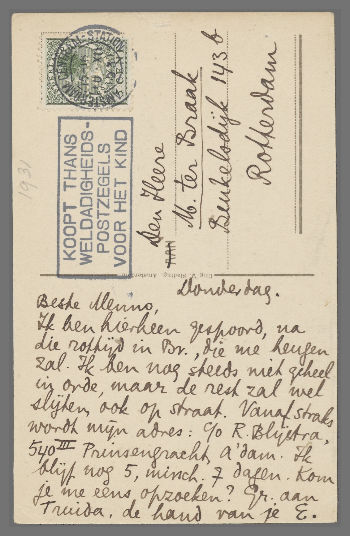 Ik ben hierheen gespoord, na die rottijd in Br., die me heugen zal. Ik ben nog steeds niet geheel in orde, maar de rest zal wel slijten, ook op straat. Vanaf straks wordt mijn adres: c/o R. Blijstra, 540 III Prinsengracht A'dam. Ik blijf nog 5, missch. 7 dagen. Kom je me eens opzoeken? Gr. aan Truida, de hand van je E.