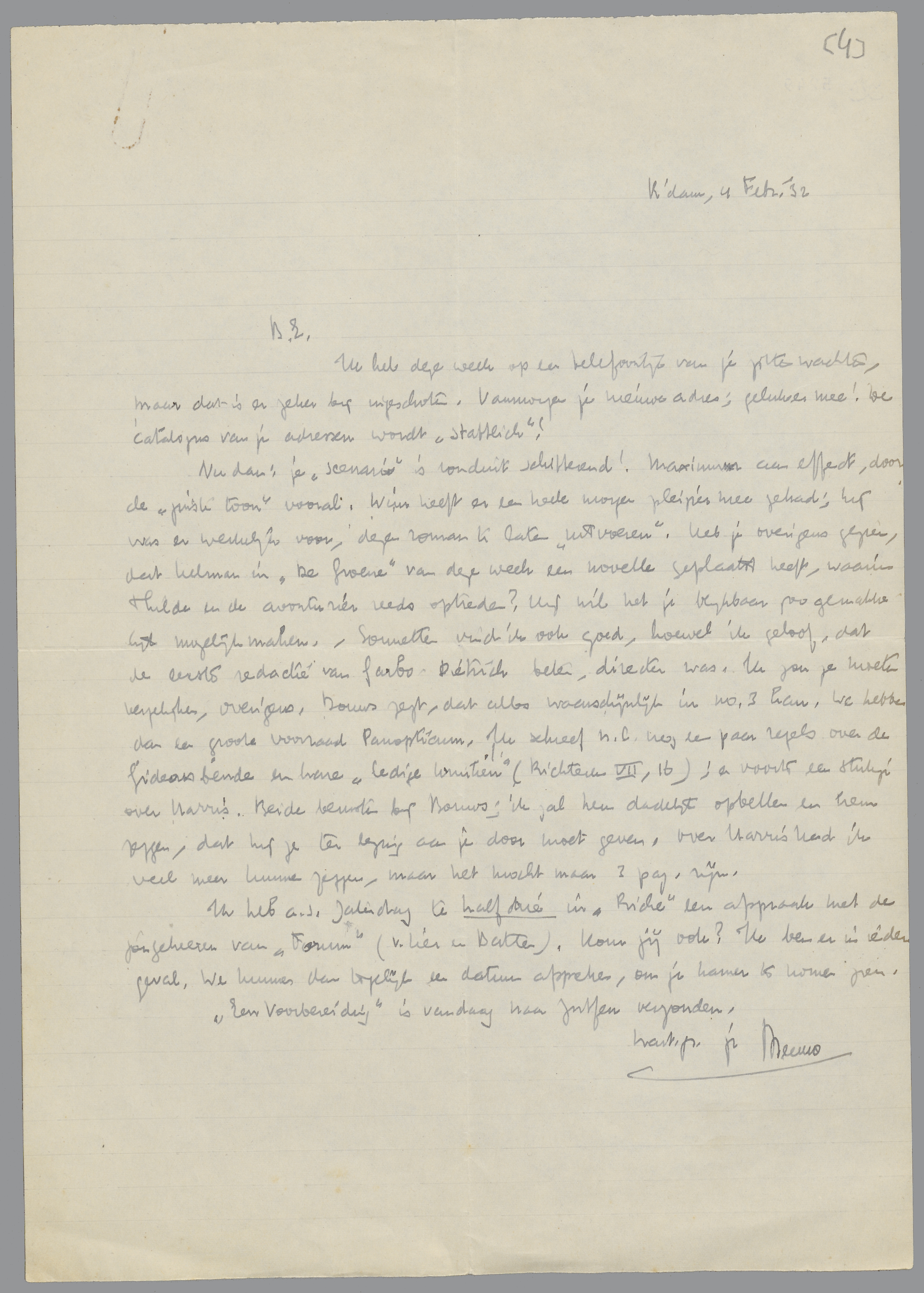 Nu dan: je ‘scenario’ is ronduit schitterend! Maximum aan effect, door de ‘juiste toon’ vooral. Wim heeft er een heele morgen pleizier mee gehad; hij was er werkelijk voor, dezen roman te laten ‘uitvoeren’. Heb je overigens gezien, dat Helman in De Groene van deze week een novelle geplaatst heeft, waarin Thilde en de avonturier reeds optreden? Hij wil het je blijkbaar zoo gemakkelijk mogelijk maken. Sonnetten vind ik ook goed, hoewel ik geloof, dat de eerste redactie van Garbo-Dietrich beter, directer was. Ik zou ze moeten vergelijken, overigens. Bouws zegt, dat alles waarschijnlijk in no. 3 kan. We hebben dan een groote voorraad Panopticum. Ik schreef n.l. nog een paar regels over de Gideonsbende en hare ‘ledige kruiken’ (Richteren VII, 16); en voorts een stukje over Harris. Beide berusten bij Bouws; ik zal hem dadelijk opbellen en hem zeggen, dat hij ze ter lezing aan je door moet geven. Over Harris had ik veel meer kunnen zeggen, maar het mocht maar 3 pag. zijn. Ik heb a.s. Zaterdag te half drie in Riche een afspraak met de jongeheeren van Forum (v. Lier en Batten). Kom jij ook? Ik ben er in ieder geval. We kunnen dan tegelijk een datum afspreken, om je kamer te komen zien.