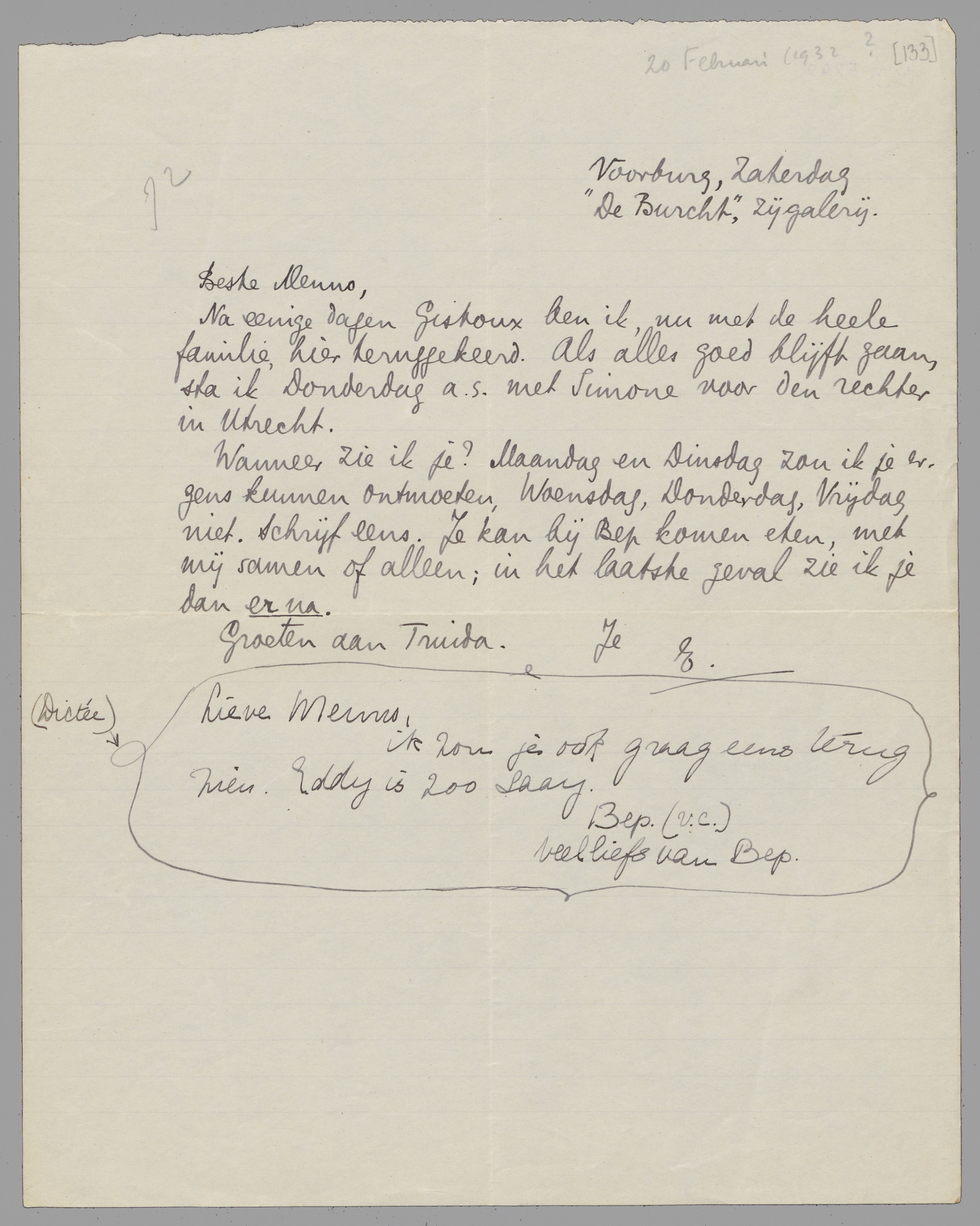 Wanneer zie ik je? Maandag en Dinsdag zou ik je ergens kunnen ontmoeten. Woensdag, Donderdag, Vrijdag niet. Schrijf eens. Je kan bij Bep komen eten, met mij samen of alleen; in het laatste geval zie ik je dan er na.