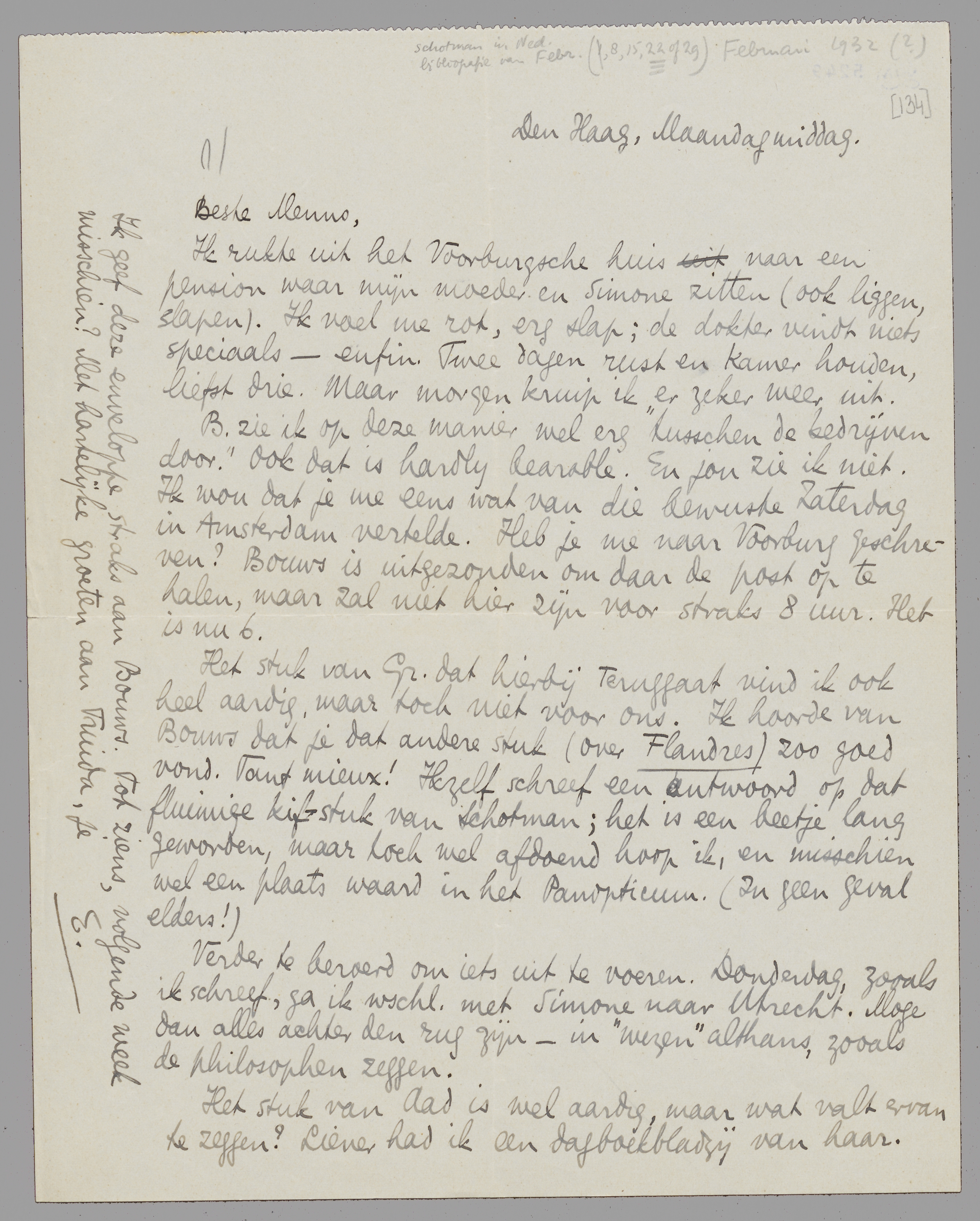 Verder te beroerd om iets uit te voeren. Donderdag, zooals ik schreef, ga ik wschl. met Simone naar Utrecht. Moge dan alles achter den rug zijn - in ‘wezen’ althans, zooals de philosophen zeggen.