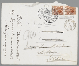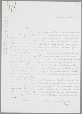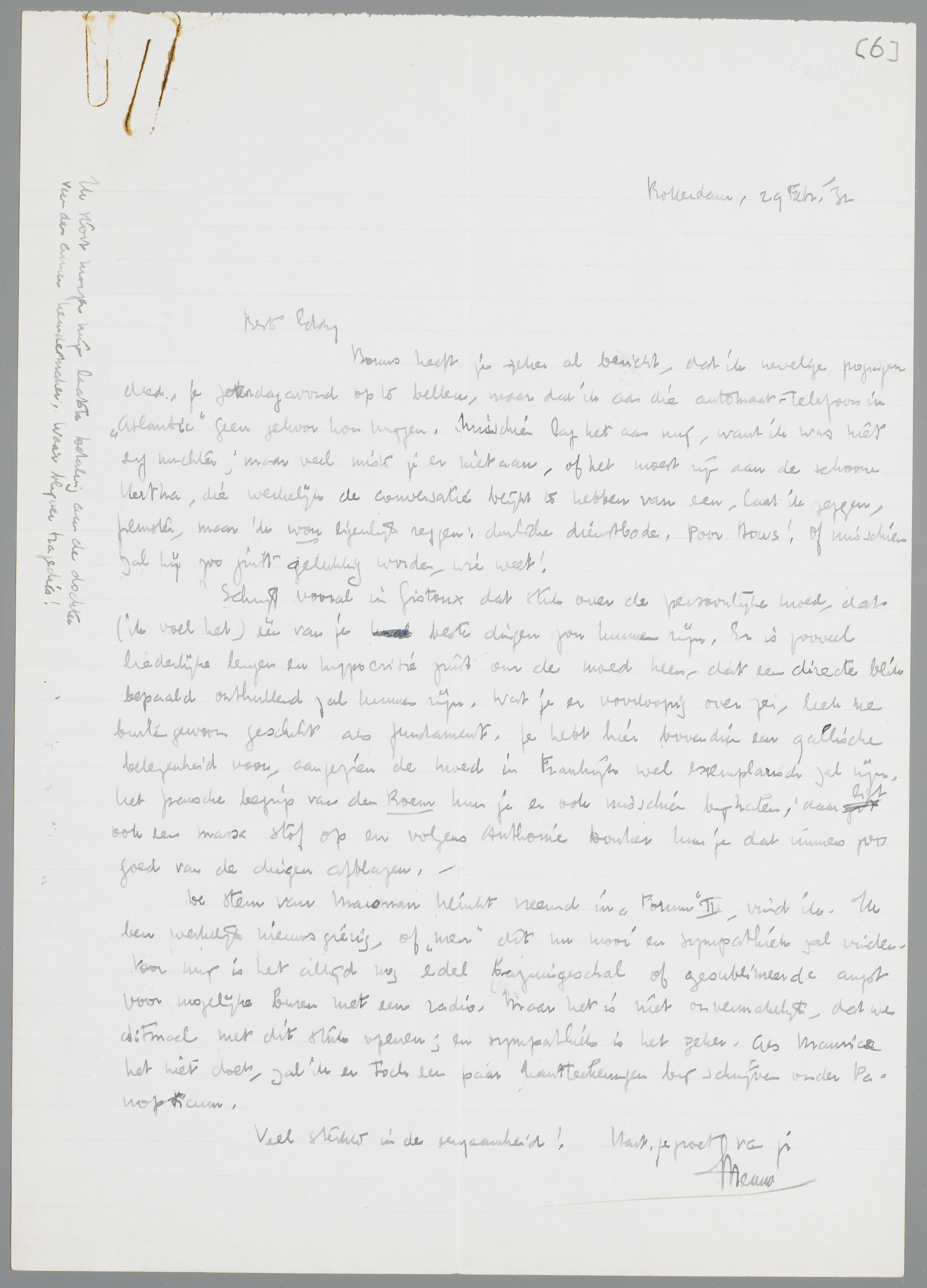 Bouws heeft je zeker al bericht, dat ik nevelige pogingen deed, je Zaterdagavond op te bellen, maar dat ik aan die automaat-telefoon in Atlantic geen gehoor kon krijgen. Misschien lag het aan mij, want ik was niet erg nuchter; maar veel miste je er niet aan of het moest zijn aan de schoone Hertha, die werkelijk de conversatie blijkt te hebben van een, laat ik zeggen, filmster, maar ik wou eigenlijk zeggen: duitsche dienstbode. Poor Bows! Of misschien zal hij zoo juist gelukkig worden, wie weet!
