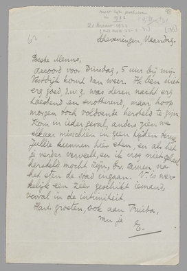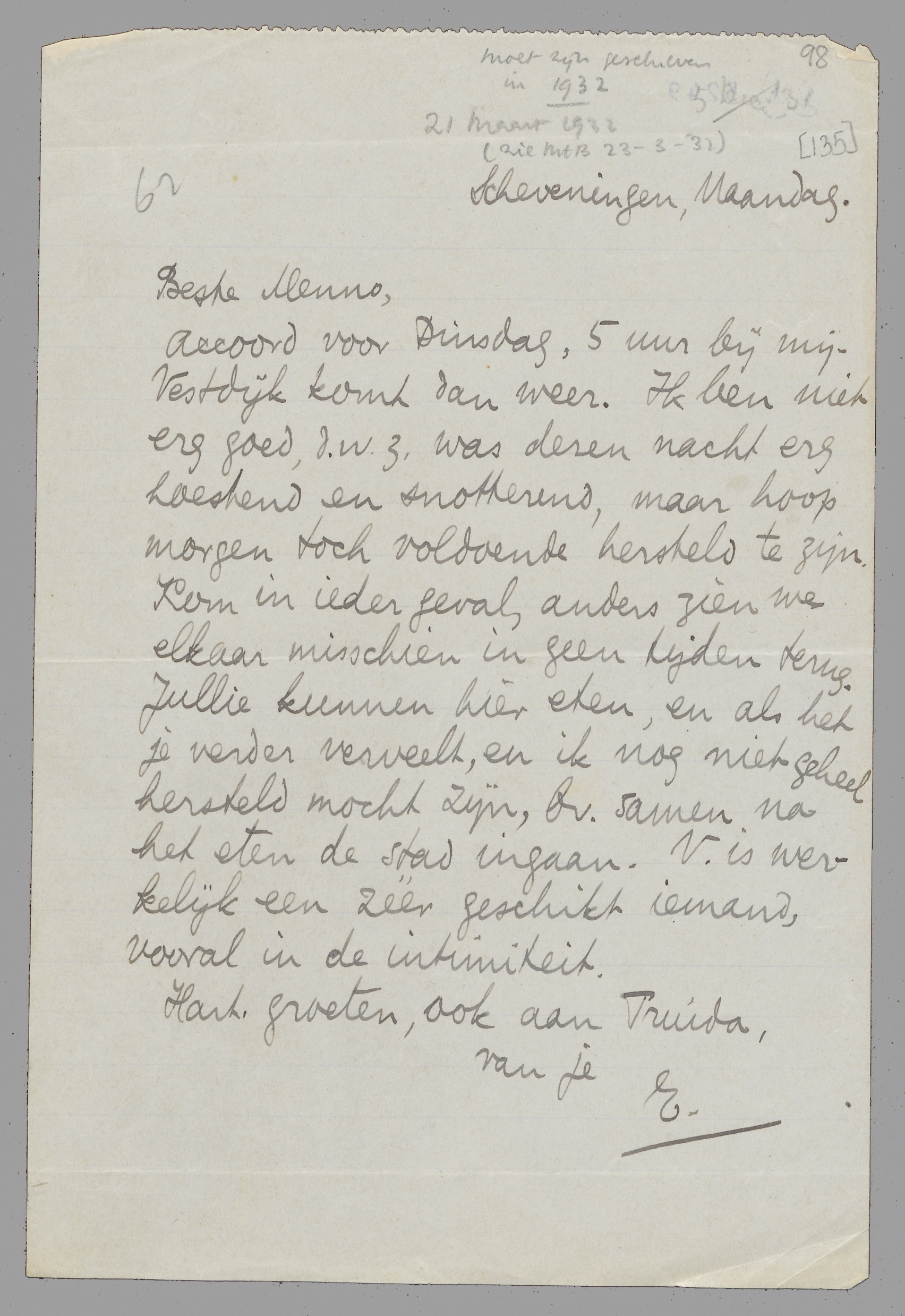 Accoord voor Dinsdag, 5 uur bij mij. Vestdijk komt dan weer. Ik ben niet erg goed, d.w.z. was dezen nacht erg hoestend en snotterend, maar hoop morgen toch voldoende hersteld te zijn. Kom in ieder geval, anders zien we elkaar misschien in geen tijden terug. Jullie kunnen hier eten, en als het je verder verveelt, en ik nog niet geheel hersteld mocht zijn, bv. samen na het eten de stad ingaan. V. is werkelijk een zéér geschikt iemand, vooral in de intimiteit.