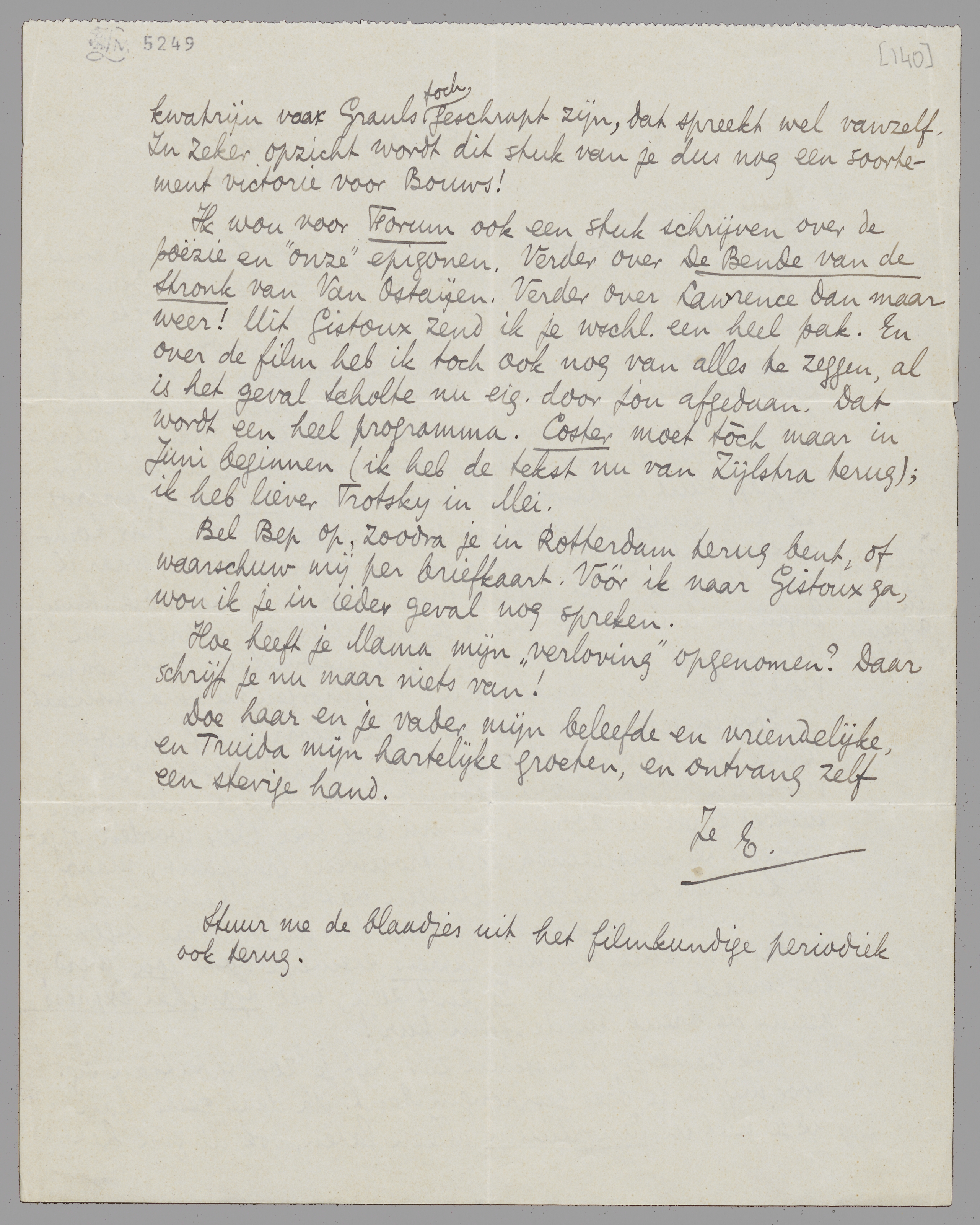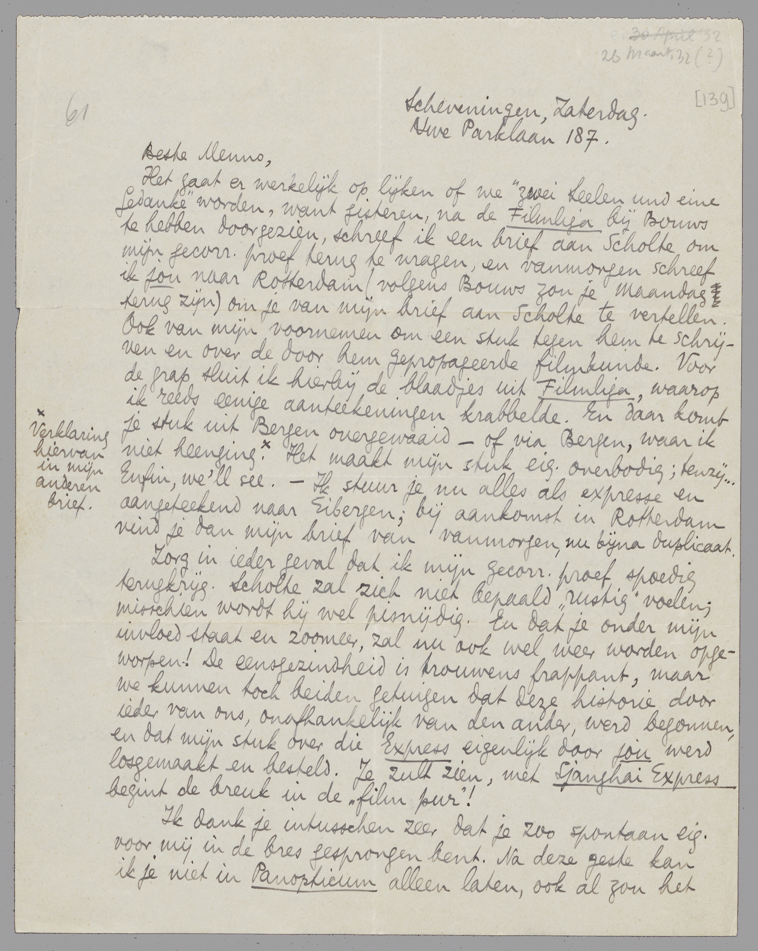 Zorg in ieder geval dat ik mijn gecorr. proef spoedig terug krijg. Scholte zal zich niet bepaald ‘rustig’ voelen; misschien wordt hij wel pisnijdig. En dat je onder mijn invloed staat en zoomeer, zal nu ook wel weer worden opgeworpen! De eensgezindheid is trouwens frappant, maar we kunnen toch beiden getuigen dat deze historie door ieder van ons, onafhankelijk van den ander, werd begonnen, en dat mijn stuk over die Express eigenlijk door jou werd losgemaakt en besteld. Je zult zien, met Sjanghai Express begint de breuk in de ‘film pur’!