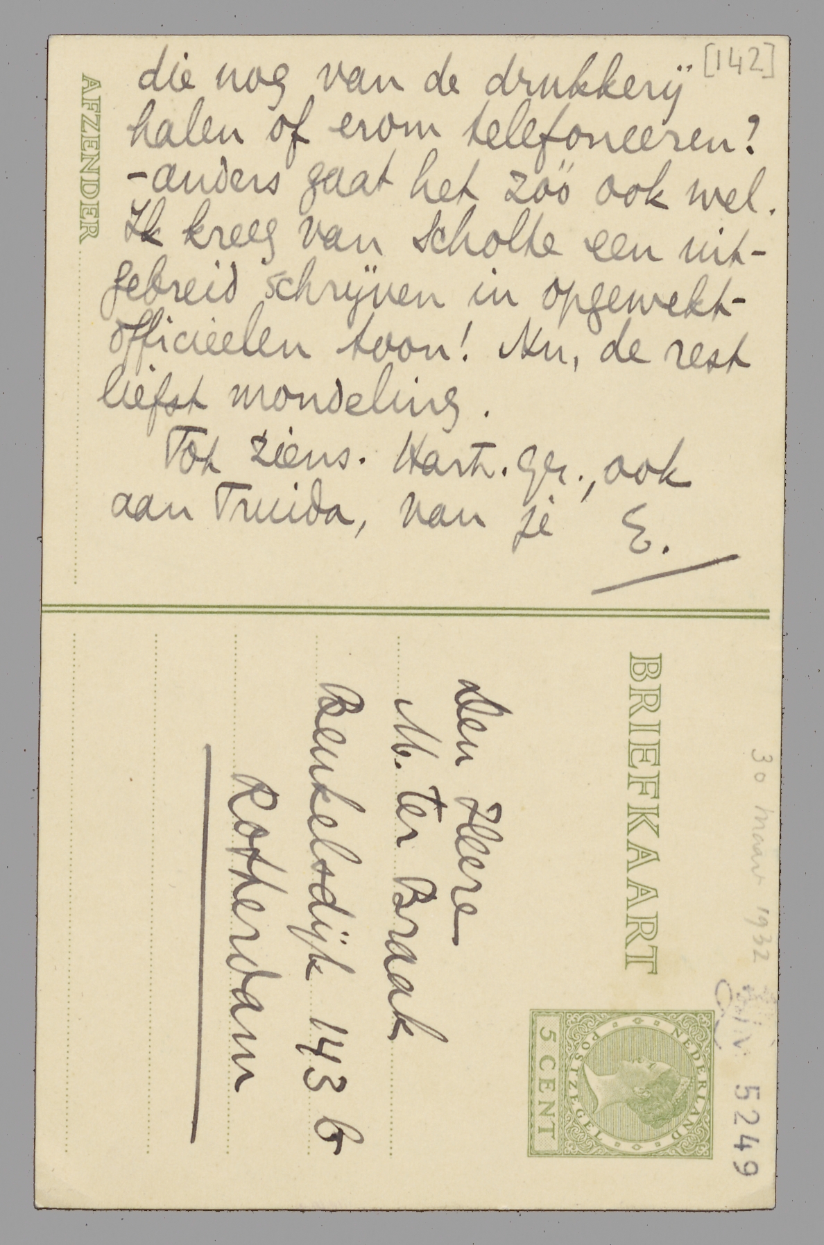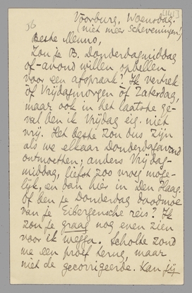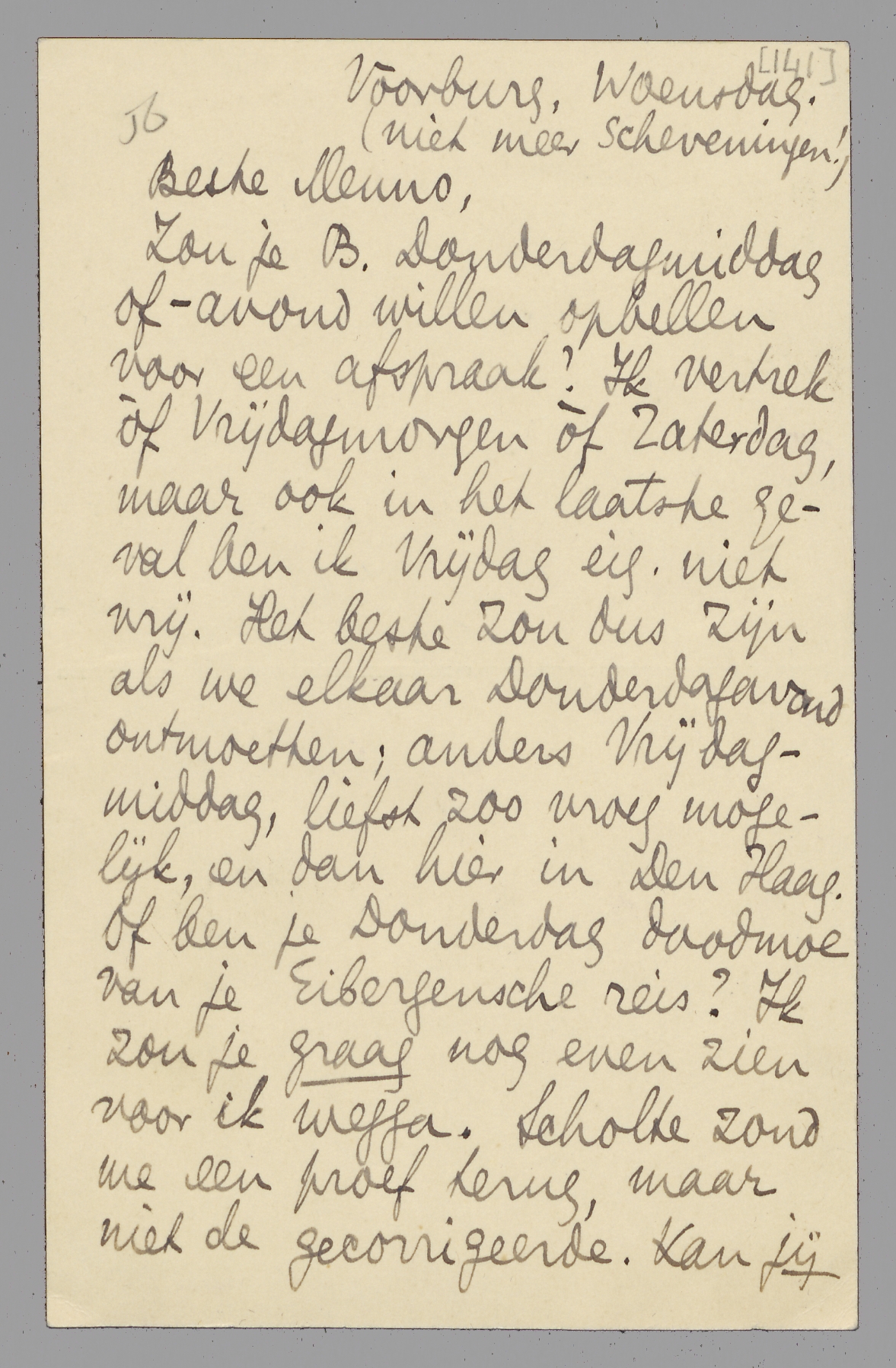 Zou je B. Donderdagmiddag of -avond willen opbellen voor een afspraak? Ik vertrek óf Vrijdagmorgen óf Zaterdag, maar ook in het laatste geval ben ik Vrijdag eig. niet vrij. Het beste zou dus zijn als we elkaar Donderdagavond ontmoetten; anders Vrijdagmiddag, liefst zoo vroeg mogelijk, en dan hier in Den Haag. Of ben je Donderdag doodmoe van je Eibergensche reis? Ik zou je graag nog even zien voor ik wegga. Scholte zond me een proef terug, maar niet de gecorrigeerde. Kan jij die nog van de drukkerij halen of erom telefoneeren? - anders gaat het zóó ook wel. Ik kreeg van Scholte een uitgebreid schrijven in opgewekt-officieelen toon! Nu, de rest liefst mondeling.