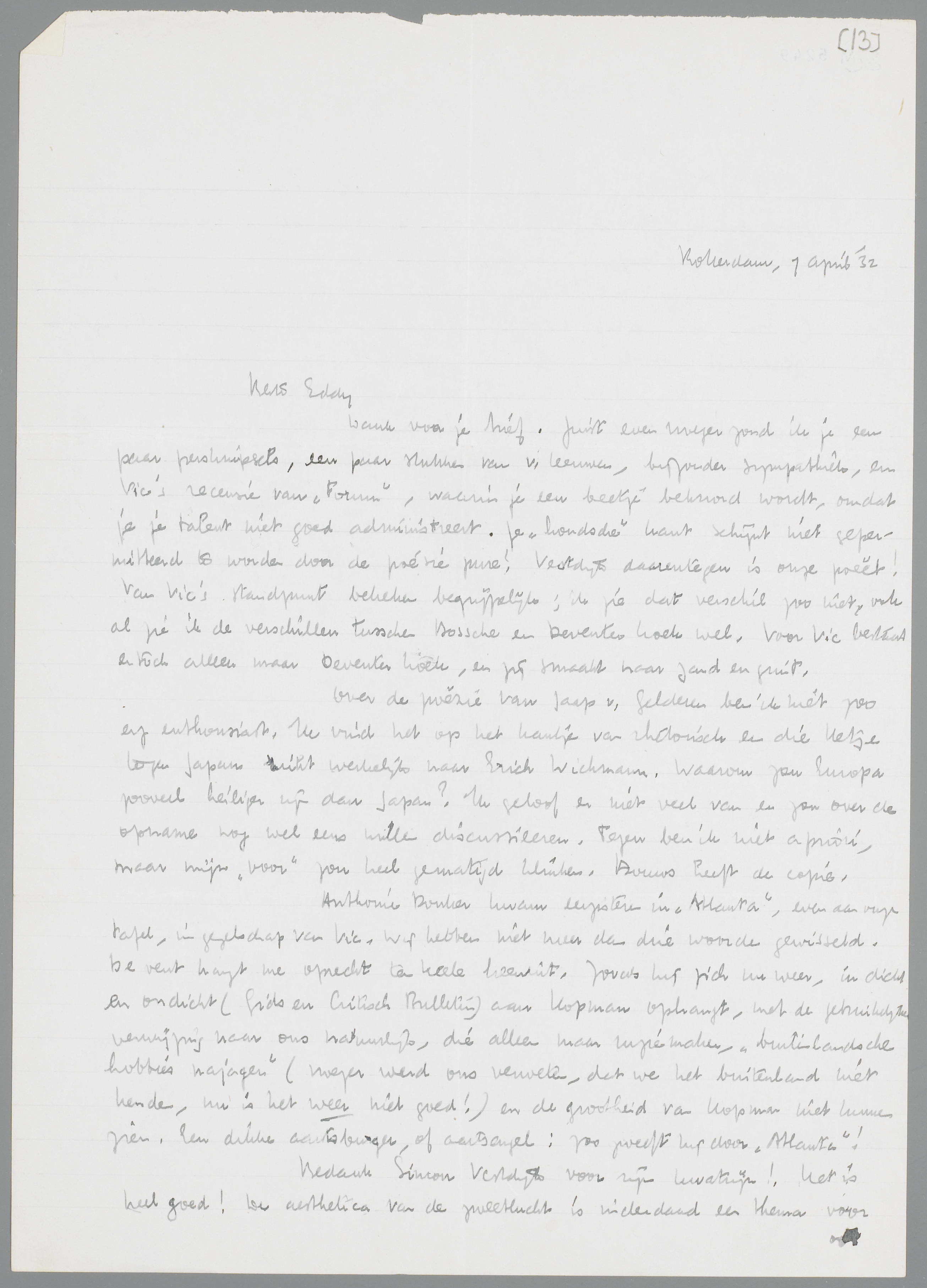 Dank voor je brief. Juist even vroeger zond ik je een paar persknipsels, een paar stukken van v. Leeuwen, bijzonder sympathiek, en Vic's recensie van Forum, waarin je een beetje beknord wordt, omdat je je talent niet goed administreert. Je ‘hondsche’ kant schijnt niet gepermitteerd te worden door de poésie pure! Vestdijk daarentegen is onze poëet! Van Vic's standpunt bekeken begrijpelijk; ik zie dat verschil zoo niet, ook al zie ik de verschillen tusschen Bossche en Deventer koek wel. Voor Vic bestaat er tóch alleen maar Deventer koek, en jij smaakt naar zand en grint.
