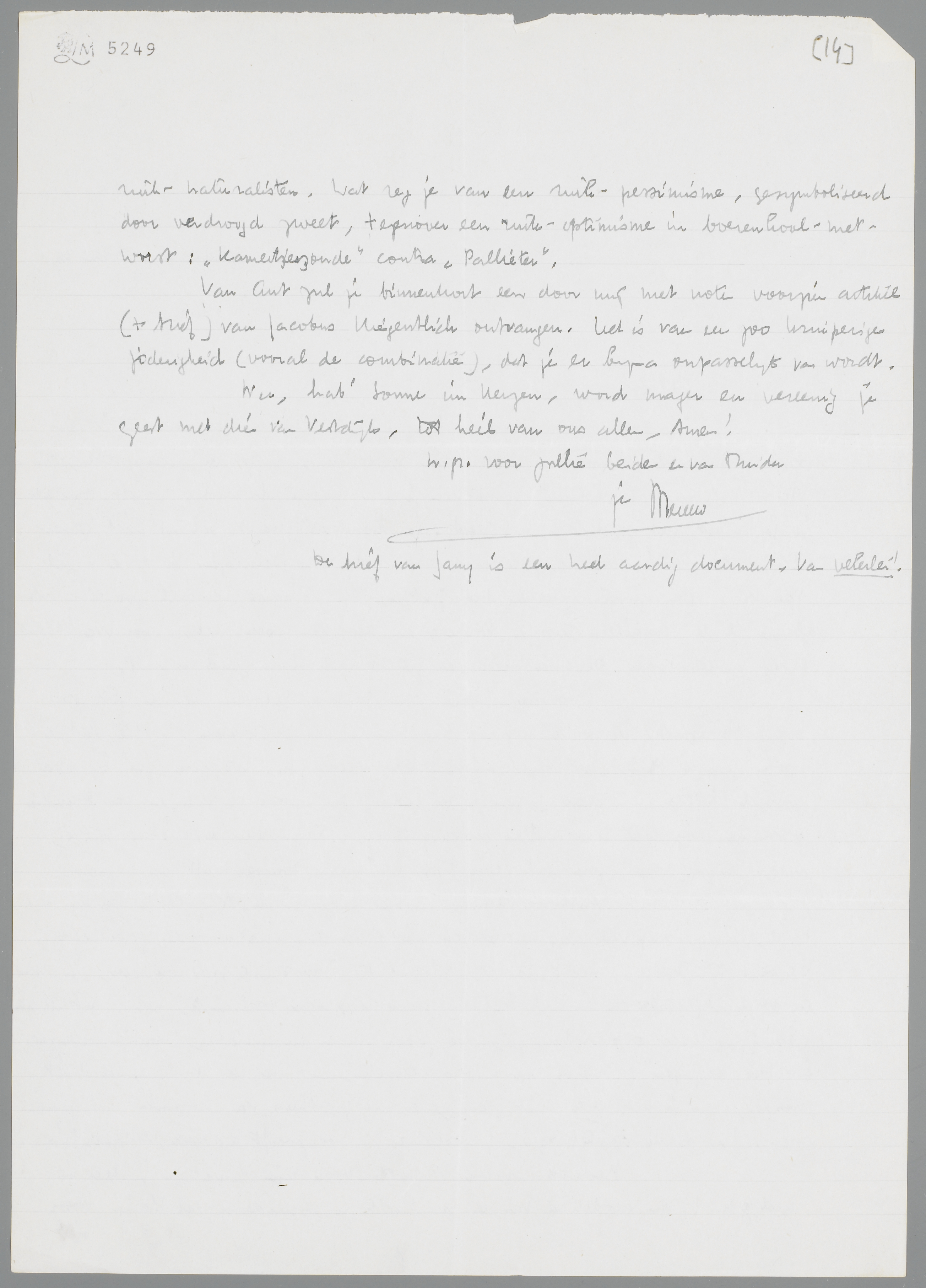 Over de poëzie van Jaap v. Gelderen ben ik niet zoo erg enthousiast. Ik vind het op het kantje van rhetorisch en die Hetze tegen Japan ruikt werkelijk naar Erich Wichmann. Waarom zou Europa zooveel heiliger zijn dan Japan? Ik geloof er niet veel van en zou over de opname nog wel eens willen discussieeren. Tegen ben ik niet a priori, maar mijn ‘voor’ zou heel gematigd klinken. Bouws heeft de copie.