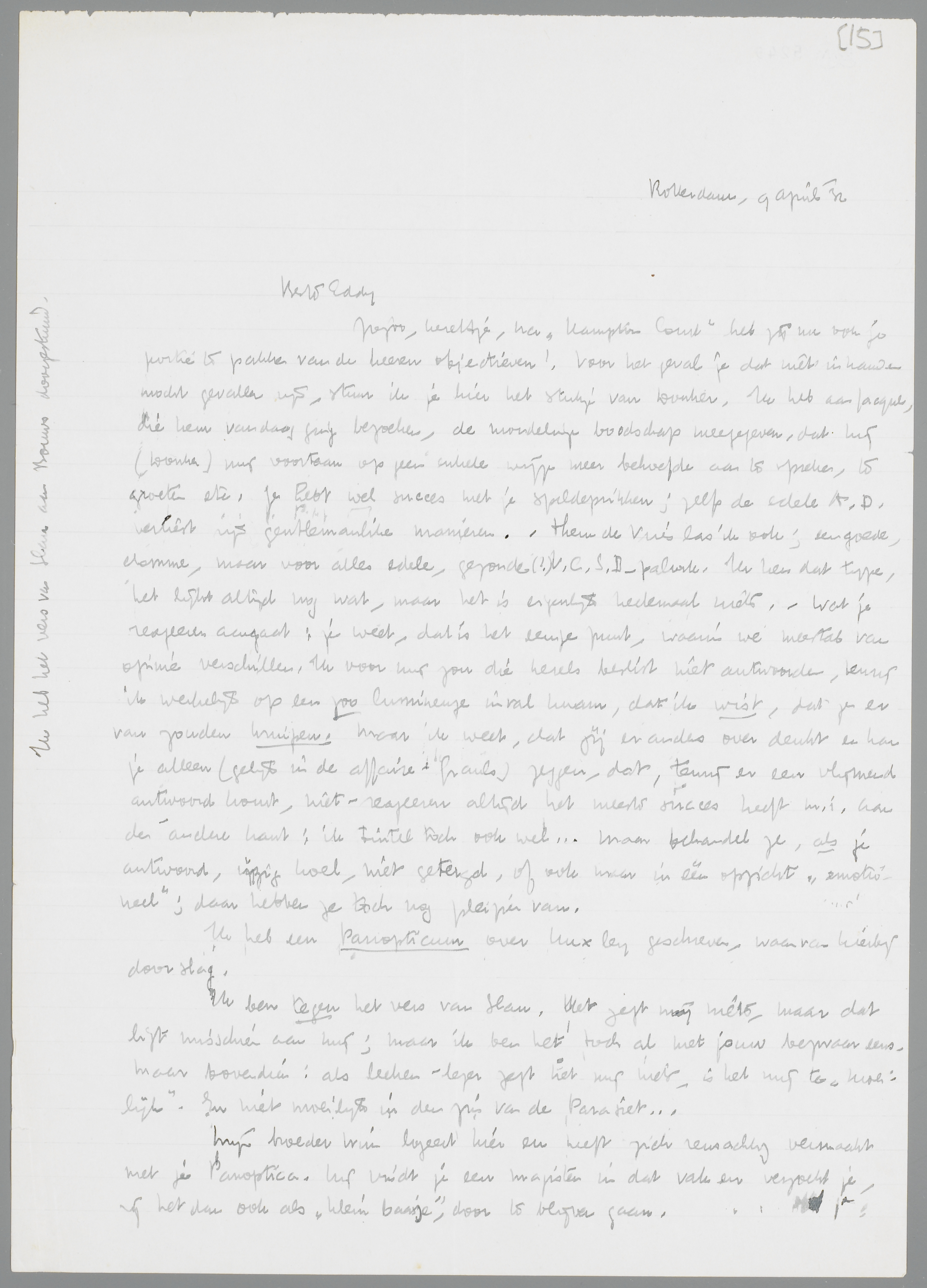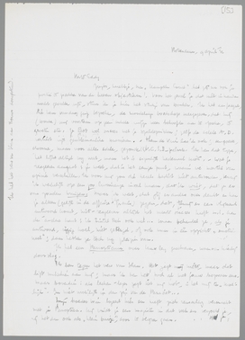 Ziezoo, kereltje, na Hampton Court heb jij nu ook je portie te pakken van de heeren objectieven! Voor het geval je dat niet in handen mocht gevallen zijn, stuur ik je hier het stukje van Donker. Ik heb aan Jacques, die hem vandaag ging bezoeken, de mondelinge boodschap meegegeven, dat hij (Donker) mij voortaan op geen enkele wijze meer behoefde aan te spreken, te groeten etc. Je hebt wel succes met je speldeprikken; zelfs de edele A.D. verliest zijn gentlemanlike manieren. Theun de Vries las ik ook; een goede, domme, maar voor alles edele, gezonde(!) V.C.S.B.-palurk. Ik ken dat type, het lijkt altijd nog wat, maar het is eigenlijk heelemaal niets. Wat je reageeren aangaat: je weet, dat is het eenige punt, waarin we meestal van opinie verschillen. Ik voor mij zou die kerels beslist niet antwoorden, tenzij ik werkelijk op een zoo lumineuze inval kwam, dat ik wist, dat ze er van zouden kruipen. Maar ik weet, dat jij er anders over denkt en kan je alleen (gelijk in de affaire-Grauls) zeggen, dat, tenzij er een vlijmend antwoord komt, niet-reageeren altijd het meeste succes heeft m.i. Aan de andere kant: ik tintel toch ook wel... maar behandel ze, als je antwoord, ijzig koel, niet getergd, of ook maar in één opzicht ‘emotioneel’; daar hebben ze toch nog pleizier van.