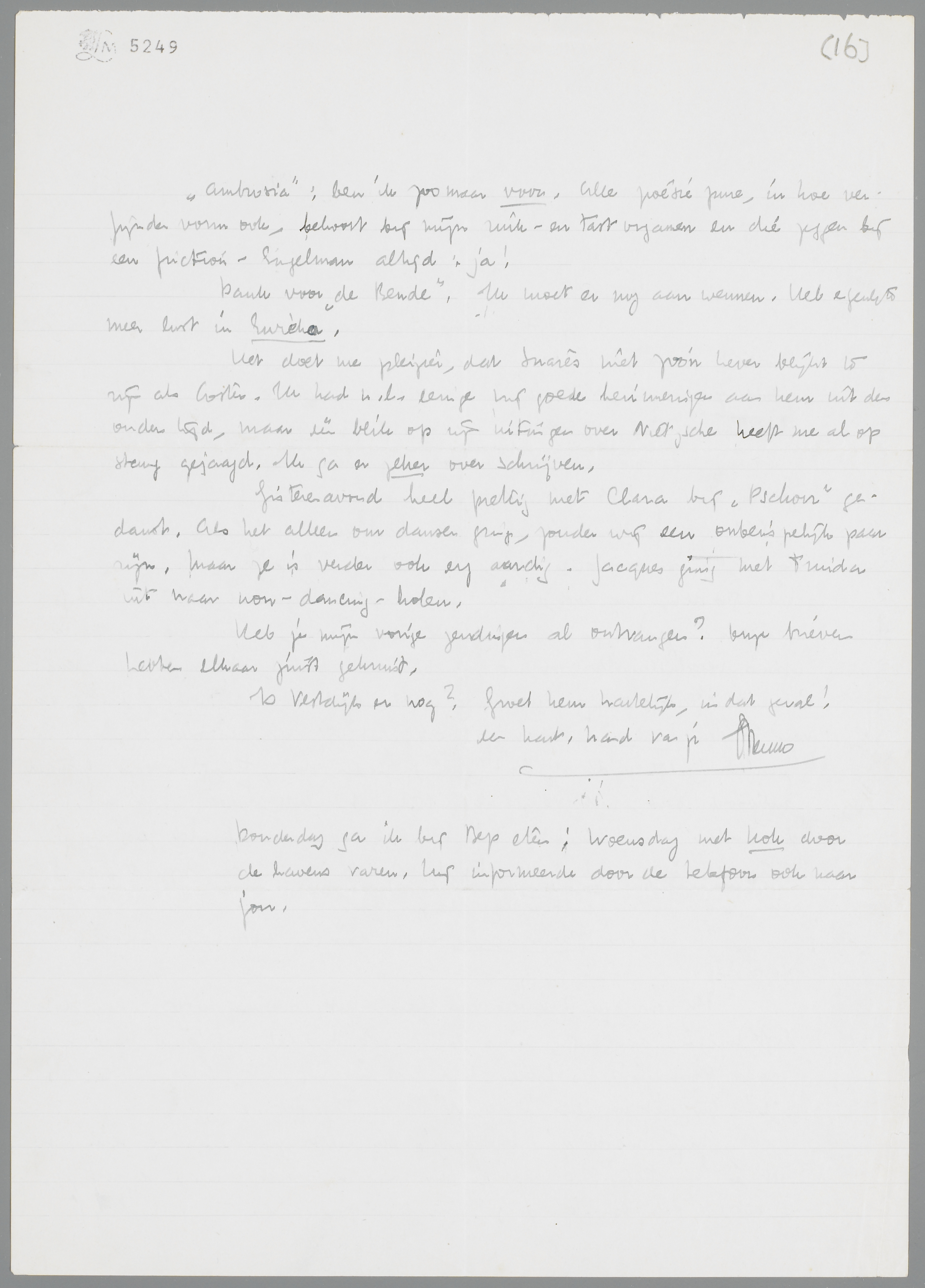 Het doet me pleizier, dat Suarès niet zoo'n kever blijkt te zijn als Coster. Ik had n.l. eenige vrij goede herinneringen aan hem uit den ouden tijd, maar één blik op zijn uitingen over Nietzsche heeft me al op stang gejaagd. Ik ga er zeker over schrijven. Gisterenavond heel prettig met Clara bij Pschorr gedanst. Als het alleen om dansen ging, zouden wij een onberispelijk paar zijn. Maar ze is verder ook erg aardig. Jacques ging met Truida uit naar non-dancing-holen.