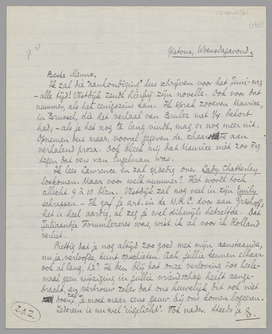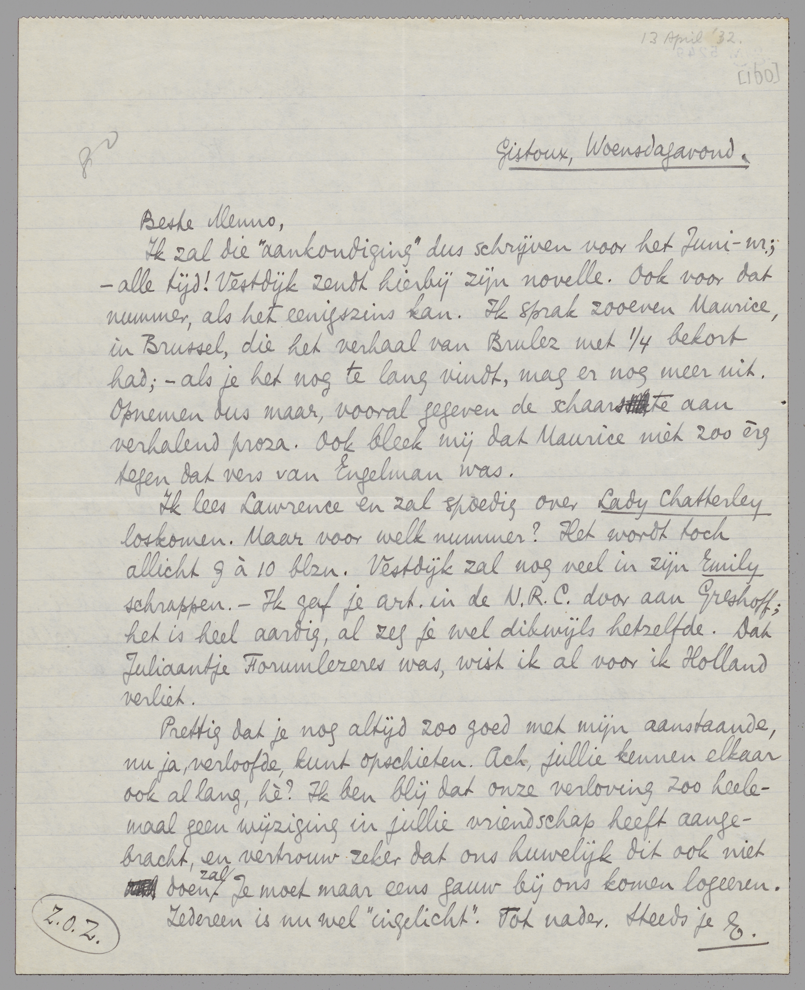 Ik zal die ‘aankondiging’ dus schrijven voor het Juni-nr.; - alle tijd! Vestdijk zendt hierbij zijn novelle. Ook voor dat nummer, als het eenigszins kan. Ik sprak zooeven Maurice, in Brussel, die het verhaal van Brulez met 1/4 bekort had; - als je het nog te lang vindt, mag er nog meer uit. Opnemen dus maar, vooral gegeven de schaarste aan verhalend proza. Ook bleek mij dat Maurice niet zoo èrg tegen dat vers van Engelman was.