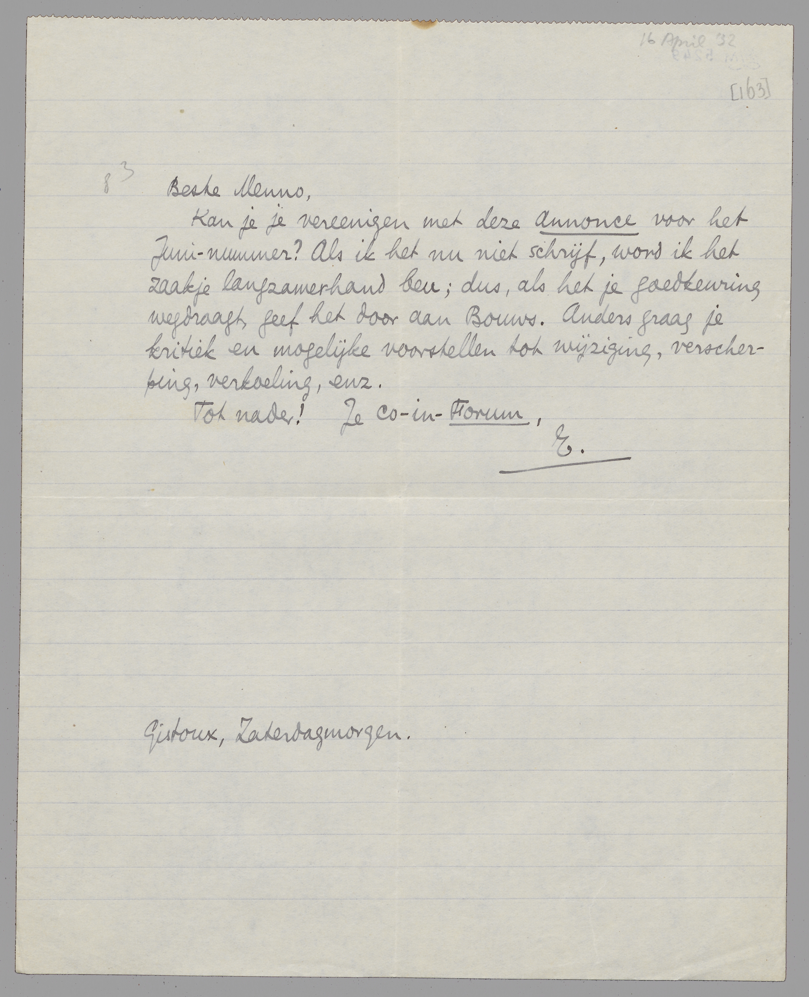 Kan je je vereenigen met deze Annonce voor het Juni-nummer? Als ik het nu niet schrijf, word ik het zaakje langzamerhand beu; dus, als het je goedkeuring wegdraagt, geef het door aan Bouws. Anders graag je kritiek en mogelijke voorstellen tot wijziging, verscherping, verkoeling, enz.
