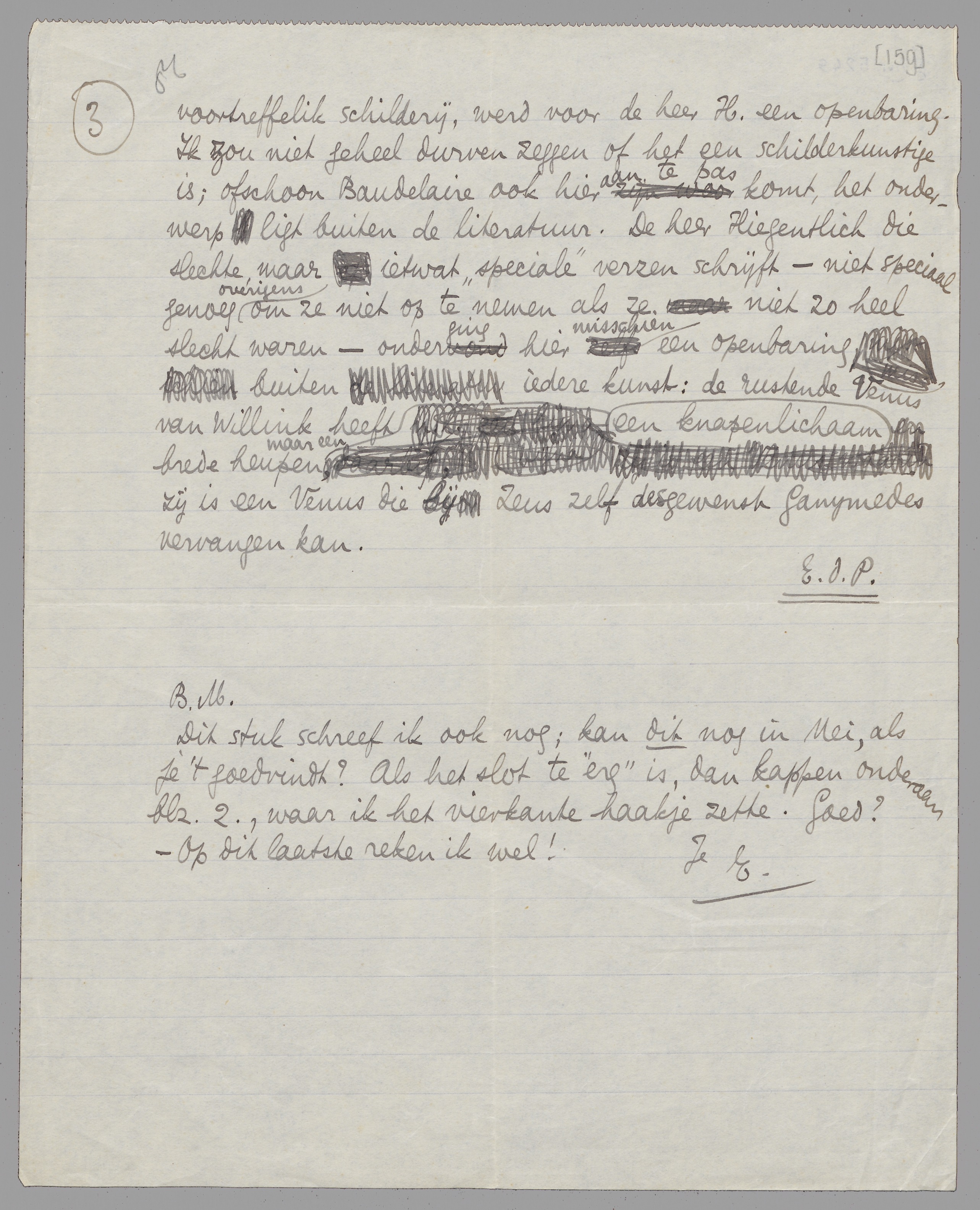 Dit stuk schreef ik ook nog; kan dit nog in Mei, als je 't goed vindt? Als het slot te ‘erg’ is, dan kappen onderaan blz. 2, waar ik het vierkante haakje zette. Goed? - Op dit laatste reken ik wel! Je E.