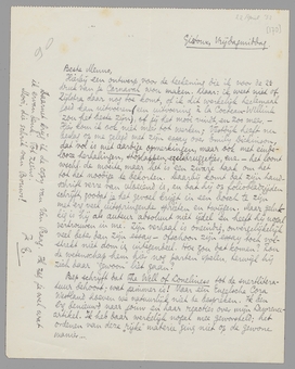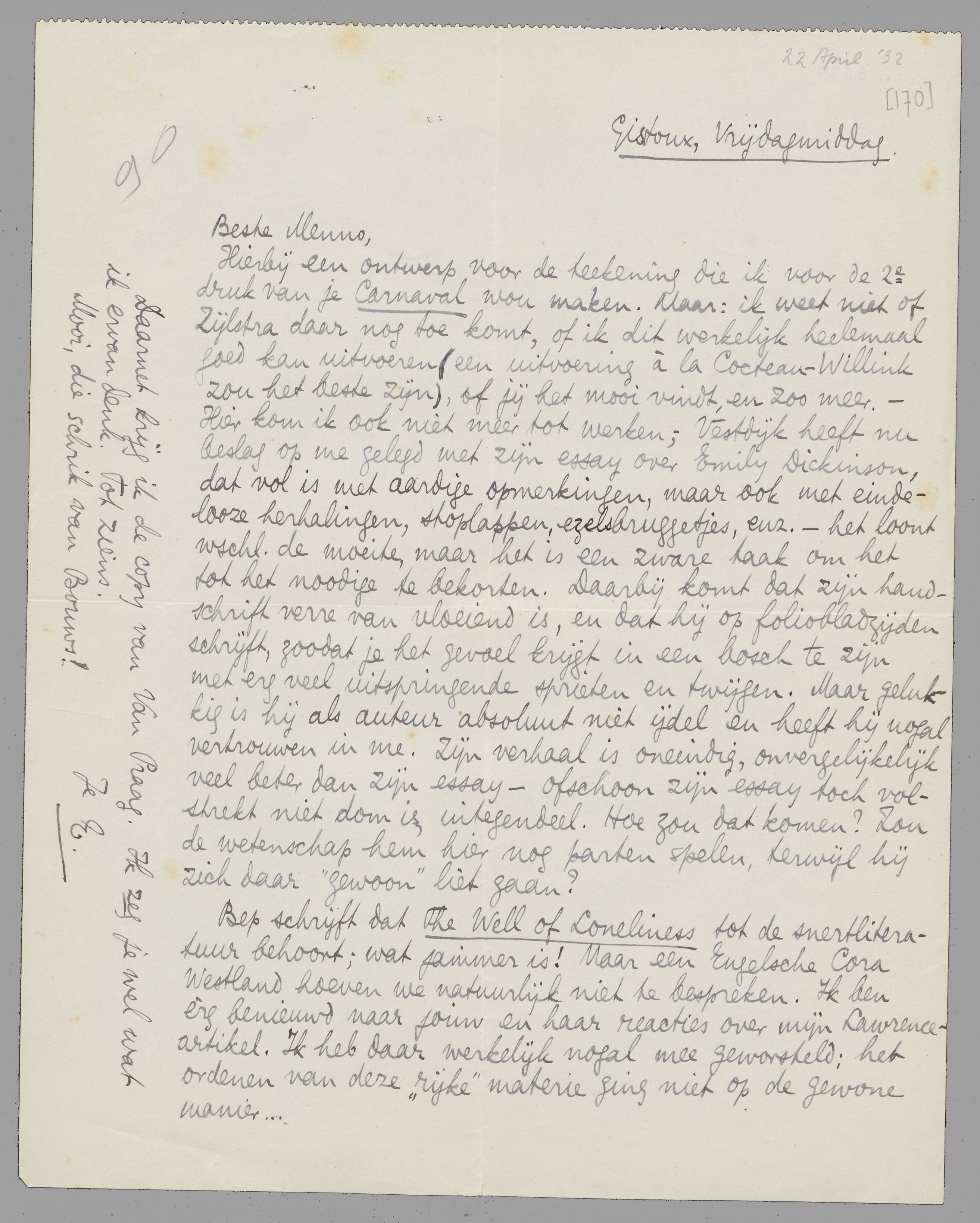 Hierbij een ontwerp voor de teekening die ik voor de 2e druk van je Carnaval wou maken. Maar: ik weet niet of Zijlstra daar nog toe komt, of ik dit werkelijk heelemaal goed kan uitvoeren (een uitvoering à la Cocteau-Willink zou het beste zijn), of jij het mooi vindt, en zoo meer. - Hier kom ik ook niet meer tot werken; Vestdijk heeft nu beslag op me gelegd met zijn essay over Emily Dickinson, dat vol is met aardige opmerkingen, maar ook met eindelooze herhalingen, stoplappen, ezelsbruggetjes, enz. - het loont wschl. de moeite, maar het is een zware taak om het tot het noodige te bekorten. Daarbij komt dat zijn handschrift verre van vloeiend is, en dat hij op foliobladzijden schrijft, zoodat je het gevoel krijgt in een bosch te zijn met erg veel uitspringende sprieten en twijgen. Maar gelukkig is hij als auteur absoluut niet ijdel en heeft hij nogal vertrouwen in me. Zijn verhaal is oneindig, onvergelijkelijk veel beter dan zijn essay - ofschoon zijn essay toch volstrekt niet dom is, integendeel. Hoe zou dat komen? Zou de wetenschap hem hier nog parten spelen, terwijl hij zich daar ‘gewoon’ liet gaan?