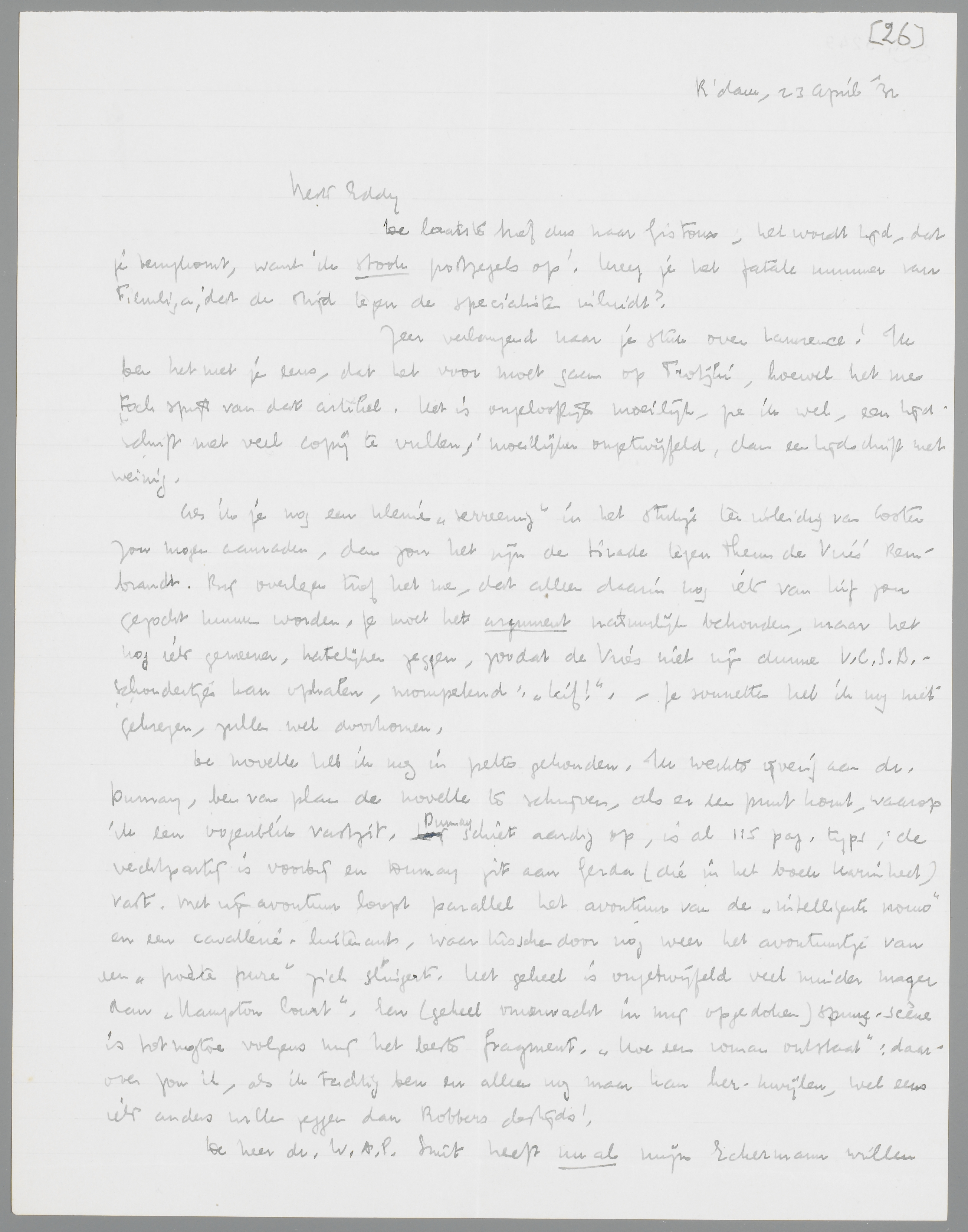 Zeer verlangend naar je stuk over Lawrence! Ik ben het met je eens, dat het voor moet gaan op Trotzki, hoewel het me toch spijt van dat artikel. Het is ongelooflijk moeilijk, zie ik wel, een tijdschrift met veel copij te vullen; moeilijker ongetwijfeld, dan een tijdschrift met weinig.