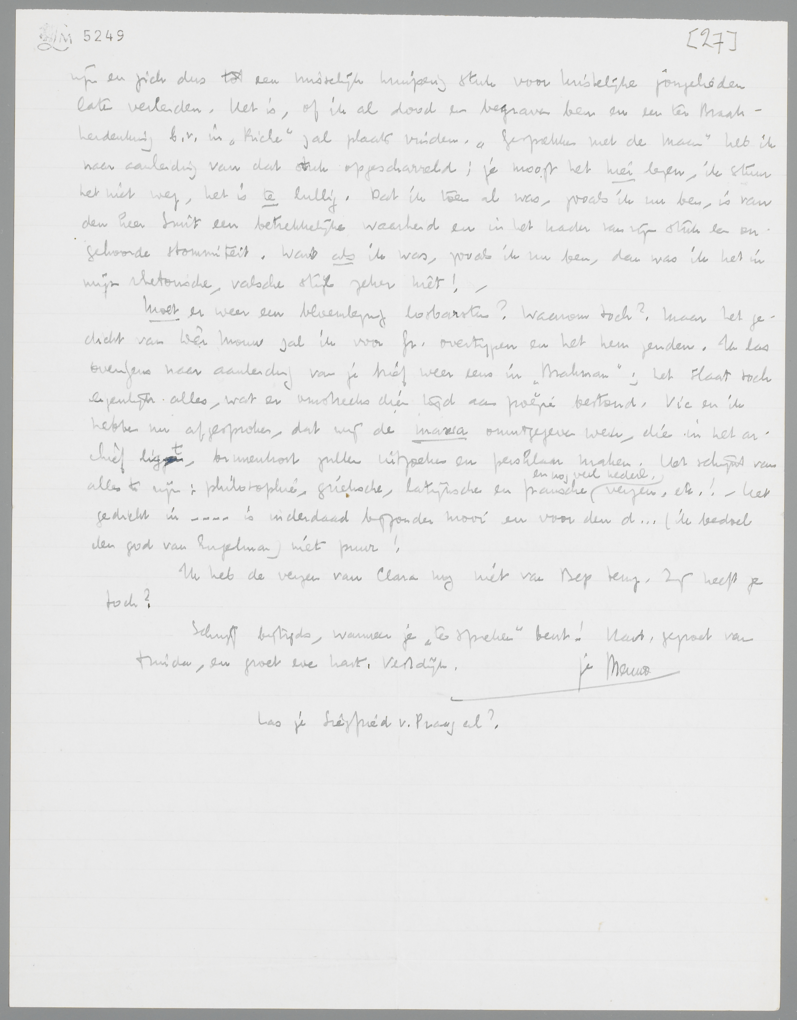 Moet er weer een bloemlezing losbarsten? Waarom toch? Maar het gedicht van Dèr Mouw zal ik voor Gr. overtypen en het hem zenden. Ik las overigens naar aanleiding van je brief weer eens in Brahman; het slaat toch eigenlijk alles, wat er omstreeks dien tijd aan poëzie bestond. Vic en ik hebben nu afgesproken, dat wij de massa onuitgegeven werk, die in het archief ligt, binnenkort zullen uitzoeken en persklaar maken. Het schijnt van alles te zijn: philosophie, grieksche, latijnsche en fransche en nog veel nederl. verzen, etc.! - Het gedicht in... is inderdaad bijzonder mooi en voor den d... (ik bedoel den god van Engelman) niet puur!