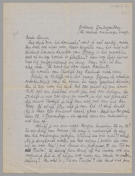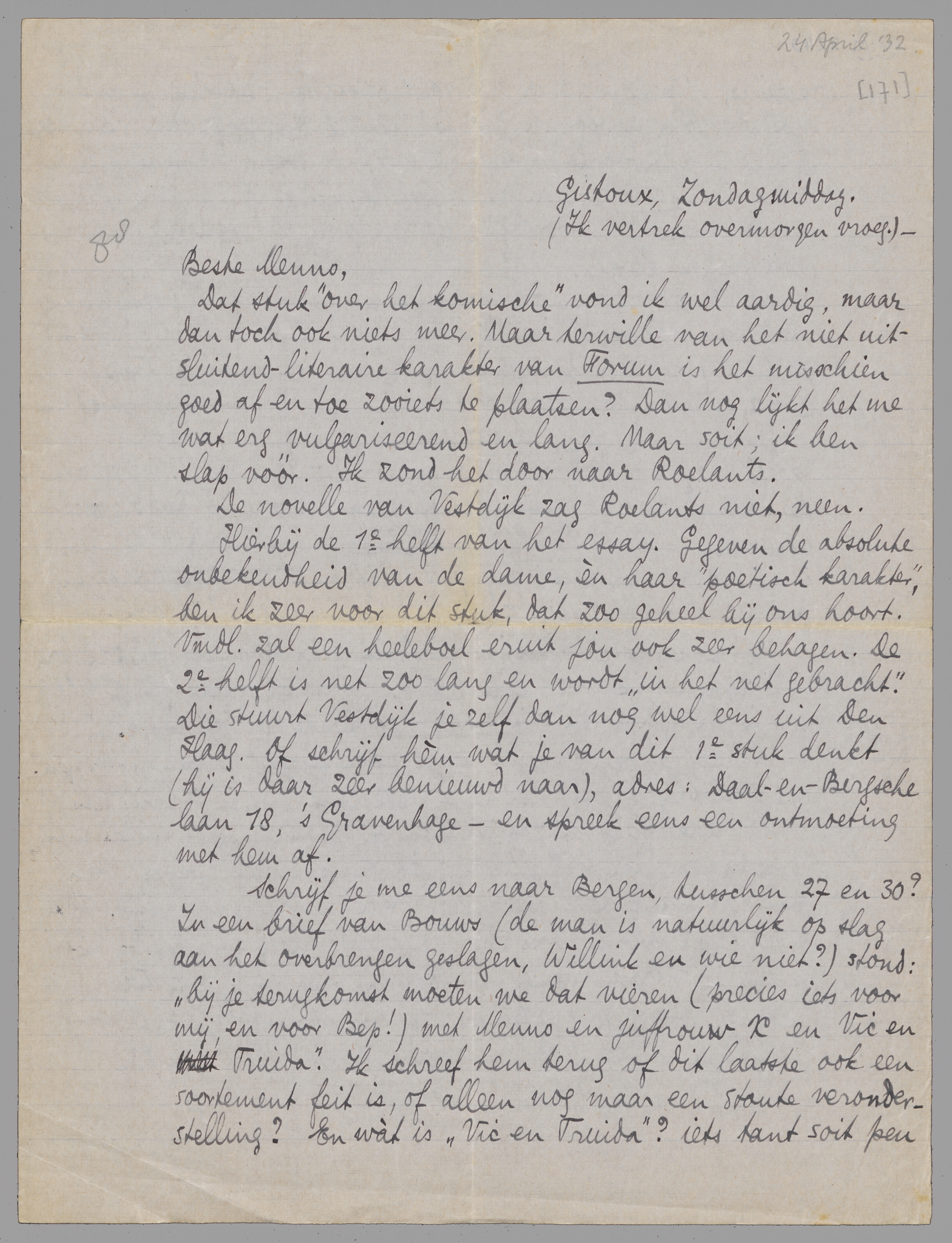 Hierbij de 1e helft van het essay. Gegeven de absolute onbekendheid van de dame, èn haar ‘poetisch karakter’, ben ik zeer voor dit stuk, dat zoo geheel bij ons hoort. Vmdl. zal een heeleboel eruit jou ook zeer behagen. De 2e helft is net zoo lang en wordt ‘in het net gebracht’. Die stuurt Vestdijk je zelf dan nog wel eens uit den Haag. Of schrijf hèm wat je van dit 1e stuk denkt (hij is daar zeer benieuwd naar), adres: Daal-en-Bergschelaan 18, 'sGravenhage - en spreek eens een ontmoeting met hem af.