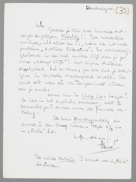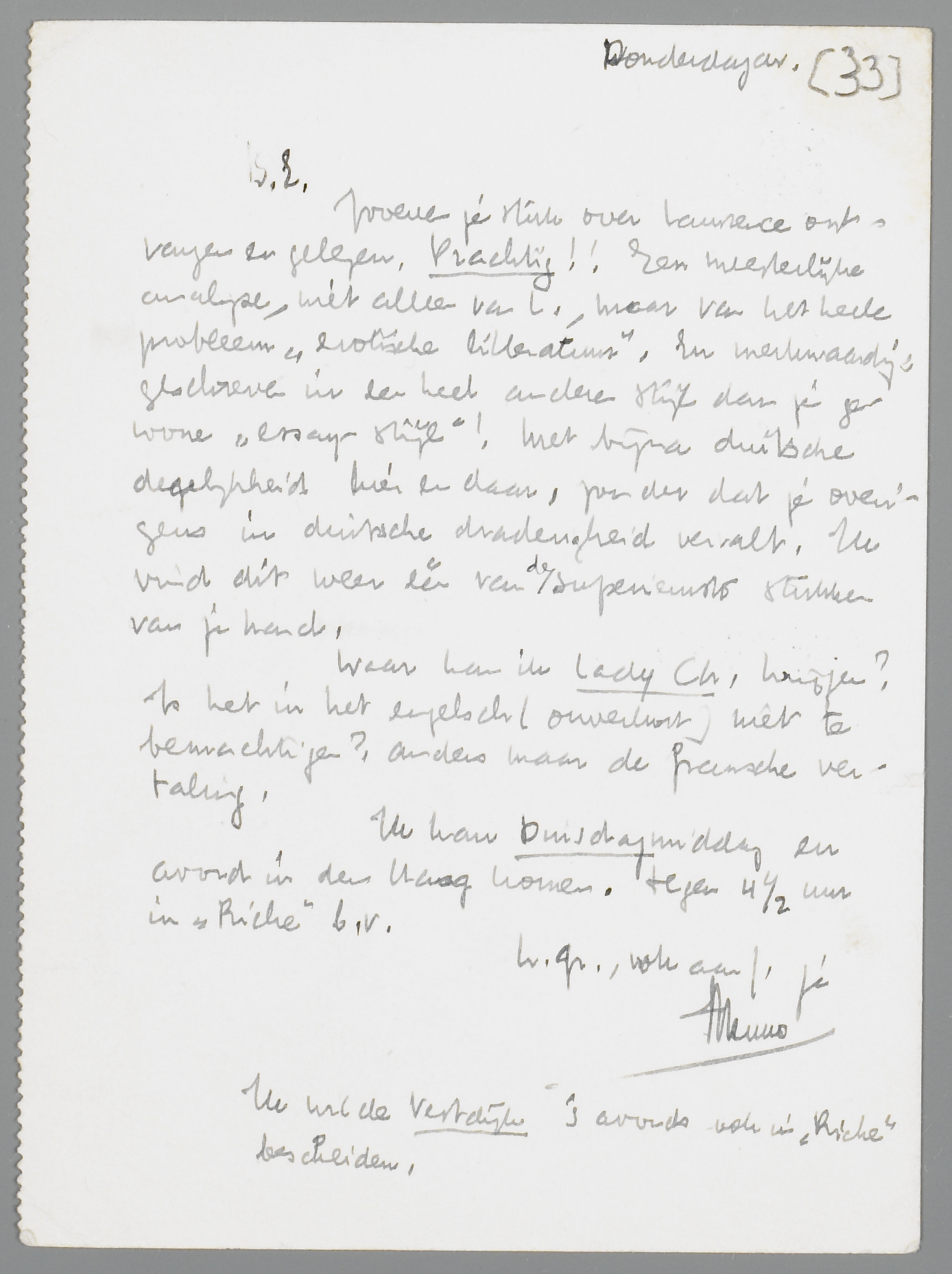 Zooeven je stuk over Lawrence ontvangen en gelezen. Prachtig!! Een meesterlijke analyse, niet alleen van L., maar van het heele probleem ‘erotische litteratuur’. En merkwaardig: geschreven in een heel andere stijl dan je gewone ‘essay-stijl’! Met bijna duitsche degelijkheid hier en daar, zonder dat je overigens in duitsche draderigheid vervalt. Ik vind dit weer één van de superieurste stukken van je hand.