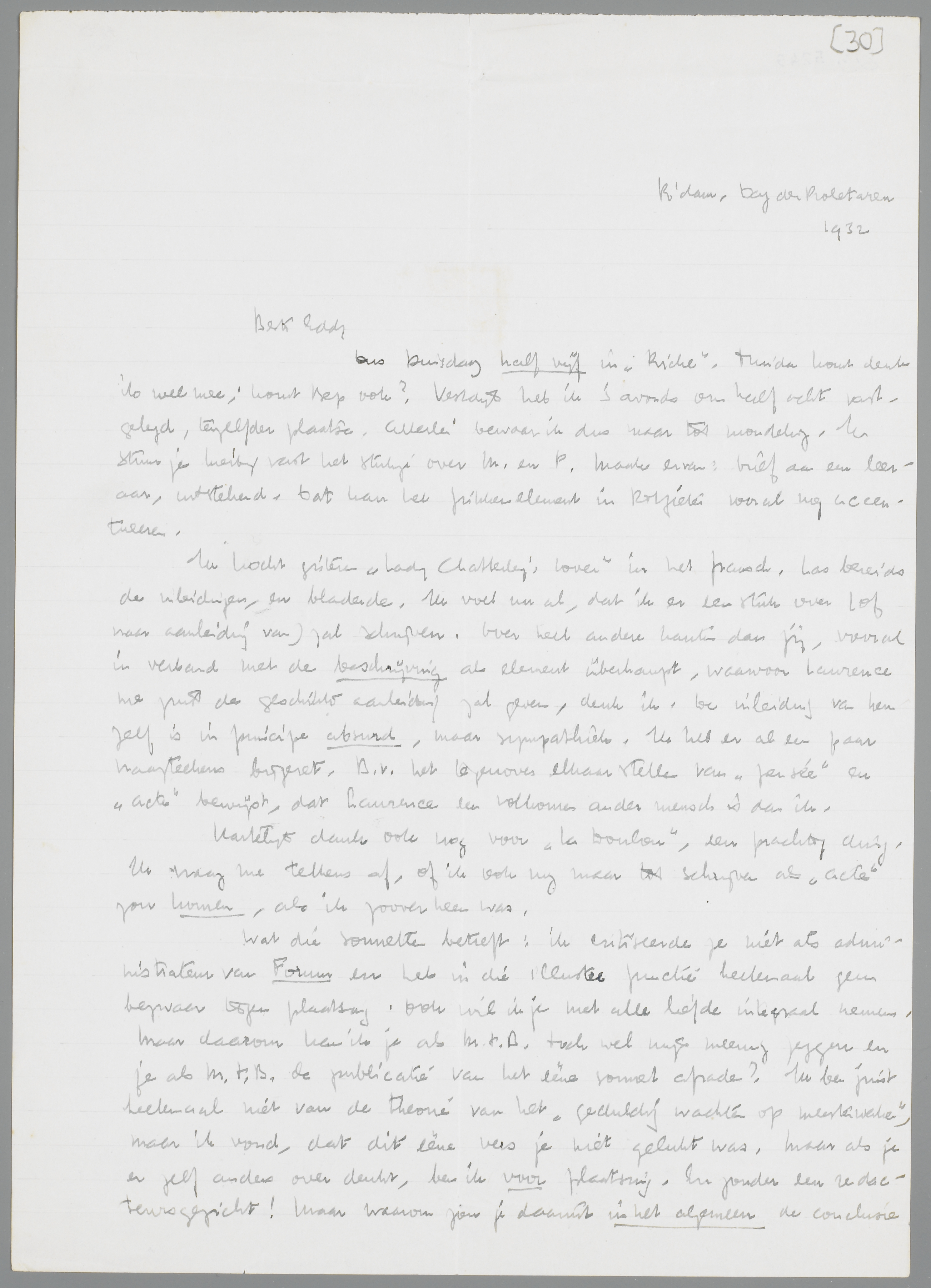Ik kocht gisteren Lady Chatterley's Lover in het fransch. Las bereids de inleidingen, en bladerde. Ik voel nu al, dat ik er een stuk over (of naar aanleiding van) zal schrijven. Over heel andere kanten dan jij, vooral in verband met de beschrijving als element überhaupt, waarvoor Lawrence me juist de geschikte aanleiding zal geven, denk ik. De inleiding van hemzelf is in principe absurd, maar sympathiek. Ik heb er al een paar vraagteekens bijgezet. B.v. het tegenover elkaar stellen van ‘pensée’ en ‘acte’ bewijst, dat Lawrence een volkomen ander mens is dan ik.