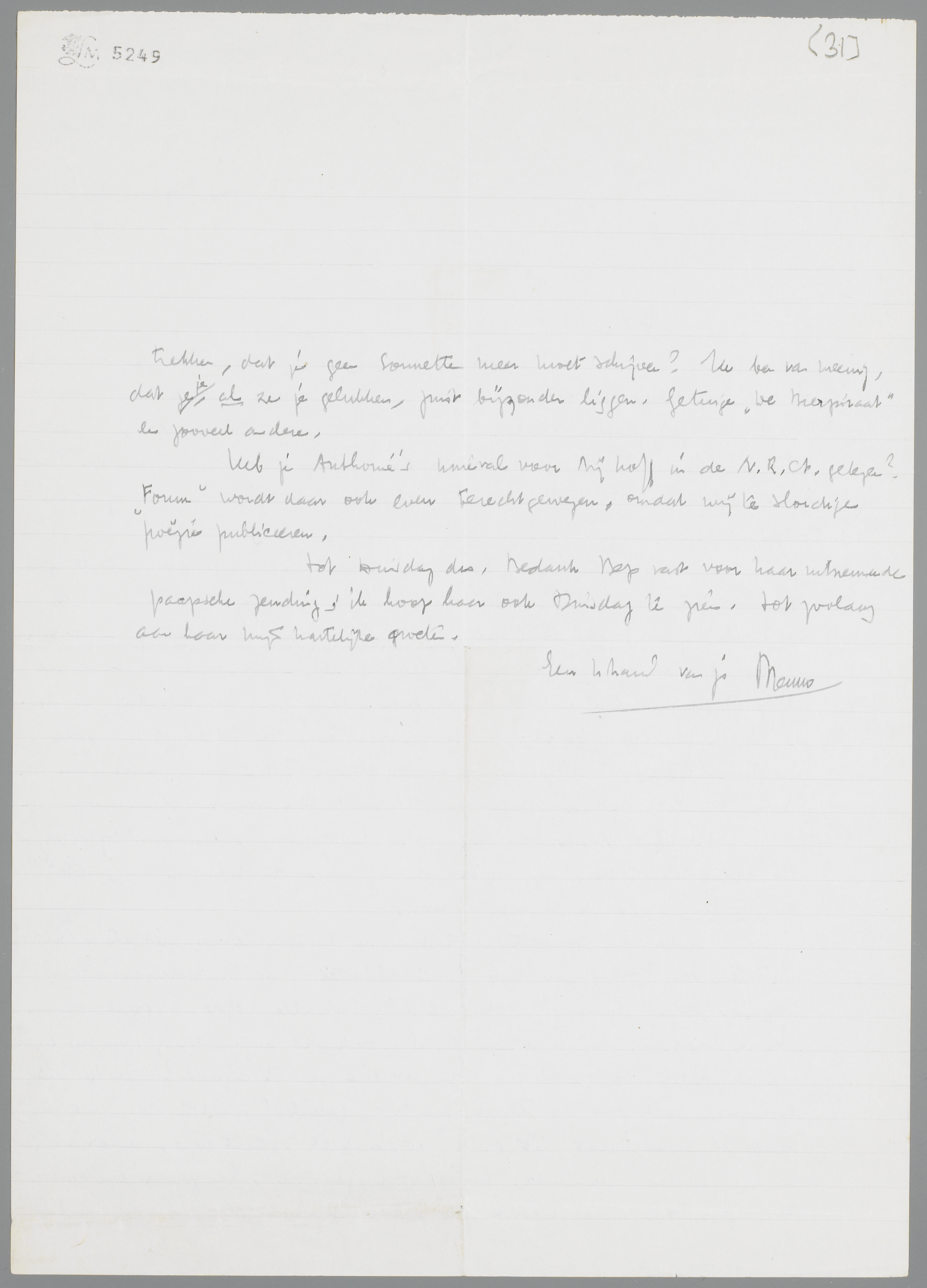 Dus Dinsdag half vijf in Riche. Truida komt denk ik wel mee; komt Bep ook? Vestdijk heb ik 's avonds om half acht vastgelegd, terzelfder plaatse. Allerlei bewaar ik dus maar tot mondeling. Ik stuur je hierbij vast het stukje over M. en P. Maak ervan: brief aan een leeraar, uitstekend. Dat kan het frikkenelement in Potgieter vooral nog accentueeren.
