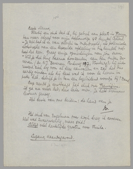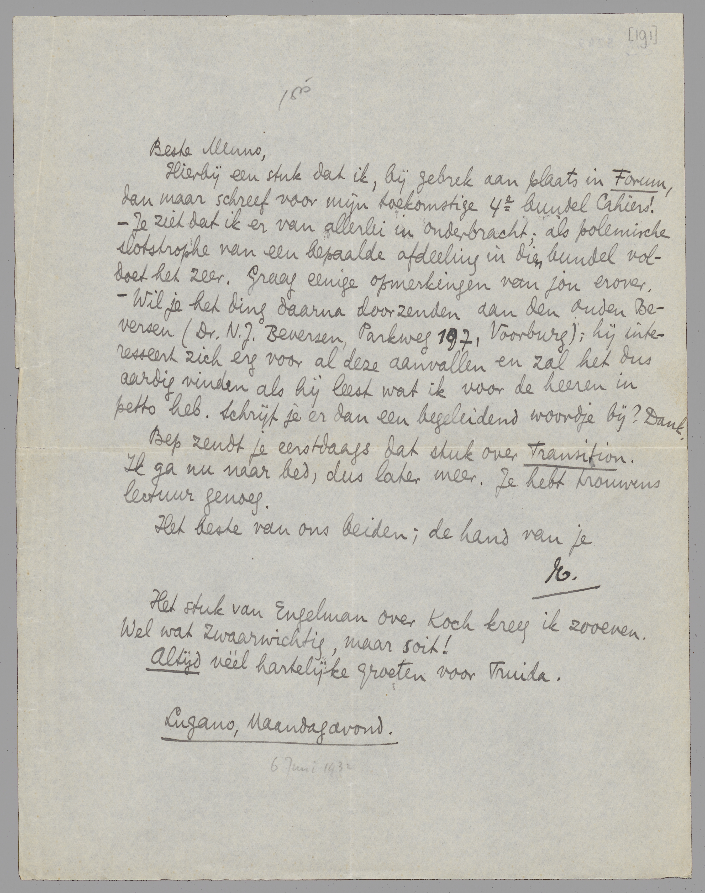 Hierbij een stuk dat ik, bij gebrek aan plaats in Forum, dan maar schreef voor mijn toekomstige 4e bundel Cahiers! - Je ziet dat ik er van allerlei in onderbracht; als polemische slotstrophe van een bepaalde afdeeling in dien bundel voldoet het zeer. Graag eenige opmerkingen van jou erover. - Wil je het ding daarna doorzenden aan den ouden Beversen (Dr. N.J. Beversen, Parkweg 197, Voorburg); hij interesseert zich erg voor al deze aanvallen en zal het dus aardig vinden als hij leest wat ik voor de heeren in petto heb. Schrijf je er dan een begeleidend woordje bij? Dank.