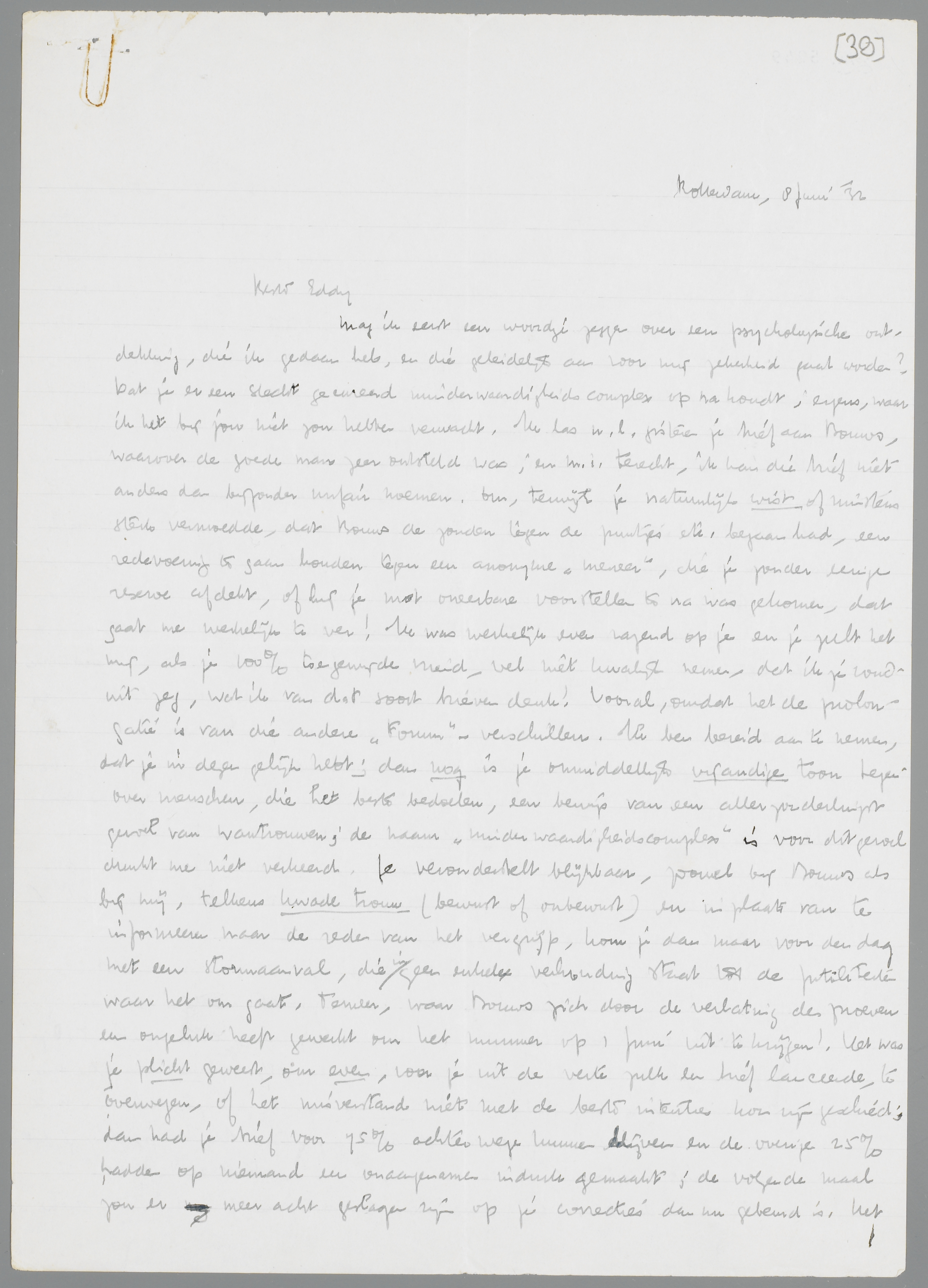 Mag ik eerst een woordje zeggen over een psychologische ontdekking, die ik gedaan heb, en die geleidelijk aan voor mij zekerheid gaat worden? Dat je er een slecht gecureerd minderwaardigheidscomplex op na houdt; ergens, waar ik het bij jou niet zou hebben verwacht. Ik las n.l. gisteren je brief aan Bouws, waarover de goede man zeer ontsteld was; en m.i. terecht, ik kan die brief niet anders dan bijzonder unfair noemen. Om, terwijl je natuurlijk wist of minstens sterk vermoedde, dat Bouws de zonden tegen de puntjes etc. begaan had, een redevoering te gaan houden tegen een anonyme ‘meneer’, die je zonder eenige reserve afdekt, of hij je met oneerbare voorstellen te na was gekomen, dat gaat me werkelijk te ver! Ik was werkelijk even razend op je en je zult het mij, als je 100% toegewijde vriend, wel niet kwalijk nemen, dat ik je ronduit zeg, wat ik van dat soort brieven denk! Vooral, omdat het de prolongatie is van die andere Forum-verschillen. Ik ben bereid aan te nemen, dat je in dezen gelijk hebt; dan nog is je onmiddellijk vijandige toon tegenover menschen, die het beste bedoelen, een bewijs van een allerzonderlingst gevoel van wantrouwen; de naam ‘minderwaardigheidscomplex’ is voor dit gevoel dunkt me niet verkeerd. Je veronderstelt blijkbaar, zoowel bij Bouws als bij mij, telkens kwade trouw (bewust of onbewust) en in plaats van te informeeren naar de reden van het vergrijp, kom je dan maar voor den dag met een stormaanval, die in geen enkele verhouding staat tot de futiliteiten waar het om gaat. Temeer, waar Bouws zich door de verlating der proeven een ongeluk heeft gewerkt om het nummer op 1 Juni uit te krijgen! Het was je plicht geweest, om even, voor je uit de verte zulk een brief lanceerde, te overwegen, of het misverstand niet met de beste intenties kon zijn geschied; dan had je brief voor 75% achterwege kunnen blijven en de overige 25% hadden op niemand een onaangename indruk gemaakt; de volgende maal zou er meer acht geslagen zijn op je correcties dan nu gebeurd is. Het is natuurlijk onprettig, als je verwaarloosde correctie ontdekt, maar het is belachelijk, om daaruit maar aanstonds achterdochtig ‘verguizing’ of ‘minachting’ te construeeren. Ik kan me dit niet anders verklaren, dan uit een gevoel van minderwaardigheid, dat zich bij je heeft vastgezet en zich nu zelfs tegen je beste vrienden afreageert. Precies hetzelfde met die Panopticum-futiliteiten, en met de critiek, die ik destijds op je beide sonnetten gaf! Onmiddellijk voel je je geprikkeld, verwaarloosd, beleedigd, geattaqueerd, god weet wat meer, en het resultaat is telkens een brief, waarvan de ontvanger de vijandschap kwetst. Ik heb niets tegen de grootste openhartigheid, maar een fulminatie als tegen den ‘meneer’ van Bouws is een kinderachtigheid. ‘Ik ben nog nooit zoo misselijk behandeld’, schrijf je mij n.b.! Dan heb je, als het je ernst is, niet veel misselijks ondervonden! Maar daarom gaat het niet eens: alleen al, als je veronderstelt, dat Bouws en ik, die de proeven in laatste instantie hebben nagekeken, je met opzet misselijk willen behandelen, ben je er naast, en geef je er blijk van iets te veronderstellen (a priori!), dat je desnoods bij Dirk Coster kunt aannemen, maar niet bij mij. Je zakelijke verzoek: om de proeven van Coster tijdig te ontvangen, is volkomen billijk en er zal voor gezorgd worden ook; maar waarom dit verzoek met een serie verdachtmakingen gepaard moet gaan, begrijp ik niet. Van jou tenminste niet. En de eenige weg, die me over blijft, is, het voor mezelf te verklaren. Heeft de botte tegenstand, die de hollandsche Theun's en Thony's bieden, je werkelijk toch meer gedaan, dan ik dacht? Of zit het dieper, en stamt dit gevoel uit een veel vroeger tijd? Het zou me interesseeren, dat te weten.