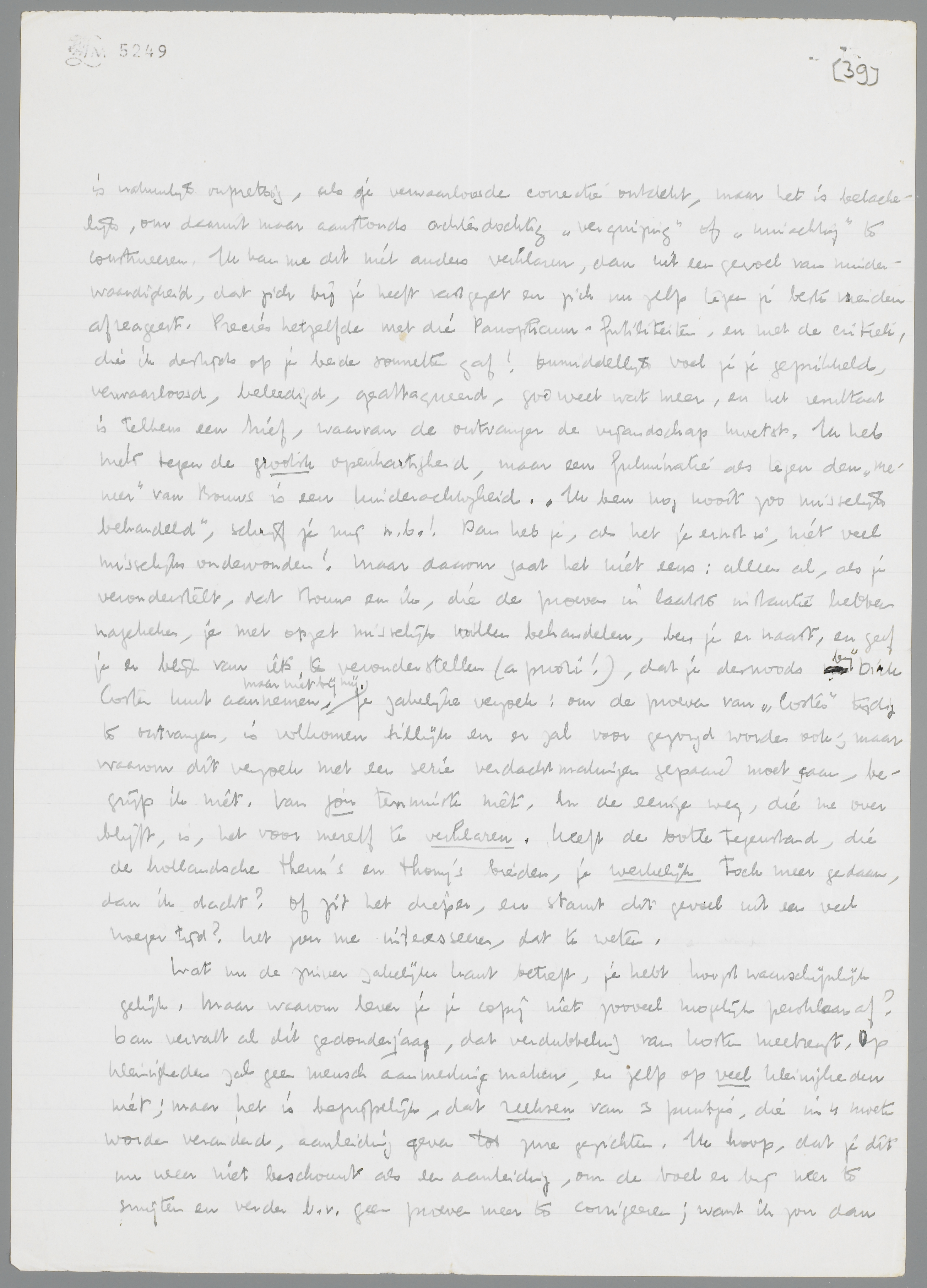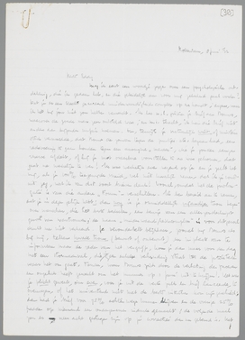 Wat nu de zuiver zakelijke kant betreft, je hebt hoogstwaarschijnlijk gelijk. Maar waarom lever je je copij niet zooveel mogelijk persklaar af? Dan vervalt al dit gedonderjaag, dat verdubbeling van kosten meebrengt. Op kleinigheden zal geen mensch aanmerking maken, en zelfs op veel kleinigheden niet; maar het is begrijpelijk, dat reeksen van 3 puntjes, die in 4 moeten worden veranderd, aanleiding geven tot zure gezichten. Ik hoop, dat je dit nu weer niet beschouwt als een aanleiding, om de boel er bij neer te smijten en verder b.v. geen proeven meer te corrigeeren; want ik zou dan werkelijk het gevoel krijgen, dat ik een eenvoudige zakelijke quaestie niet meer met je kon bedisputeeren. Wanneer in het algemeen de copij ongeveer persklaar wordt ingeleverd, zal geen sterveling ooit tegen (zelfs een behoorlijk aantal) correcties bezwaar maken; daarom schrijf ik je hierover.