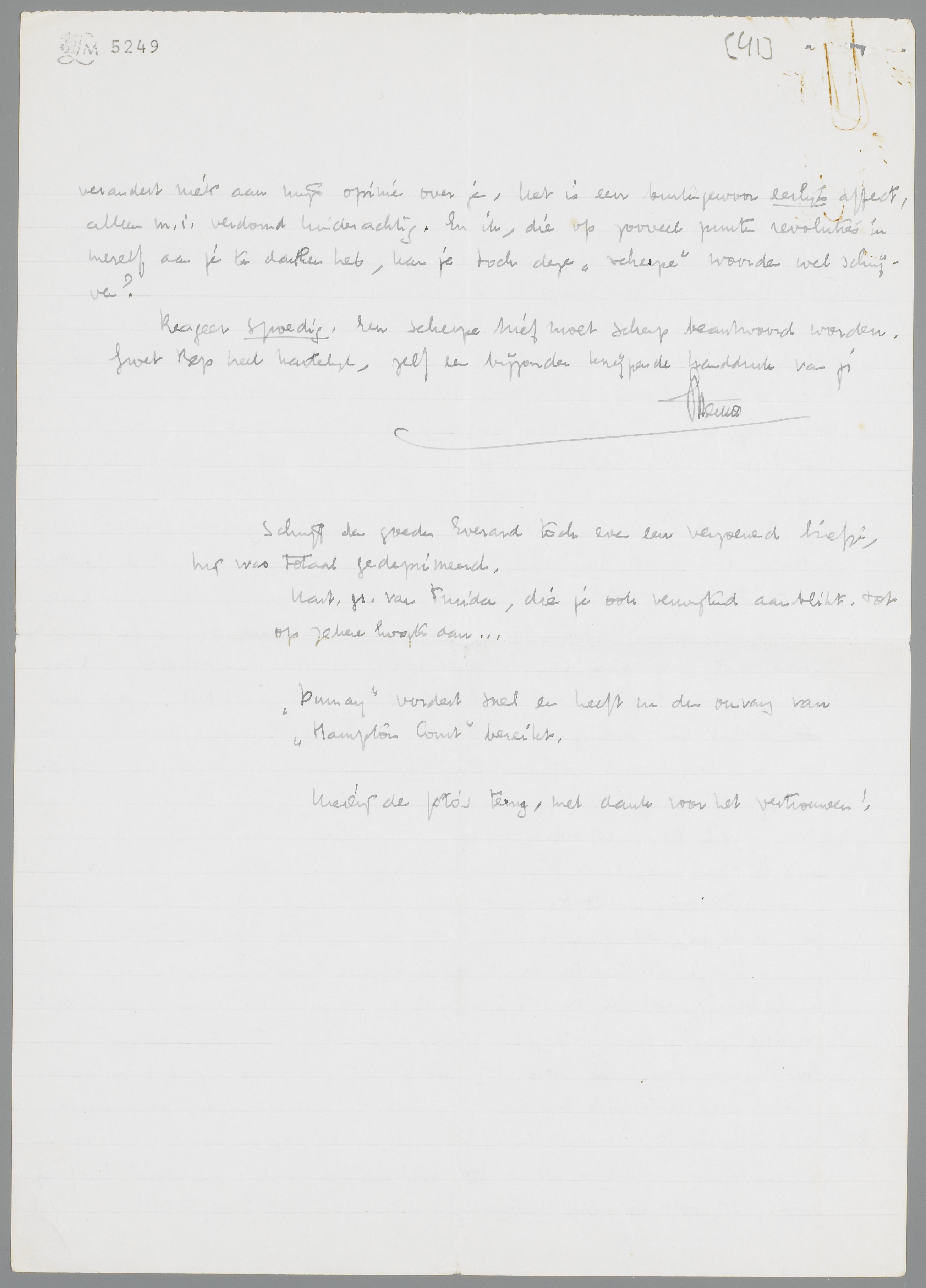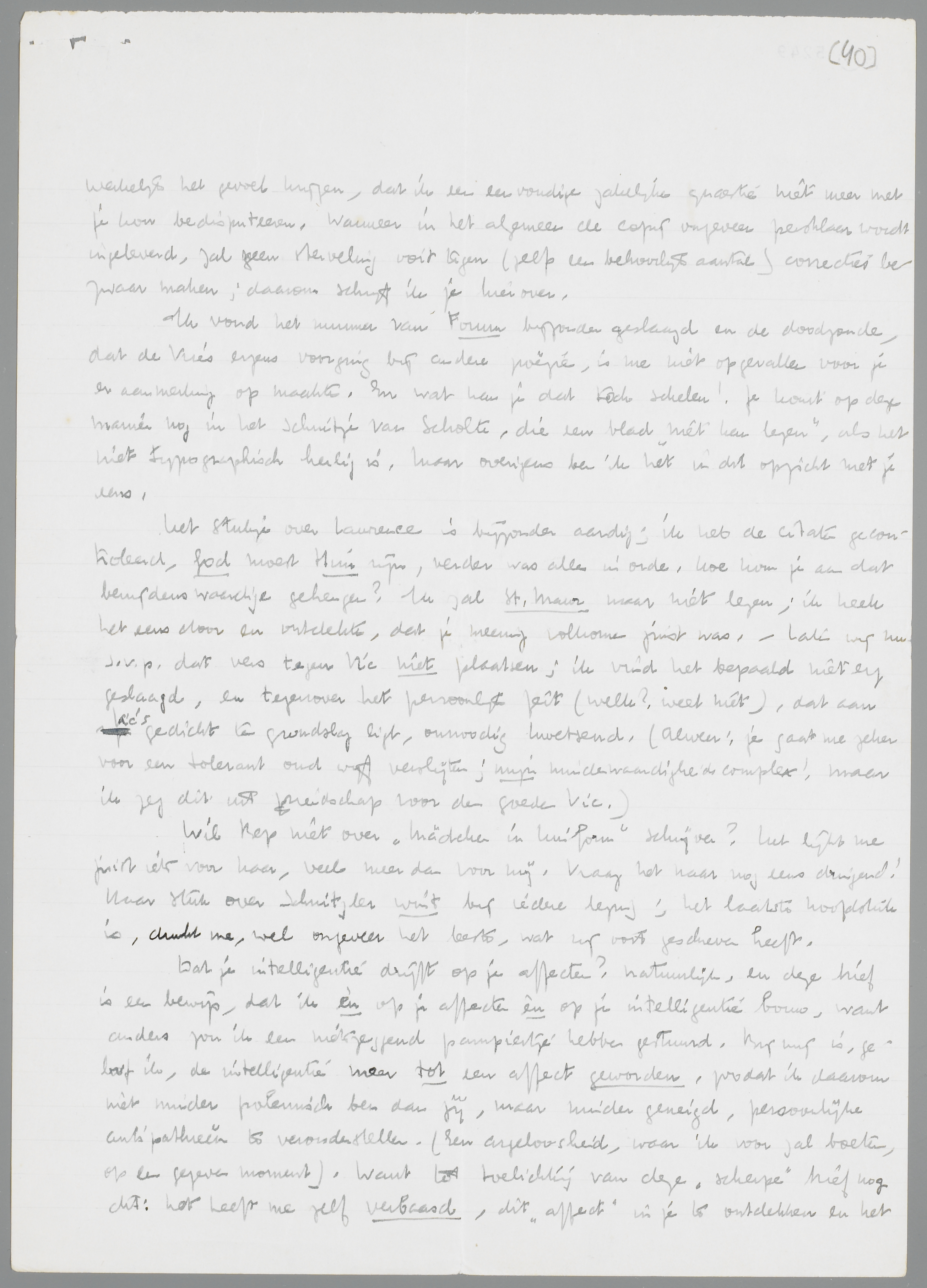 Het stukje over Lawrence is bijzonder aardig; ik heb de citaten gecontroleerd, God moest Him zijn, verder was alles in orde. Hoe kom je aan dat benijdenswaardige geheugen? Ik zal St. Mawr maar niet lezen; ik keek het eens door en ontdekte, dat je meening volkomen juist was. - Laten wij nu s.v.p. dat vers tegen Vic niet plaatsen; ik vind het bepaald niet erg geslaagd, en tegenover het persoonlijk feit (welk? weet niet), dat aan Vic's gedicht ten grondslag ligt, onnoodig kwetsend. (Alweer: je gaat me zeker voor een tolerant oud wijf verslijten; mijn minderwaardigheidscomplex! maar ik zeg dit uit vriendschap voor den goeden Vic.) Wil Bep niet over Mädchen in Uniform schrijven? Het lijkt me juist iets voor haar, veel meer dan voor mij. Vraag het haar nog eens dringend! Haar stuk over Schnitzler wint bij iedere lezing; het laatste hoofdstuk is, dunkt me, wel ongeveer het beste, wat zij ooit geschreven heeft.