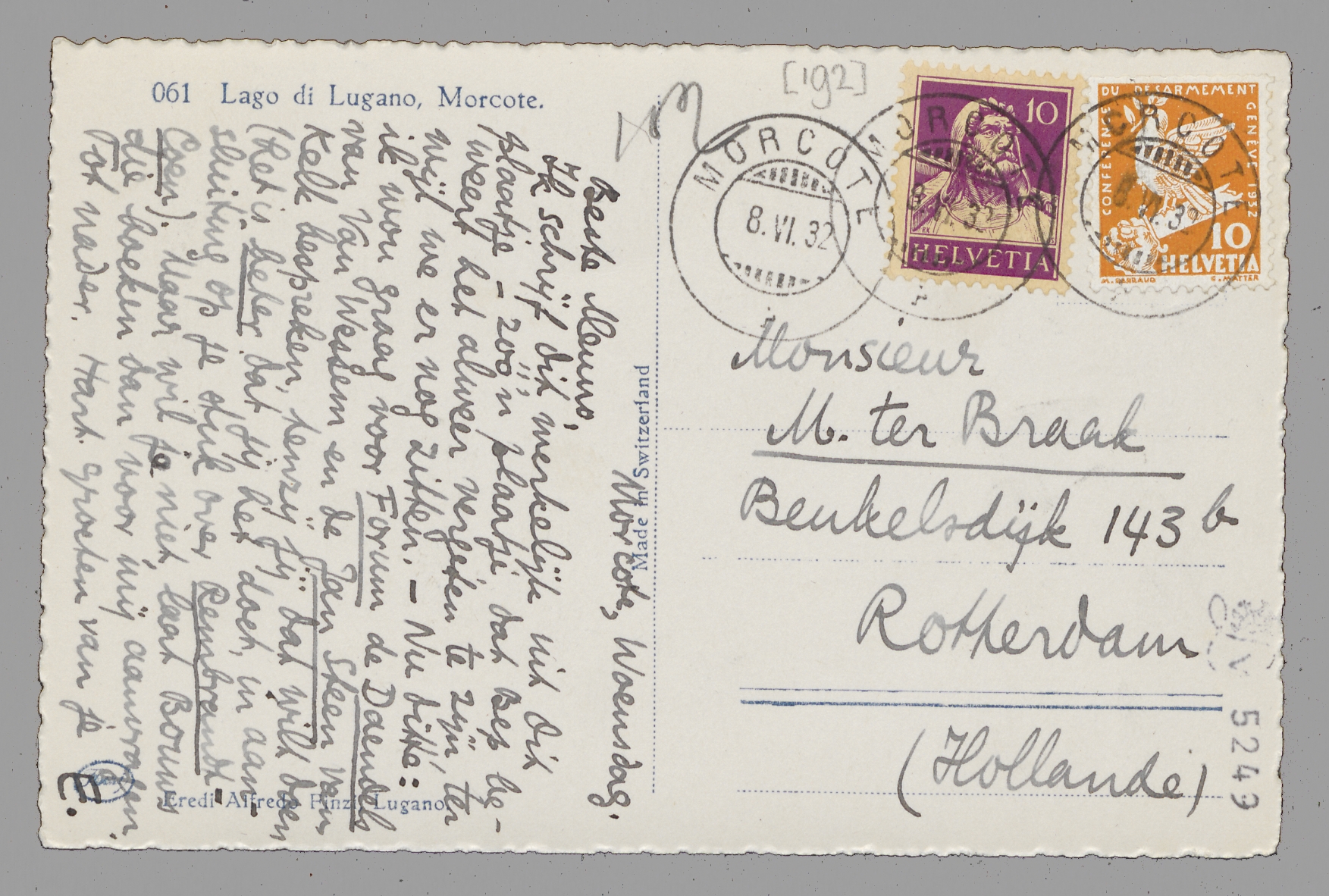 Ik schrijf dit werkelijk uit dit plaatje - zóó'n plaatje, dat Bep beweert het alweer vergeten te zijn, terwijl we er nog zitten. - Nu ditte: ik wou graag voor Forum de Daendels van Van Wessem en de Jan Steen van Kelk bespreken, tenzij jij dat wilt doen (het is beter dat jij het doet, in aansluiting op je stuk over Rembrandt-Coen). Maar wil je niet, laat Bouws die boeken dan voor mij aanvragen. Tot nader. Hart. groeten van