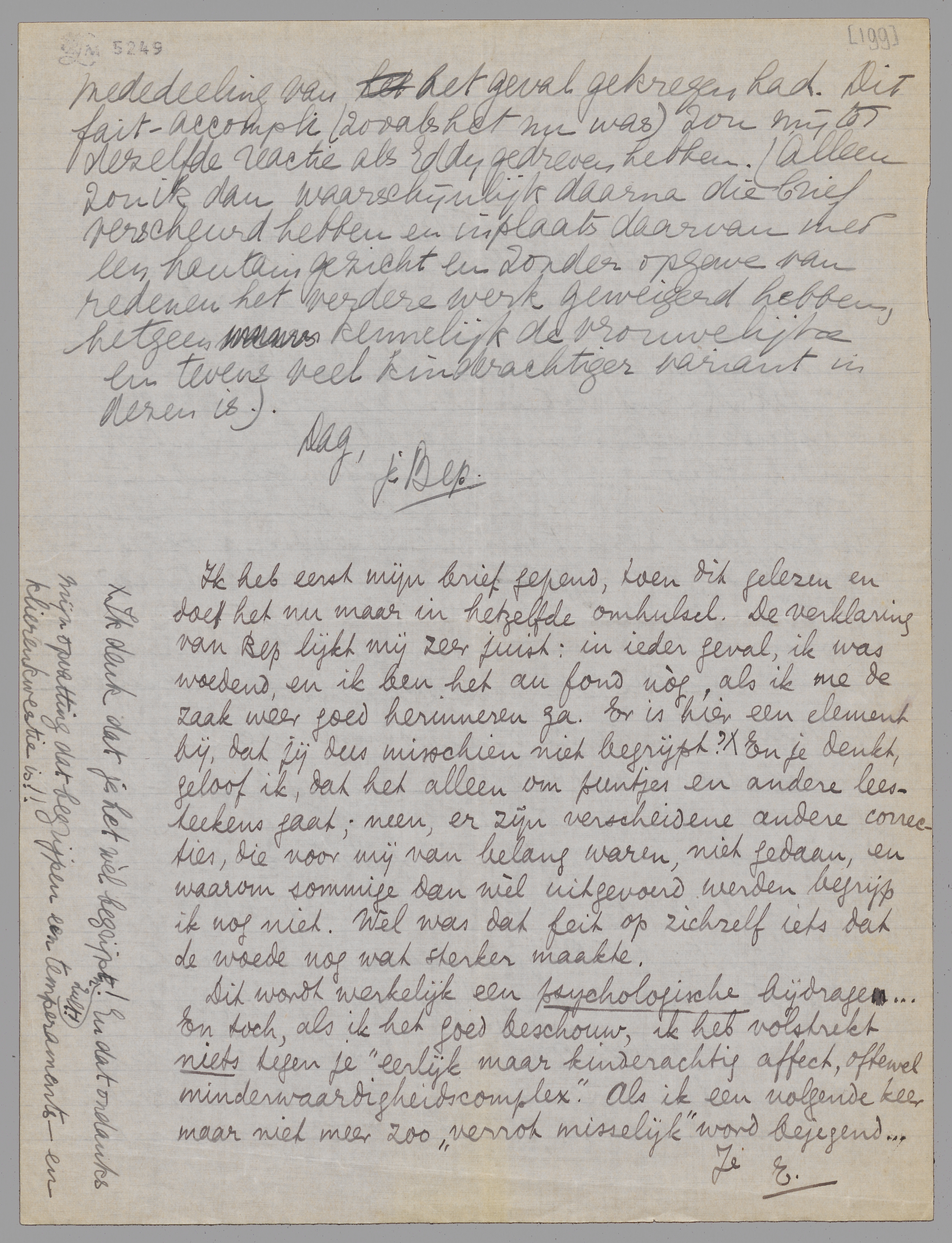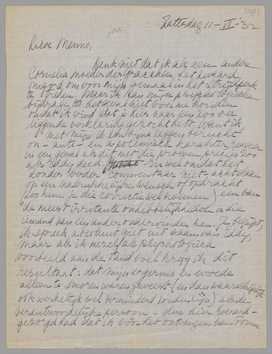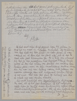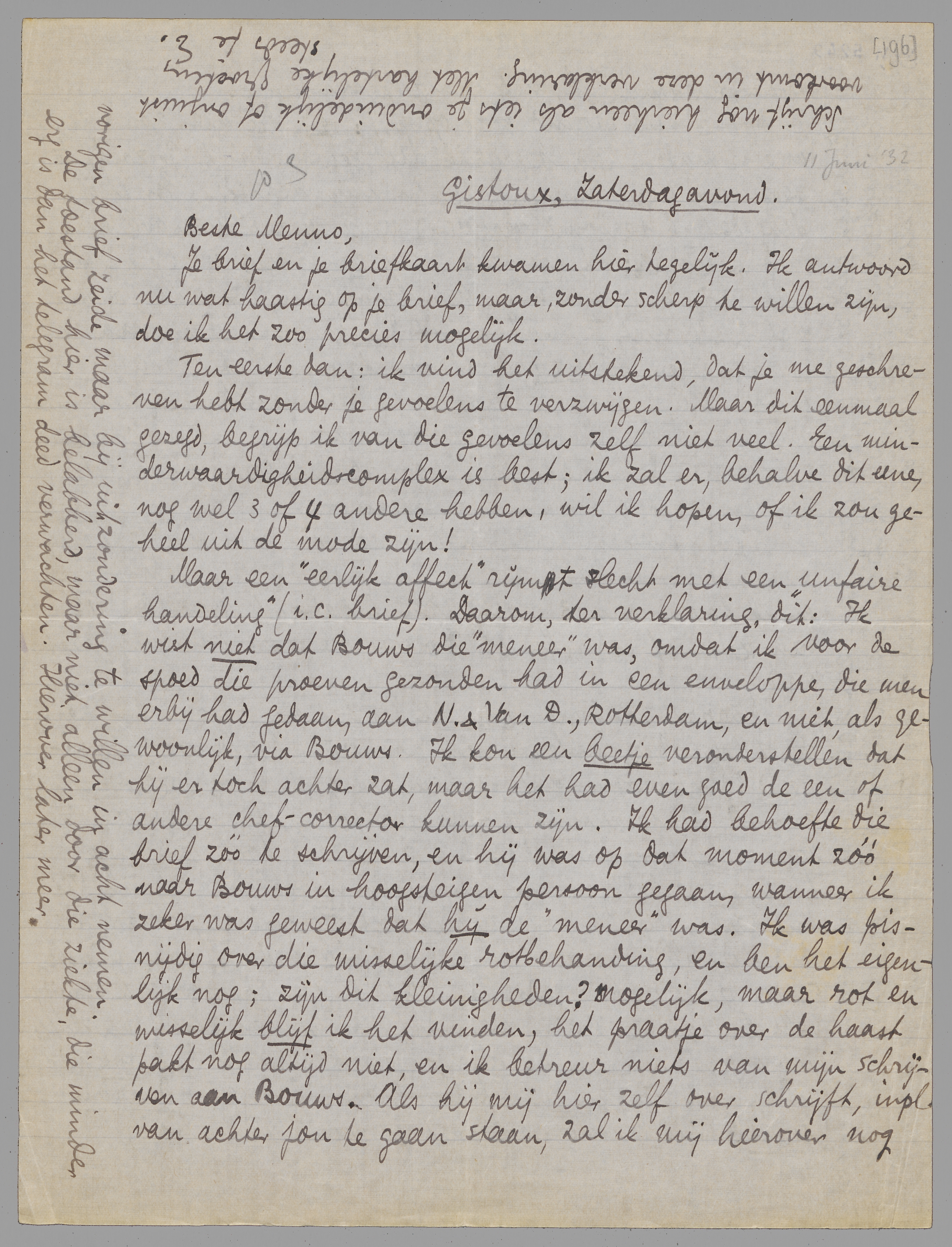 Ik heb eerst mijn brief gepend, toen dit gelezen en doe het nu maar in hetzelfde omhulsel. De verklaring van Bep lijkt mij zeer juist: in ieder geval, ik was woedend, en ik ben het au fond nòg, als ik me de zaak weer goed herinneren ga. Er is hier een element bij, dat jij dus misschien niet begrijpt?* En je denkt, geloof ik, dat het alleen om puntjes en andere leesteekens gaat; neen, er zijn verscheidene andere correcties, die voor mij van belang waren, niet gedaan, en waarom sommige dan wèl uitgevoerd werden begrijp ik nog niet. Wel was dat feit op zichzelf iets dat de woede nog wat sterker maakte.