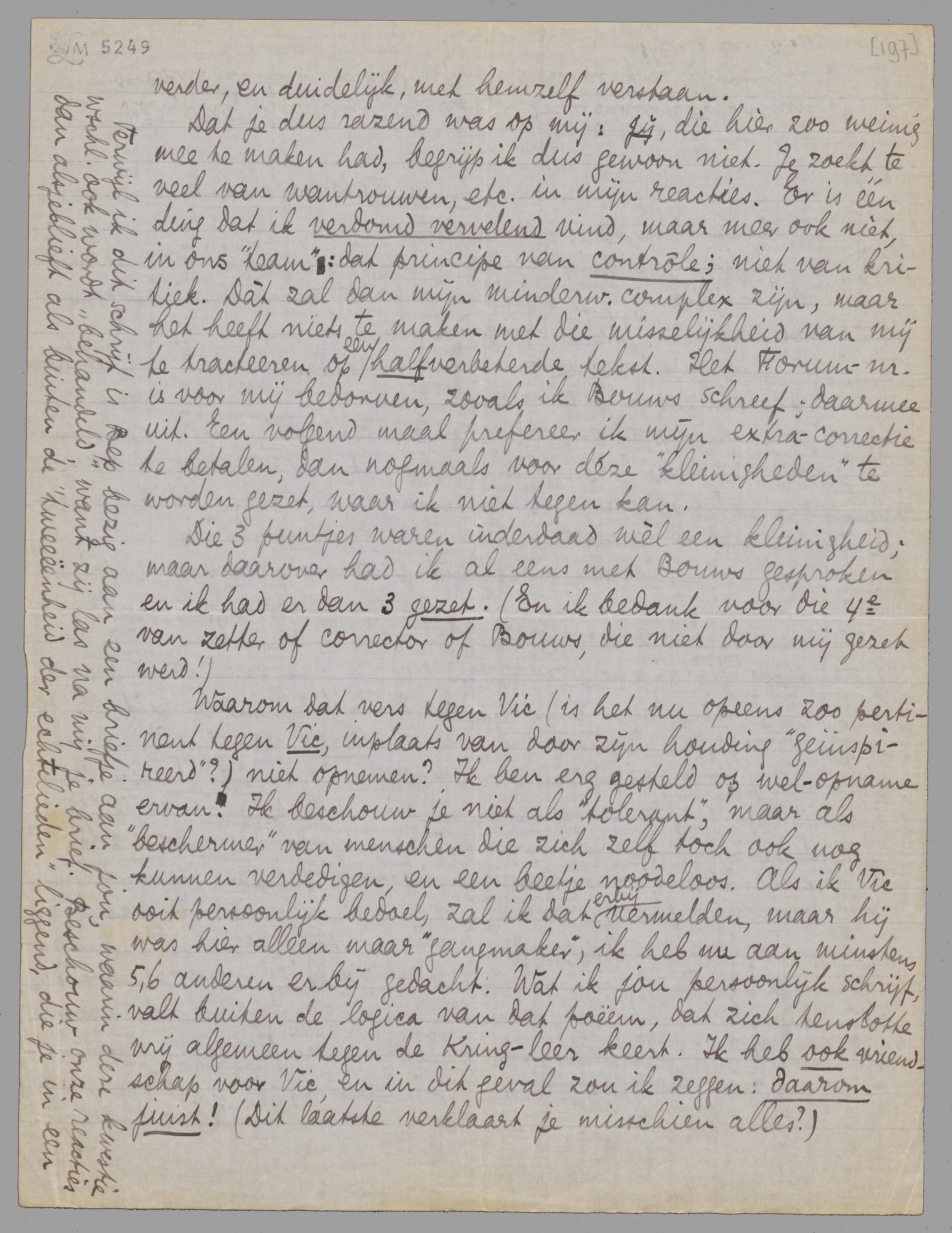 Waarom dat vers tegen Vic (is het nu opeens zoo pertinent tegen Vic, inplaats van door zijn houding ‘geïnspireerd’?) niet opnemen? Ik ben erg gesteld op welopname ervan. Ik beschouw je niet als ‘tolerant’, maar als ‘beschermer’ van menschen die zich zelf toch ook nog kunnen verdedigen, en een beetje noodeloos. Als ik Vic ooit persoonlijk bedoel, zal ik dat erbij vermelden, maar hij was hier alleen maar ‘gangmaker’, ik heb nu aan minstens 5, 6 anderen erbij gedacht. Wat ik jou persoonlijk schrijf, valt buiten de logica van dat poëem, dat zich tenslotte vrij algemeen tegen de Kring-leer keert. Ik heb ook vriendschap voor Vic, en in dit geval zou ik zeggen: daarom juist! (Dit laatste verklaart je misschien alles?)