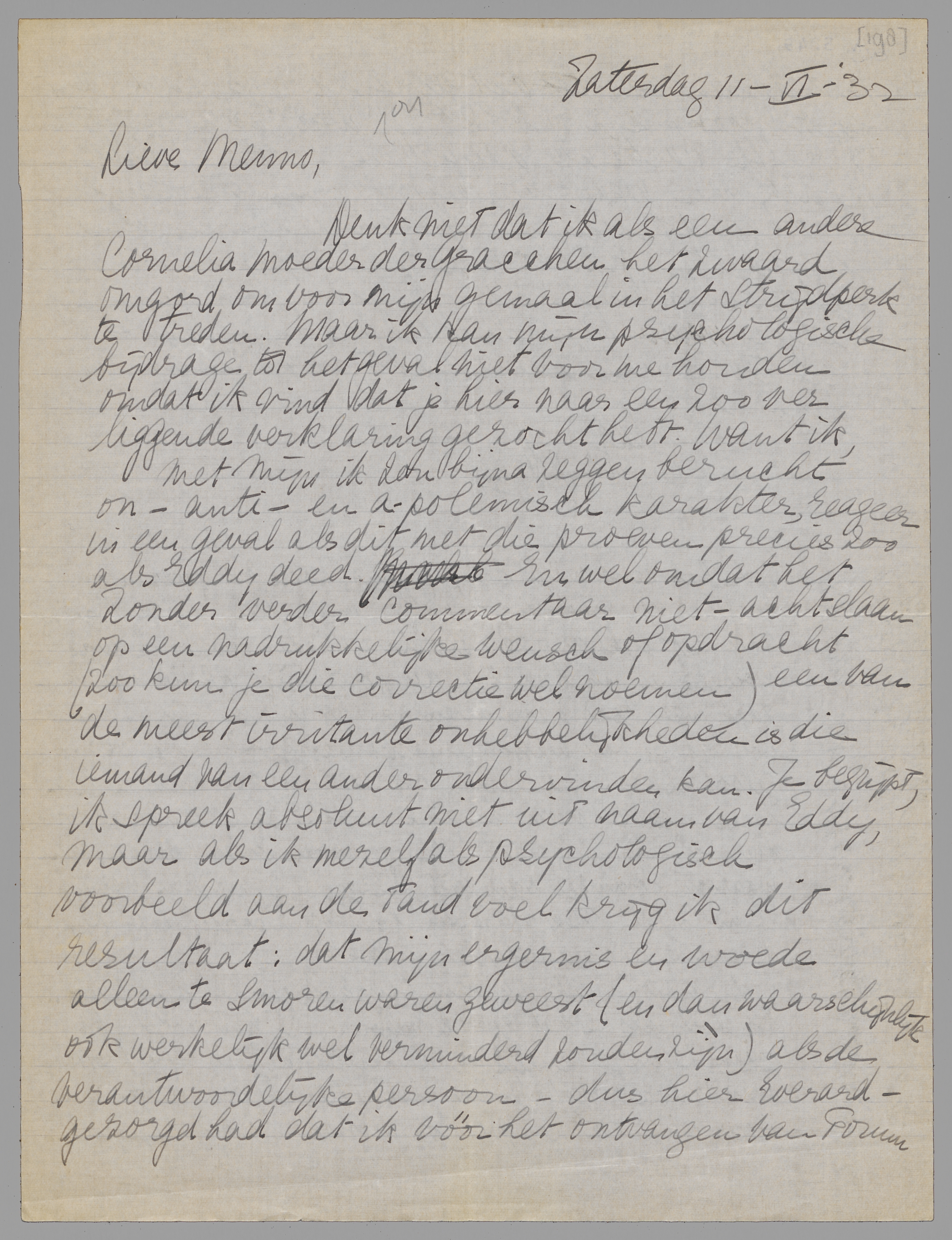 Denk niet dat ik als een andere Cornelia moeder der Gracchen het zwaard omgord om voor mijn gemaal in het strijdperk te treden. Maar ik kan mijn psychologische bijdrage tot het geval niet voor me houden omdat ik vind dat je hier naar een zoo ver liggende verklaring gezocht hebt. Want ik, met mijn ik zou bijna zeggen berucht on-anti-en a-polemisch karakter, reageer in een geval als dit met die proeven precies zoo als Eddy deed. En wel omdat het zonder verder commentaar niet-acht-slaan op een nadrukkelijke wensch of opdracht (zoo kun je die correctie wel noemen) een van de meest irritante onhebbelijkheden is die iemand van een ander ondervinden kan. Je begrijpt, ik spreek absoluut niet uit naam van Eddy, maar als ik mezelf als psychologisch voorbeeld aan de tand voel krijg ik dit resultaat: dat mijn ergernis en woede alleen maar te smoren waren geweest (en dan waarschijnlijk ook werkelijk wel verminderd zouden zìjn) als de verantwoordelijke persoon - dus hier Everard - gezorgd had dat ik vóór het ontvangen van Forum mededeeling van het geval gekregen had. Dit fait-accompli (zooals het nu was) zou mij tot dezelfde reactie als Eddy gedreven hebben. (Alleen zou ik dan waarschijnlijk daarna die brief verscheurd hebben en inplaats daarvan met een hautain gezicht en zonder opgave van redenen het verdere werk geweigerd hebben, hetgeen kennelijk de vrouwelijke en tevens veel kinderachtiger variant in dezen is.).
