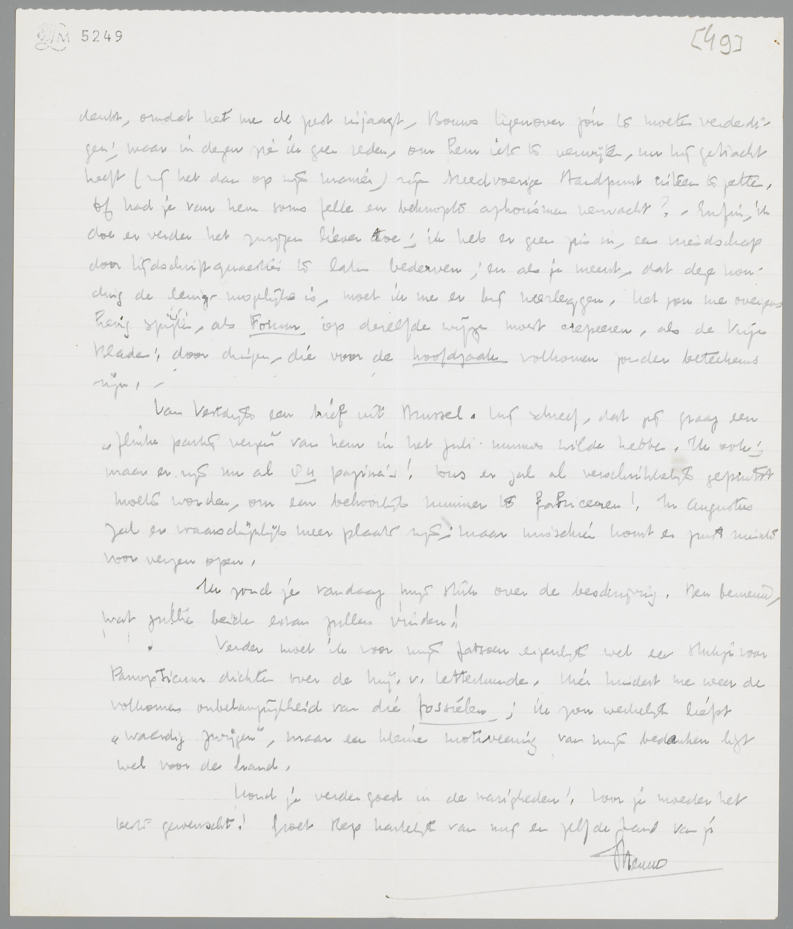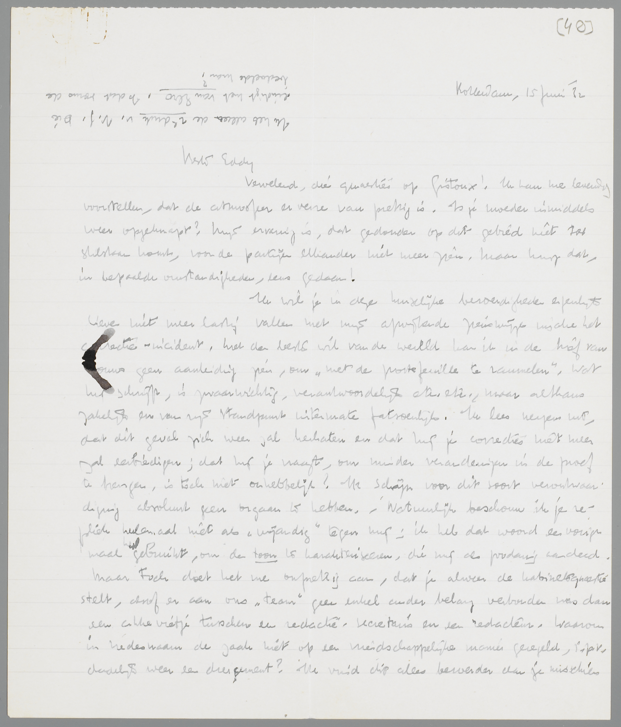 Ik wil je in deze huiselijke beroerdigheden eigenlijk liever niet meer lastig vallen met mijn afwijkende zienswijze inzake het correctie-incident. Met den besten wil van de wereld kan ik in de brief van Bouws geen aanleiding zien, om ‘met de portefeuille te rammelen’. Wat hij schrijft, is zwaarwichtig, verantwoordelijk etc. etc., maar althans zakelijk en van zijn standpunt uitermate fatsoenlijk. Ik lees nergens uit, dat dit geval zich weer zal herhalen en dat hij je correcties niet meer zal eerbiedigen; dat hij je vraagt, om minder veranderingen in de proef te brengen, is toch niet onhebbelijk? Ik schijn voor dit soort verontwaardiging absoluut geen orgaan te hebben. - Natuurlijk beschouw ik je repliek heelemaal niet als ‘vijandig’ tegen mij; ik heb dat woord een vorige maal wel gebruikt, om den toon te karakteriseeren, die mij als zoodanig aandeed. Maar toch doet het me onprettig aan, dat je alweer de kabinetsquaestie stelt, alsof er aan ons ‘team’ geen enkel ander belang verbonden was dan een akkevietje tusschen een redactie-secretaris en een redacteur. Waarom in vredesnaam de zaak niet op een vriendschappelijke manier geregeld, i.p.v. dadelijk weer een dreigement? Ik vind dit alles beroerder dan je misschien denkt, omdat het me de pest injaagt, Bouws tegenover jou te moeten verdedigen; maar in dezen zie ik geen reden, om hem iets te verwijten, nu hij getracht heeft (zij het dan op zijn manier) zijn breedvoerige standpunt uiteen te zetten. Of had je van hem soms felle en beknopte aphorismen verwacht? - Enfin, ik doe er verder het zwijgen liever toe; ik heb er geen zin in, een vriendschap door tijdschriftquaesties te laten bederven; en als je meent, dat deze houding de eenig-mogelijke is, moet ik me er bij neerleggen. Het zou me overigens hevig spijten, als Forum op dezelfde wijze moest crepeeren, als de Vrije Bladen: door dingen, die voor de hoofdzaak volkomen zonder beteekenis zijn. -