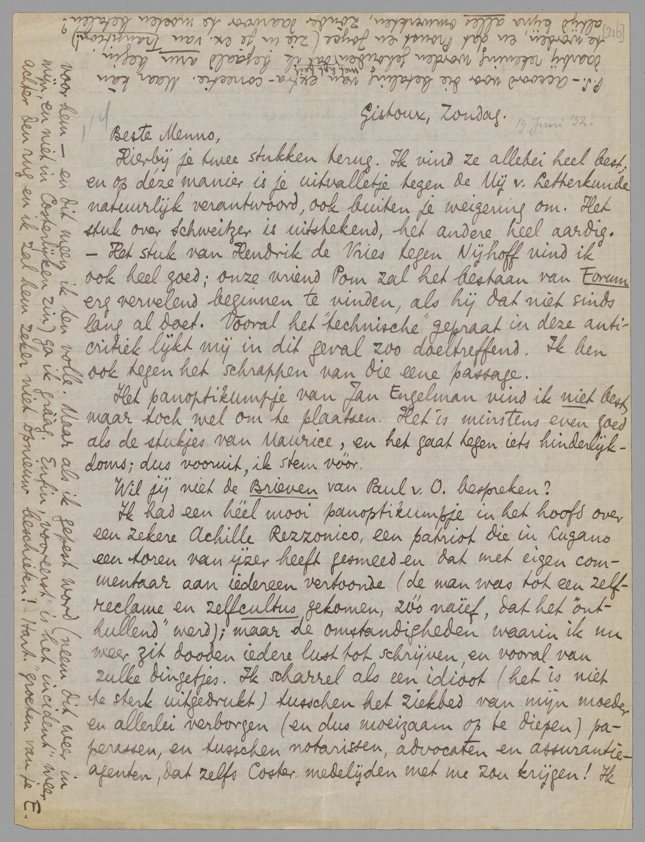 Ik had een heel mooi panoptikumpje in het hoofd over een zekere Achille Rezzonico, een patriot die in Lugano een toren van ijzer heeft gesmeed en dat met eigen commentaar aan iedereen vertoonde (de man was tot een zelfreclame en zelfcultus gekomen, zóó naïef, dat het ‘onthullend’ werd); maar de omstandigheden waarin ik nu weer zit dooden iedere lust tot schrijven, en vooral van zulke dingetjes. Ik scharrel als een idioot (het is niet te sterk uitgedrukt) tusschen het ziekbed van mijn moeder en allerlei verborgen (en dus moeizaam op te diepen) paperassen, en tusschen notarissen, advocaten en assurantie-agenten, dat zelfs Coster medelijden met me zou krijgen! Ik ben ook bezig mijn boeken te schiften, voor als de ‘krach’ komt. Het is dan wel heerlijk een minimum te bezitten!