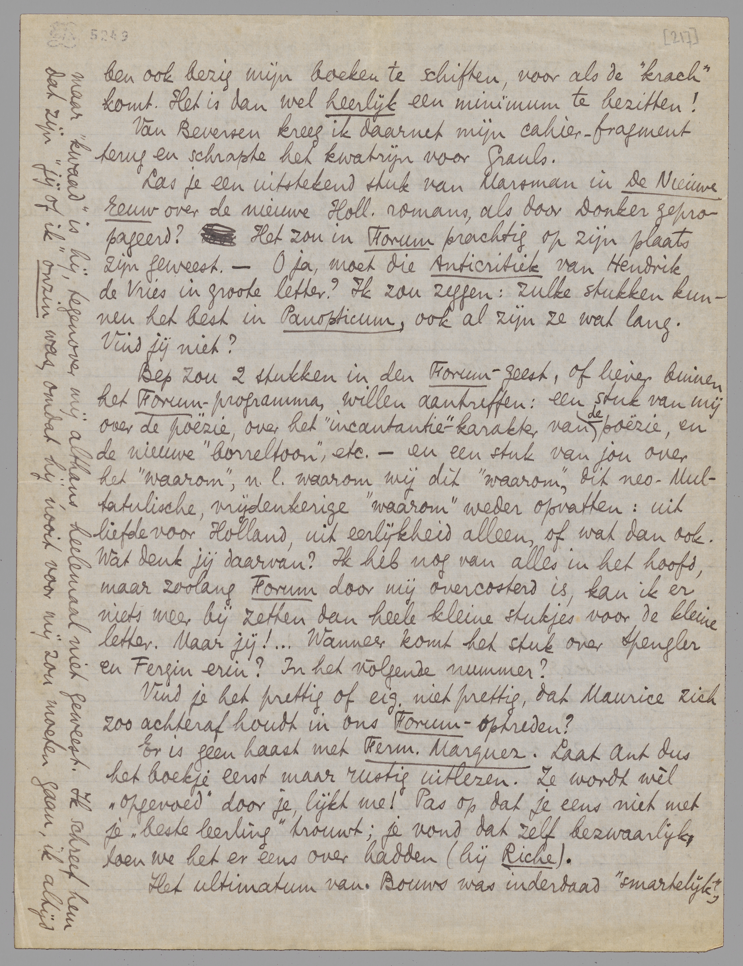 Las je een uitstekend stuk van Marsman in De Nieuwe Eeuw over de nieuwe Holl. romans, als door Donker gepropageerd? Het zou in Forum prachtig op zijn plaats zijn geweest. - O ja, moet die Anticritiek van Hendrik de Vries in groote letter? Ik zou zeggen, zulke stukken kunnen het best in Panopticum, ook al zijn ze wat lang. Vind jij niet?