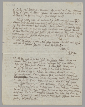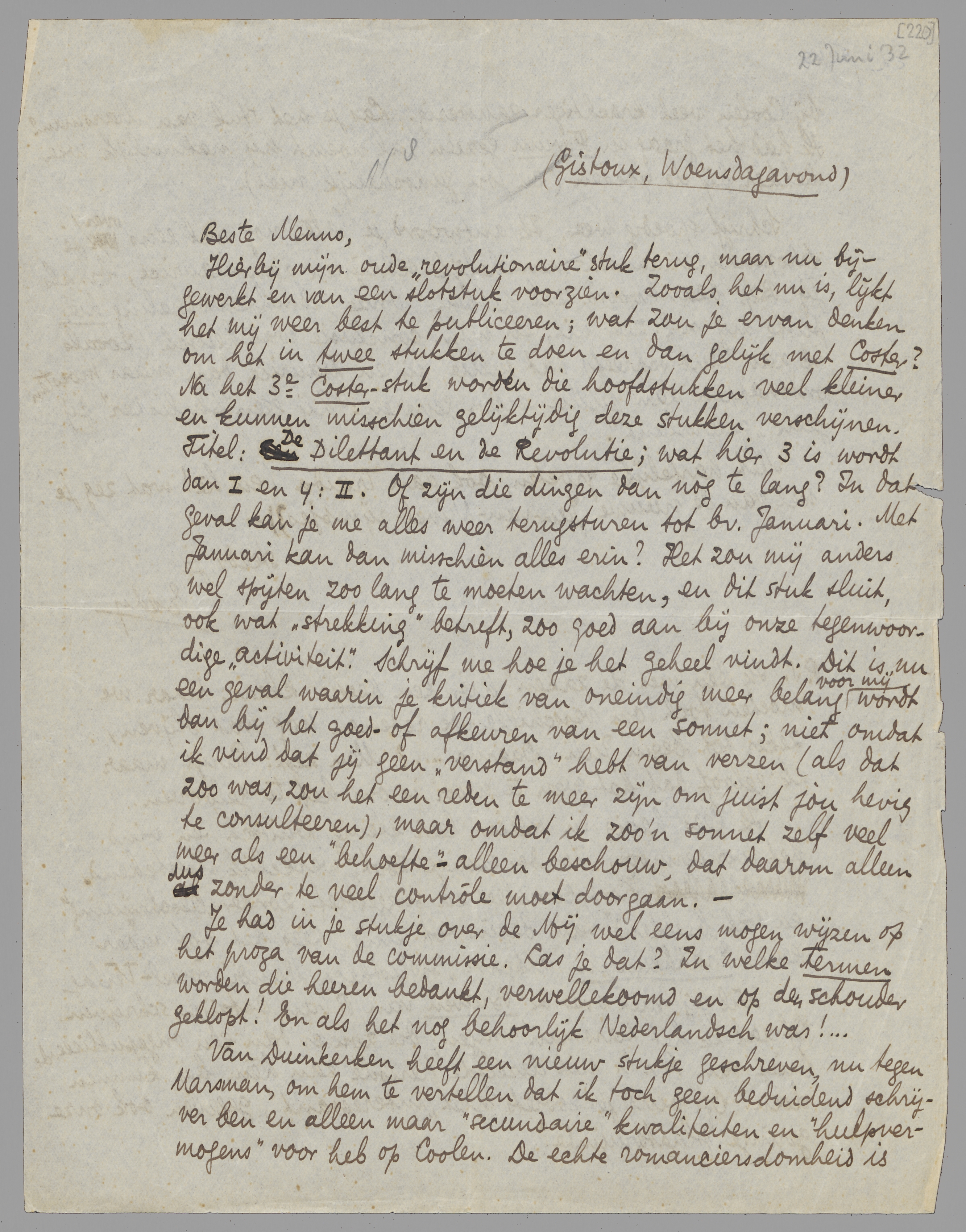 Hierbij mijn oude ‘revolutionaire’ stuk terug, maar nu bijgewerkt en van een slotstuk voorzien. Zooals het nu is, lijkt het mij weer best te publiceeren; wat zou je ervan denken om het in twee stukken te doen en dan gelijk met Coster? Na het 3e Coster-stuk worden die hoofdstukken veel kleiner en kunnen misschien gelijktijdig deze stukken verschijnen. Titel: De Dilettant en de Revolutie; wat hier 3 is wordt dan I en 4: II. Of zijn die dingen dan nòg te lang? In dat geval kan je me alles weer terug sturen tot bv. Januari. Met Januari kan dan misschien alles erin? Het zou mij anders wel spijten zoo lang te moeten wachten, en dit stuk sluit, ook wat ‘strekking’ betreft, zoo goed aan bij onze tegenwoordige ‘activiteit.’ Schrijf me hoe je het geheel vindt. Dit is nu een geval waarin je kritiek van oneindig meer belang voor mij wordt dan bij het goed- of afkeuren van een sonnet; niet omdat ik vind dat jij geen ‘verstand’ hebt van verzen (als dat zoo was, zou het een reden te meer zijn om juist jou hevig te consulteeren), maar omdat ik zoo'n sonnet zelf veel meer als een ‘behoefte’-alleen beschouw, dat daarom alleen dus zonder te veel contrôle moet doorgaan. -
