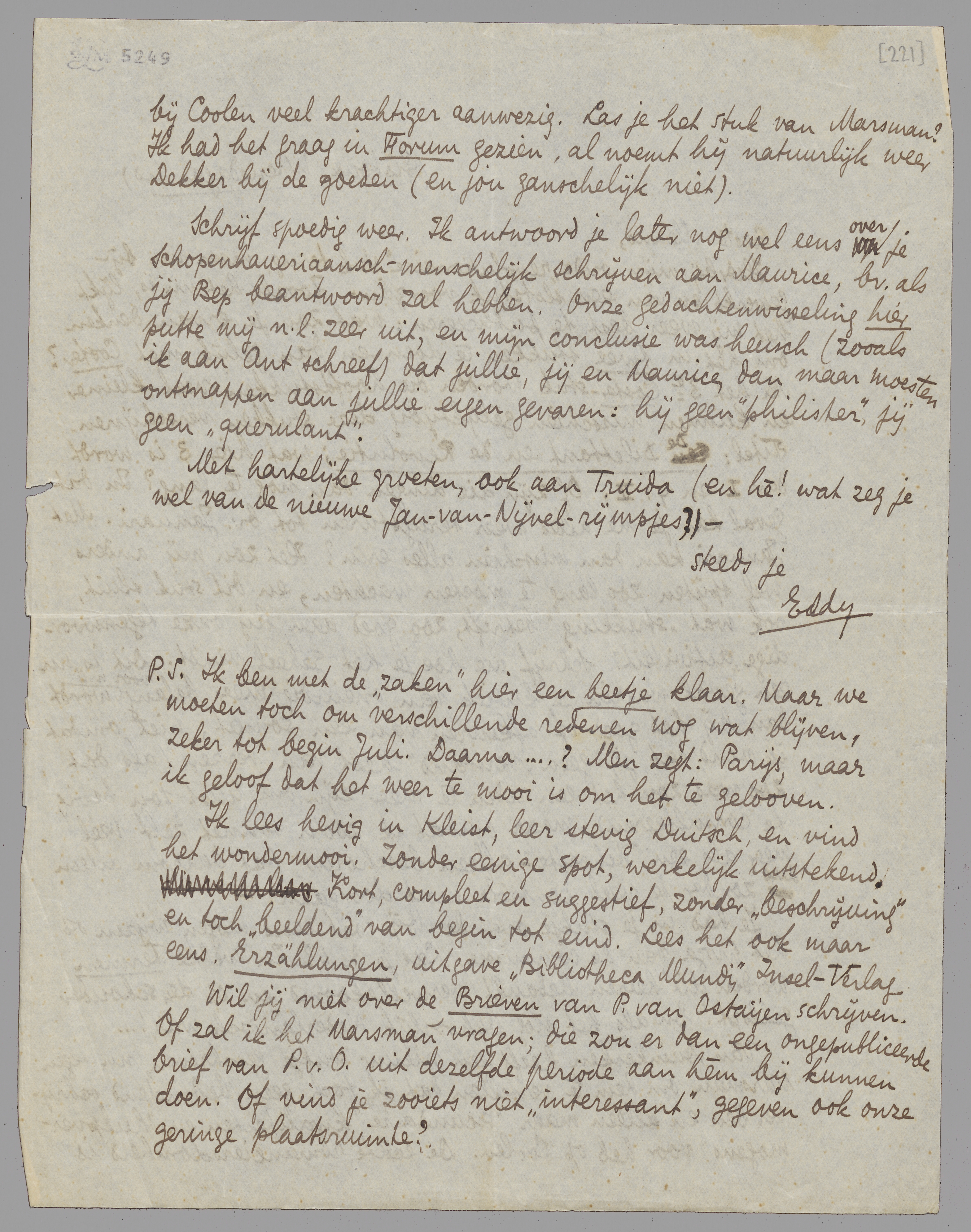 Wil jij niet over de Brieven van P. van Ostaijen schrijven. Of zal ik het Marsman vragen; die zou er dan een ongepubliceerde brief van P.v.O. uit dezelfde periode aan hèm bij kunnen doen. Of vind je zooiets niet ‘interessant’, gegeven ook onze geringe plaatsruimte?