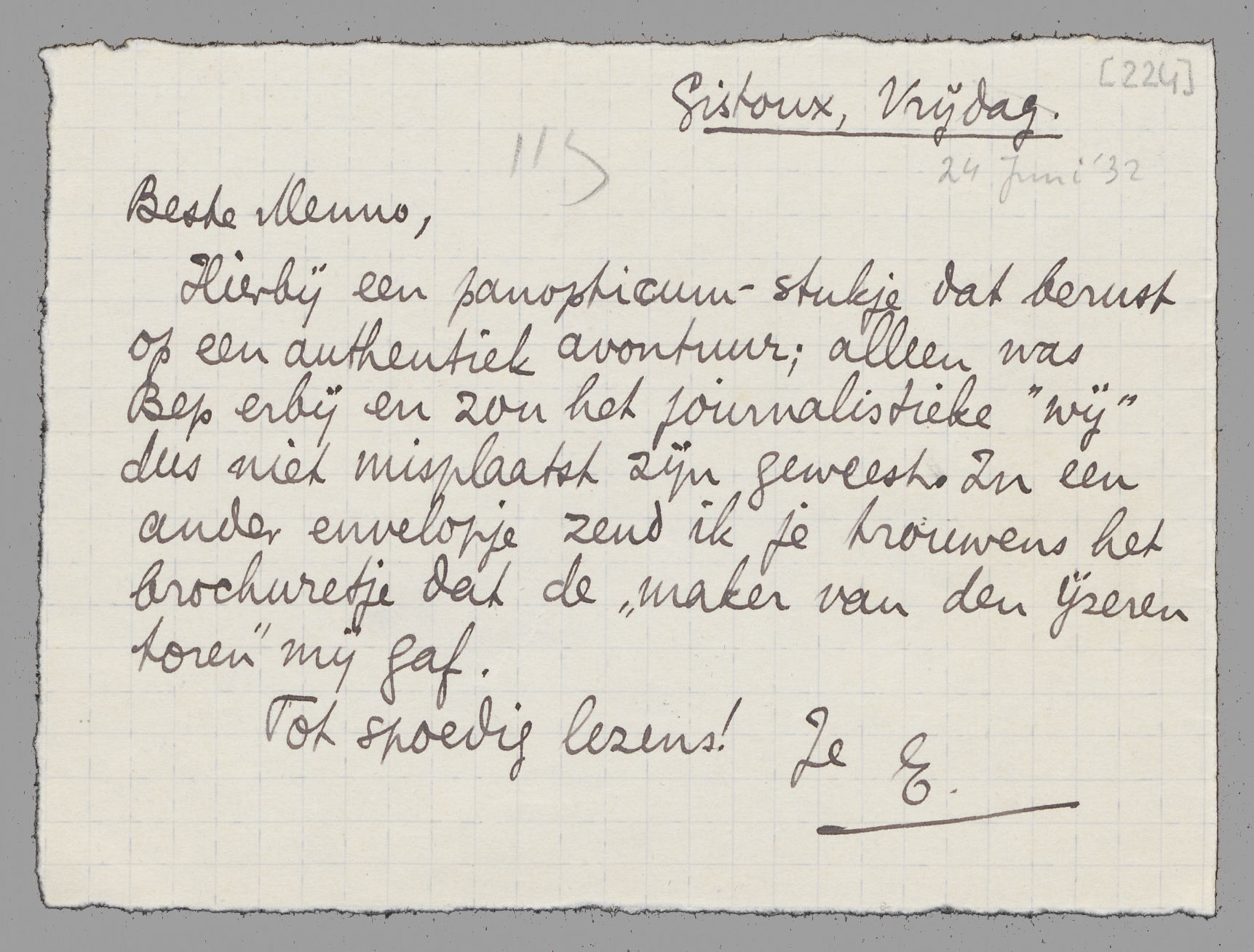 Hierbij een panopticum-stukje dat berust op een authentiek avontuur; alleen was Bep erbij en zou het journalistieke ‘wij’ dus niet misplaatst zijn geweest. In een ander envelopje zend ik je trouwens het brochuretje dat de ‘maker van den ijzeren toren’ mij gaf.