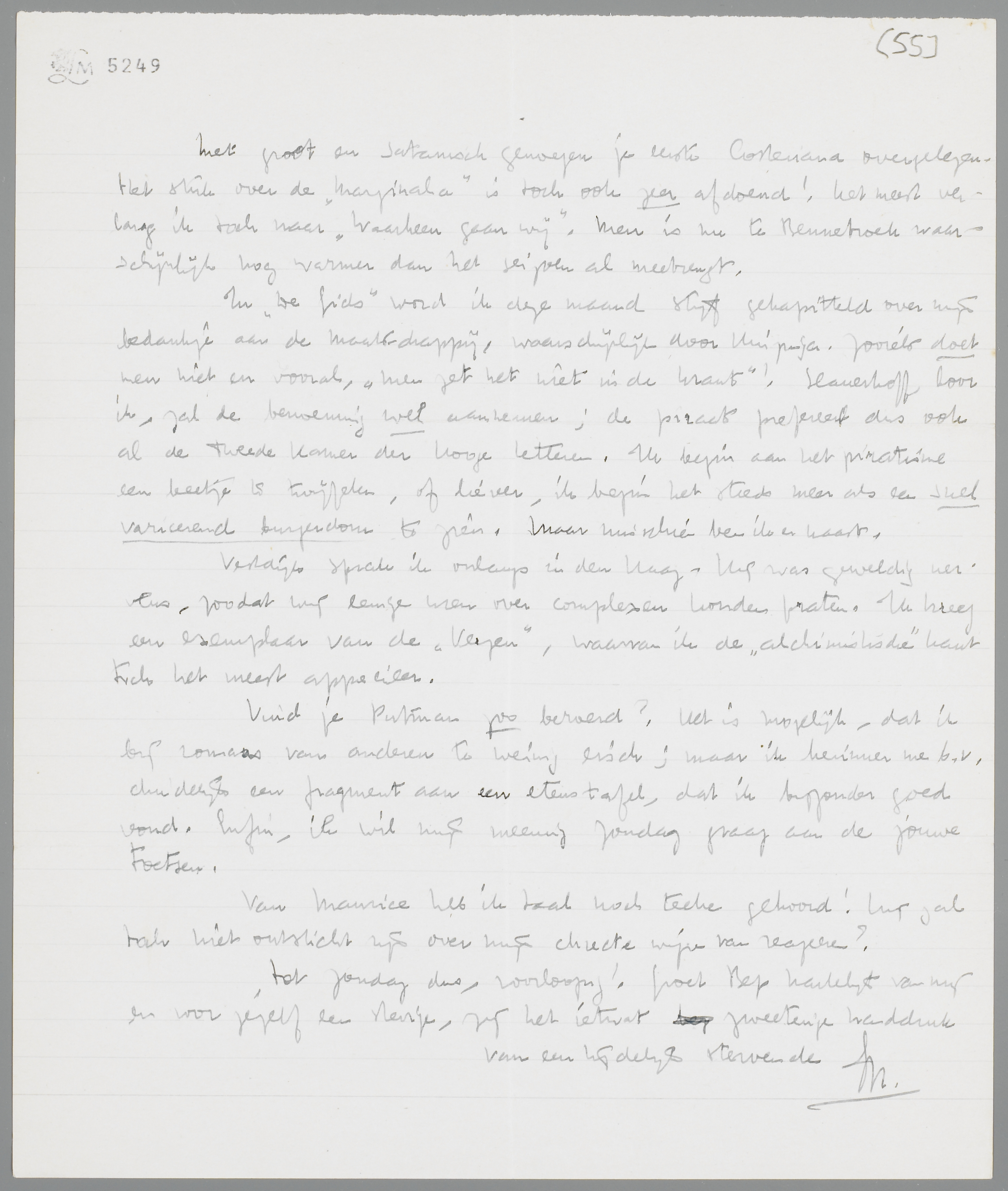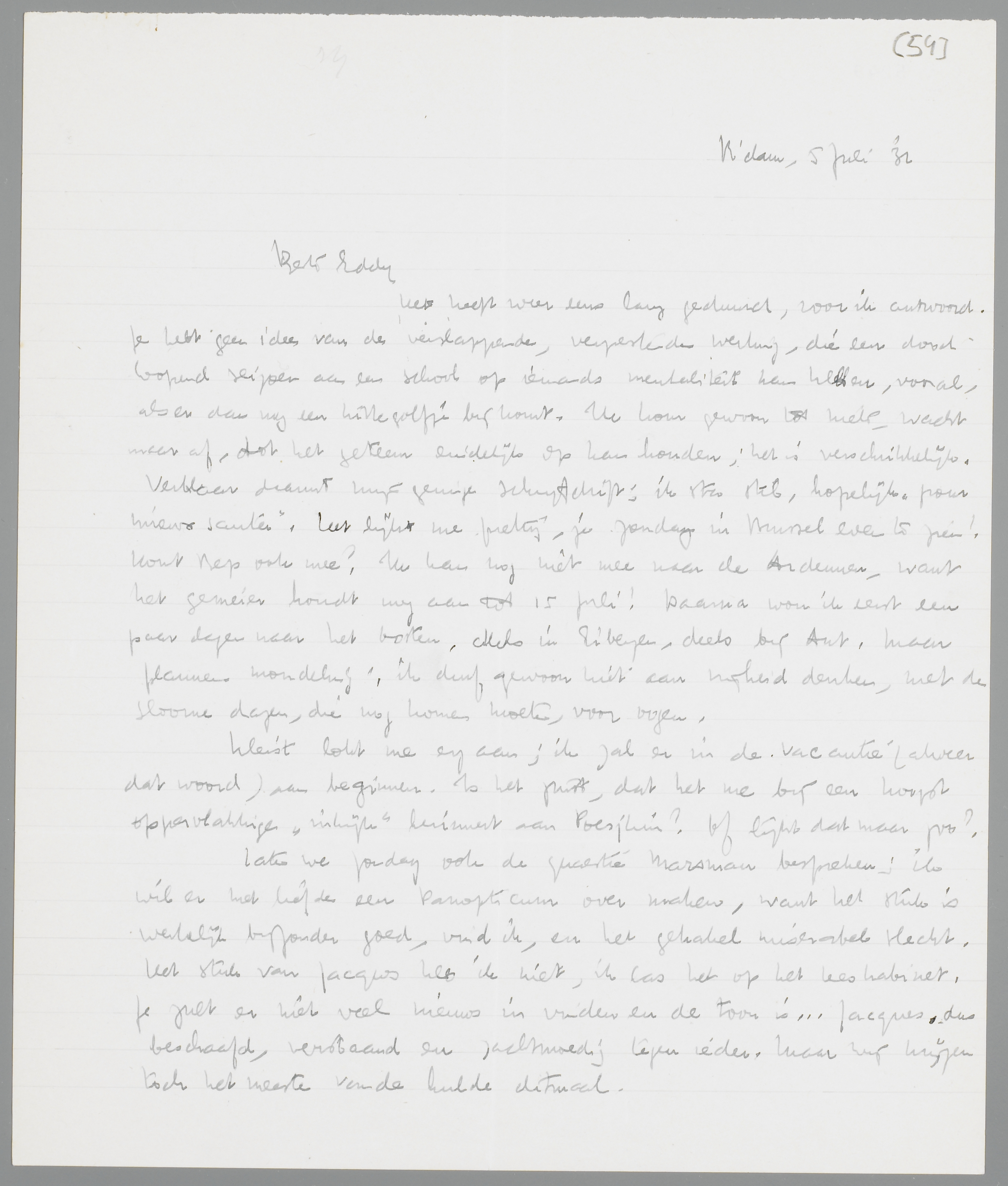Laten we Zondag ook de quaestie Marsman bespreken; ik wil er met liefde een Panopticum over maken, want het stuk is werkelijk bijzonder goed, vind ik, en het gekakel miserabel slecht. Het stuk van Jacques heb ik niet, ik las het op het leeskabinet. Je zult er niet veel nieuws in vinden en de toon is... Jacques, dus beschaafd, verstaand en zachtmoedig tegen ieder. Maar wij krijgen toch het meeste van de hulde ditmaal.