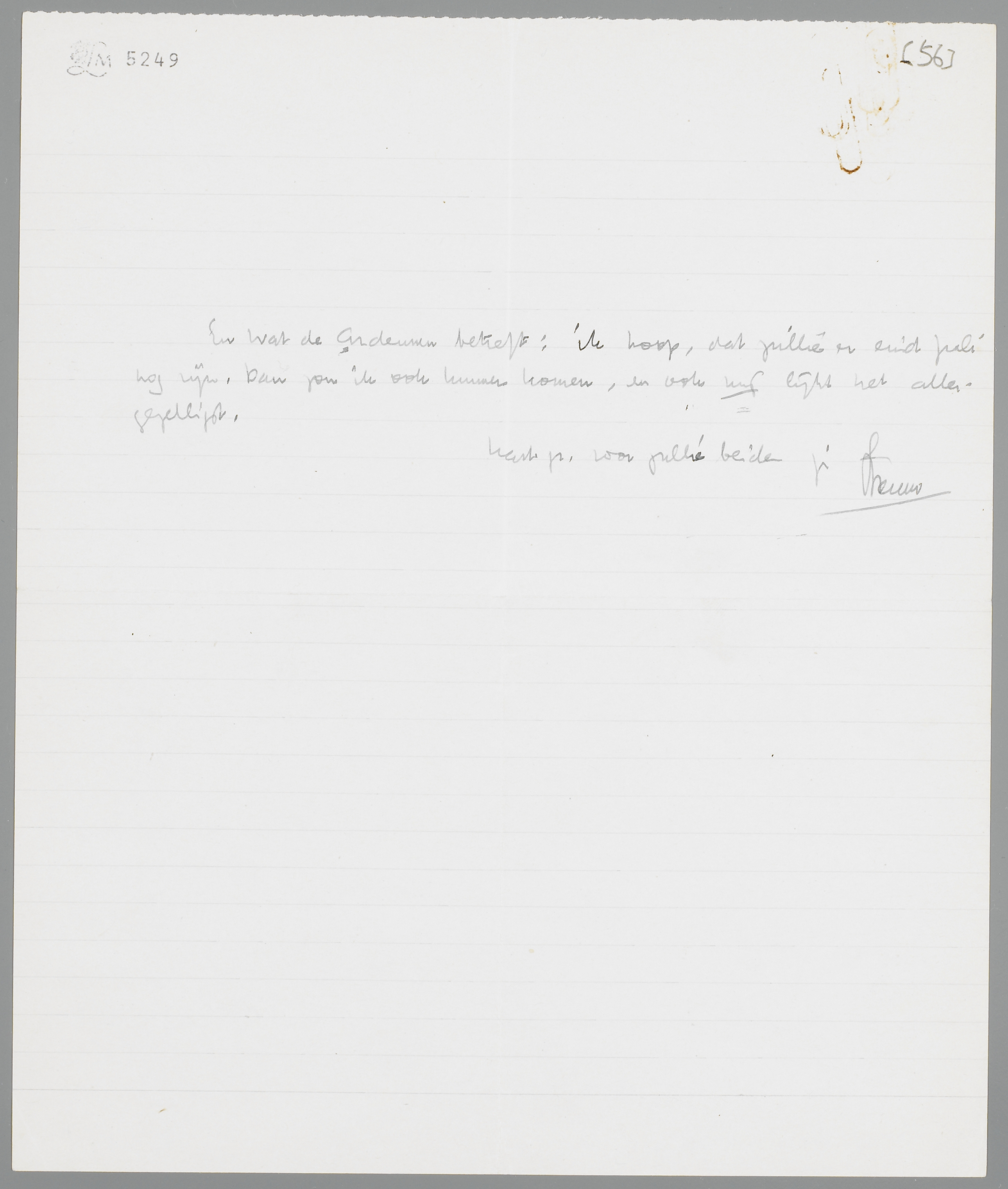 Onze brieven kruisten precies, dank zij mijn gedegenereerde zwijgzaamheid. Je weet dus over een en ander nu al meer. - Ik denk, dat ik Kleist mooi zal vinden en in dat geval zal ik het beslist houden, gegeven mijn soort van boekenmanie; maar anders zal ik het eerlijk naar Marsman zenden! Het ongeluk wil, dat Truida vandaag naar Bergen vertrokken is, voor een paar dagen, en Kleist heeft meegenomen, zoodat ik nu ter plaatse de al- dan niet aanwezigheid van het bedoelde papier niet kan nagaan. Ik schrijf haar met deze post een briefkaart, met het verzoek, je bij aanwezigheid het document dadelijk te sturen. – Wat U.Ed, betreft: ik had juist eenige mondelinge berichten over haar opgespaard, betreffende haar verhouding tot den heer Victor E. van Vriesland. Er heeft zich n.l. in den laatsten tijd toch zooiets ontwikkeld, half en half tot mijn spijt, moet ik zeggen. Ik zou me in dezen willen aansluiten bij de opmerkingen, die jij destijds maakte over ‘het avontuur’ en de rest voor Zondag bewaren. (Of kunnen jullie niet Zaterdag al in Brussel komen? Ik zou er ’s middags kunnen zijn en, daar Forum de reis betaalt, wel een hotel vinden voor de nacht ).