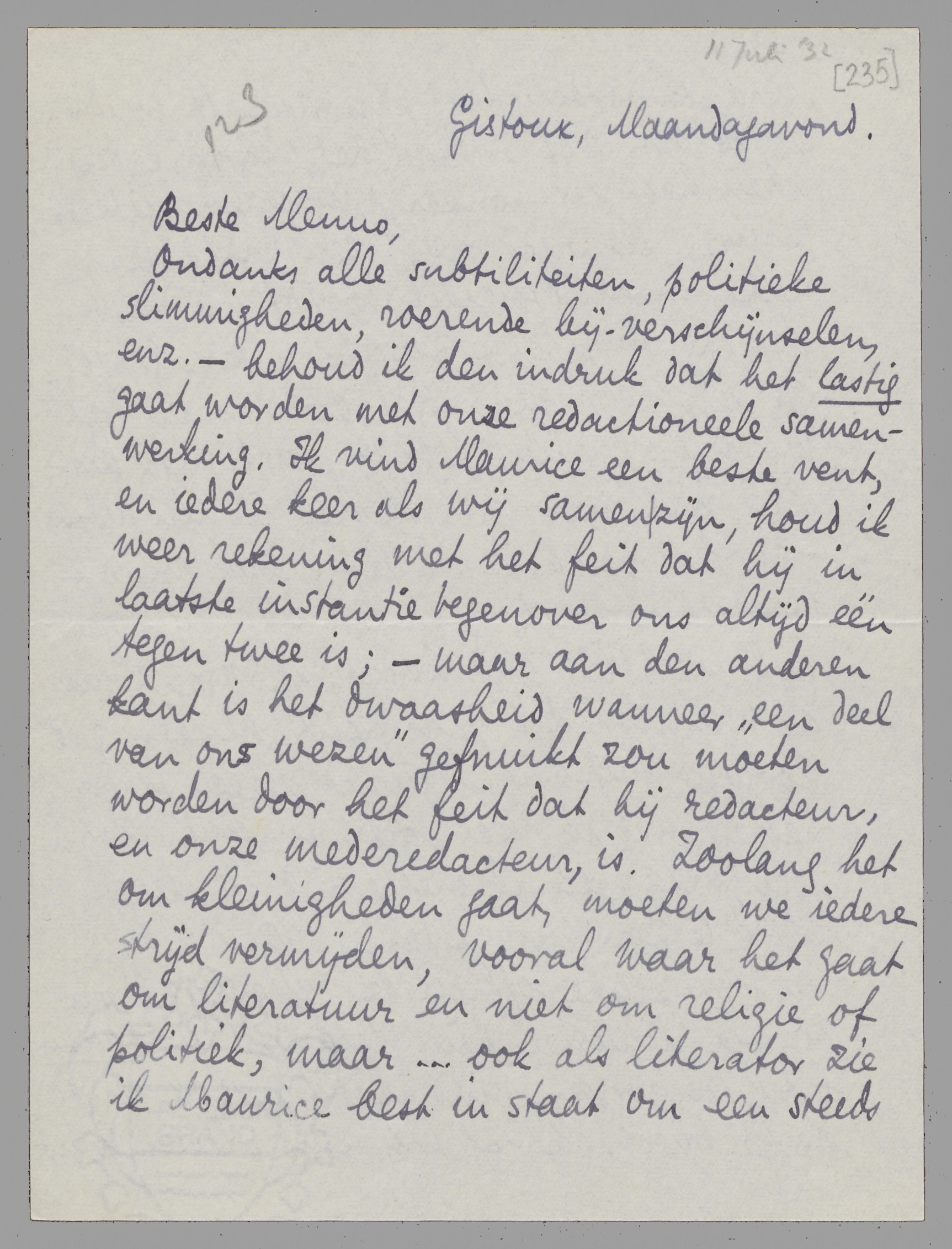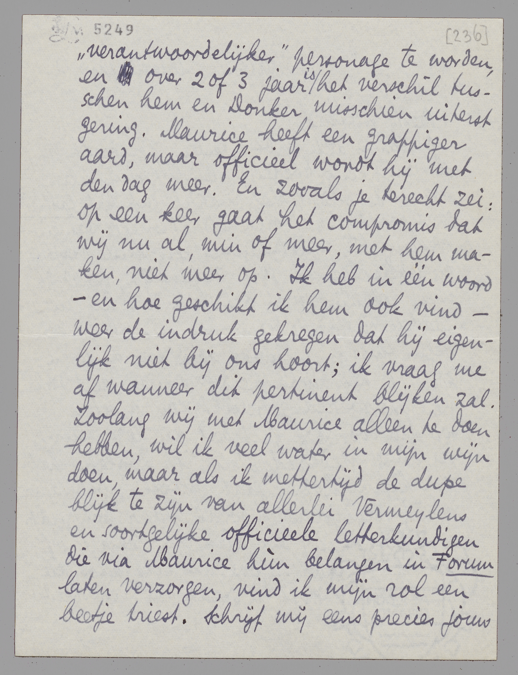 Ondanks alle subtiliteiten, politieke slimmigheden, roerende bij-verschijnselen, enz. - behoud ik den indruk dat het lastig gaat worden met onze redactioneele samenwerking. Ik vind Maurice een beste vent, en iedere keer als wij samen zijn, houd ik weer rekening met het feit dat hij in laatste instantie tegenover ons altijd één tegen twee is; - maar aan den anderen kant is het dwaasheid wanneer ‘een deel van ons wezen’ gefnuikt zou moeten worden door het feit dat hij redacteur, en onze mederedacteur, is. Zoolang het om kleinigheden gaat, moeten we iedere strijd vermijden, vooral waar het gaat om literatuur en niet om religie of politiek, maar... ook als literator zie ik Maurice best in staat om een steeds ‘verantwoordelijker’ personage te worden, en over 2 of 3 jaar is het verschil tusschen hem en Donker misschien uiterst gering. Maurice heeft een grappiger aard, maar officieel wordt hij met den dag meer. En zooals je terecht zei: op een keer gaat het compromis dat wij nu al, min of meer, met hem maken, niet meer op. Ik heb in één woord - en hoe geschikt ik hem ook vind - weer de indruk gekregen dat hij eigenlijk niet bij ons hoort; ik vraag me af wanneer dit pertinent blijken zal. Zoolang wij met Maurice alleen te doen hebben, wil ik veel water in mijn wijn doen, maar als ik mettertijd de dupe blijk te zijn van allerlei Vermeylens en soortgelijke officieele letterkundigen die via Maurice hùn belangen in Forum laten verzorgen, vind ik mijn rol een beetje triest. Schrijf mij eens precies jouw indrukken van deze laatste vergadering; want we hebben elkaar na Bouws' en M's. opdagen alleen nog maar ‘officieel’ [Ditmaal tusschen aanhalingsteekens!] kunnen spreken, en de werkelijke nasmaak, het bezinksel van zoo'n vergadering is toch eigenlijk het ware.