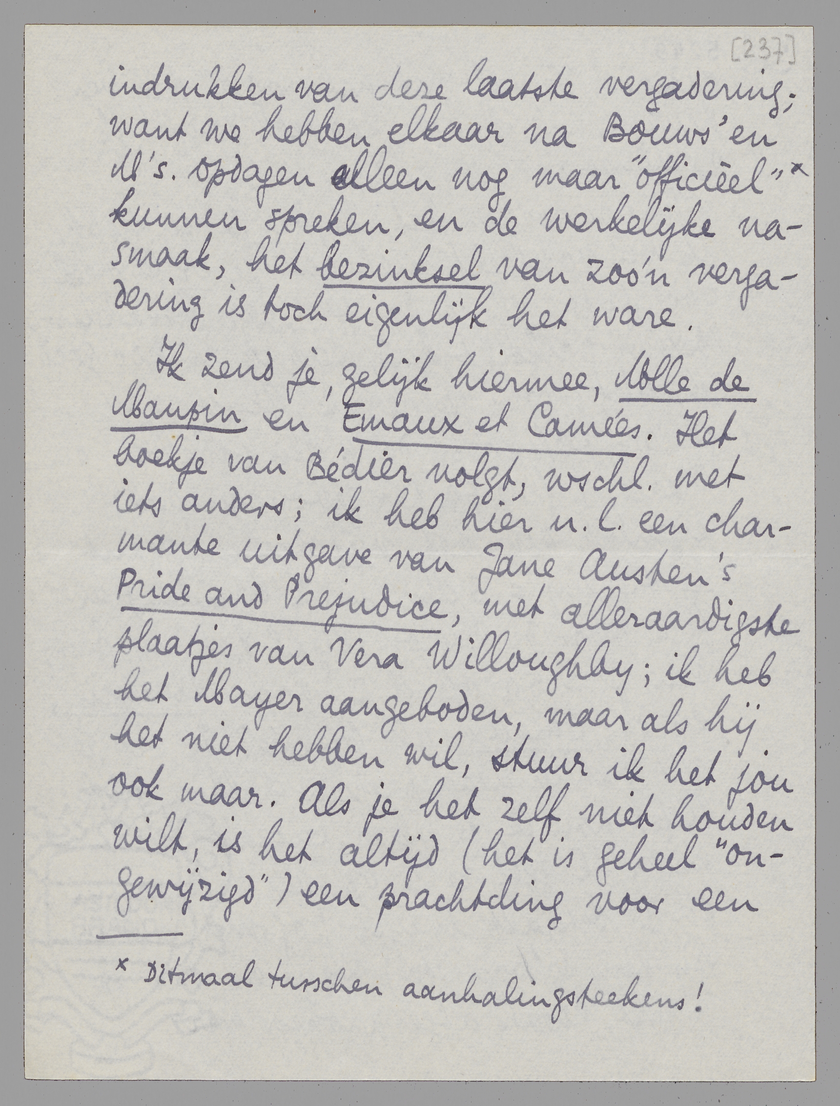 Ik zend je, gelijk hiermee, Mlle de Maupin en Emaux et Camées. Het boekje van Bédier volgt, wschl. met iets anders; ik heb hier n.l. een charmante uitgave van Jane Austen's Pride and Prejudice, met alleraardigste plaatjes van Vera Willoughby; ik heb het Mayer aangeboden, maar als hij het niet hebben wil, stuur ik het jou ook maar. Als je het zelf niet houden wilt, is het altijd (het is geheel ‘ongewijzigd’) een prachtding voor een cadeau. Vooral met het oog op het verhuizen, wil ik hier zooveel mogelijk opruimen.
