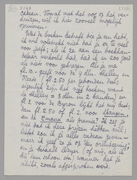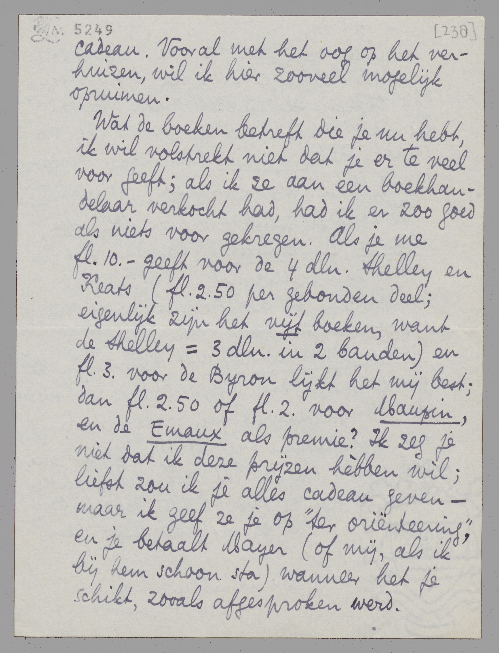 Wat de boeken betreft die je nu hebt, ik wil volstrekt niet dat je er te veel voor geeft; als ik ze aan een boekhandelaar verkocht had, had ik er zoo goed als niets voor gekregen. Als je me fl. 10.- geeft voor de 4 dln. Shelley en Keats (fl. 2.50 per gebonden deel; eigenlijk zijn het vijf boeken, want de Shelley = 3 dln. in 2 banden) en fl. 3. voor de Byron lijkt het mij best; dan fl. 2.50 of fl. 2. voor Maupin, en de Emaux als premie? Ik zeg je niet dat ik deze prijzen hèbben wil; liefst zou ik je alles cadeau geven - maar ik geef ze je op ‘ter oriënteering’, en je betaalt Mayer (of mij, als ik bij hem schoon sta) wanneer het je schikt, zooals afgesproken werd.