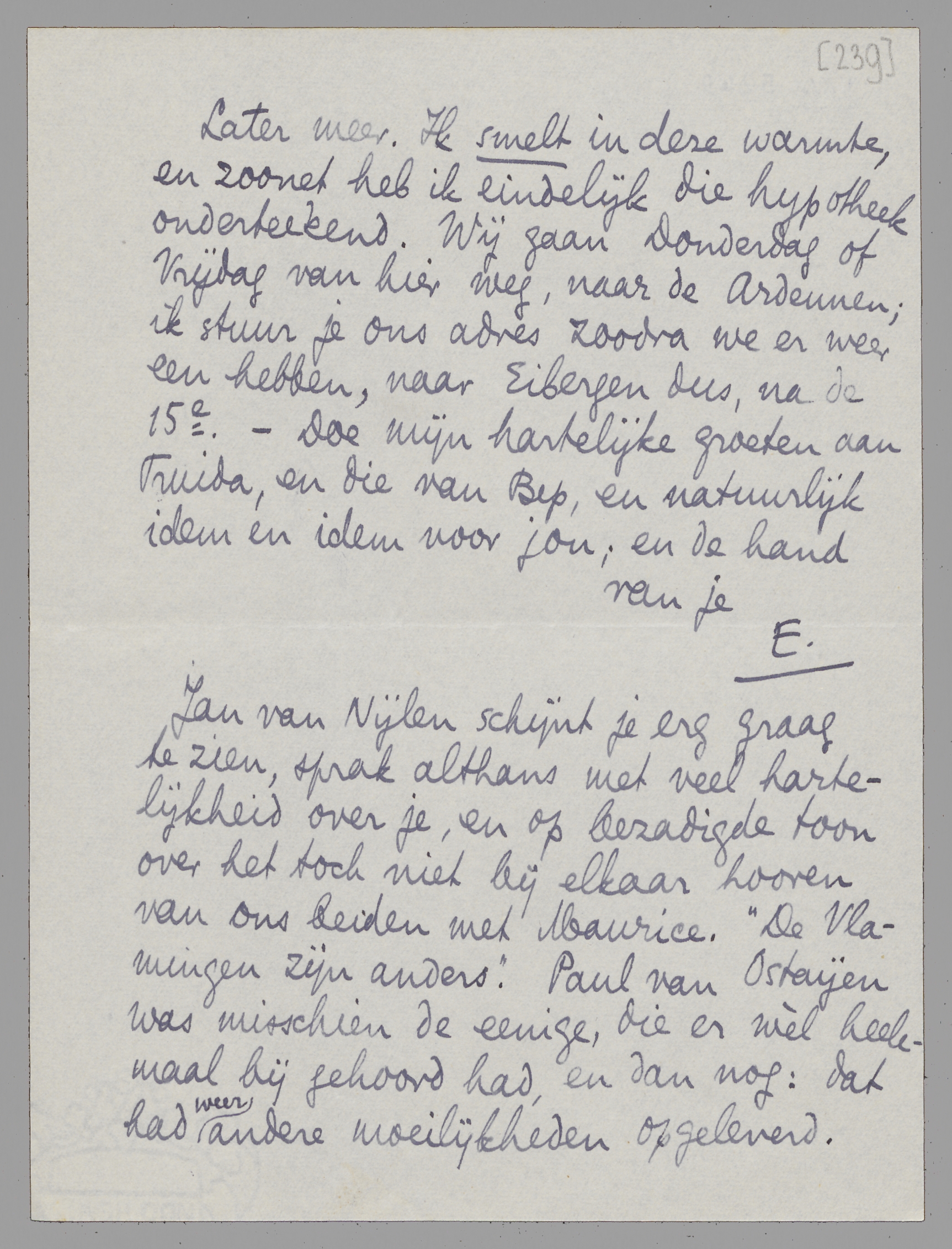 Later meer. Ik smelt in deze warmte, en zoonet heb ik eindelijk die hypotheek onderteekend. Wij gaan Donderdag of Vrijdag van hier weg, naar de Ardennen; ik stuur je ons adres zoodra we er weer een hebben, naar Eibergen dus, na de 15e. - Doe mijn hartelijke groeten aan Truida, en die van Bep, en natuurlijk idem en idem voor jou; en de hand van je