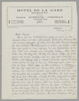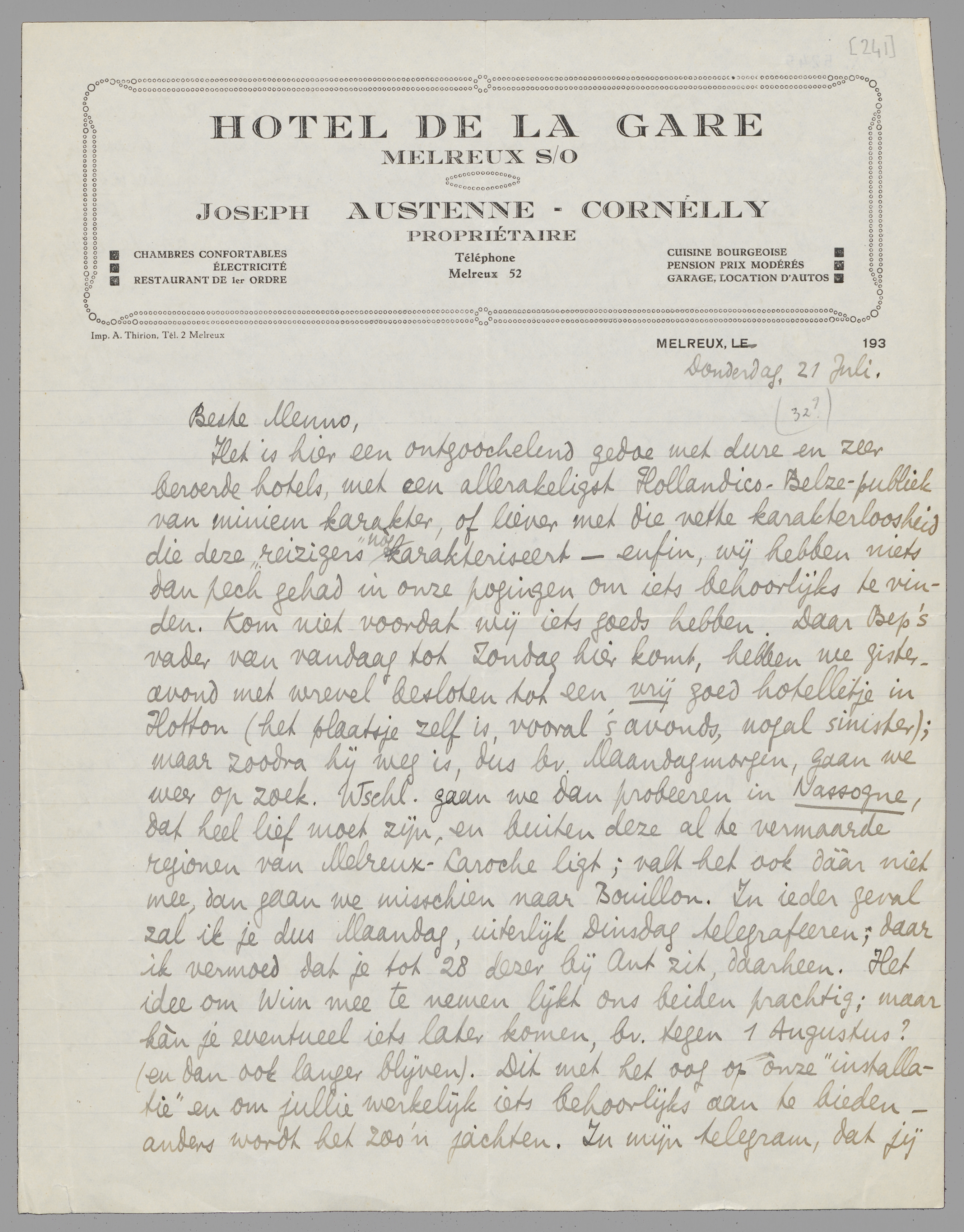 Het is hier een ontgoochelend gedoe met dure en zeer beroerde hotels, met een allerakeligst Hollandico-Belze-publiek van miniem karakter, of liever met die vette karakterloosheid die deze ‘reizigers’ nòg karakteriseert - enfin, wij hebben niets dan pech gehad in onze pogingen om iets behoorlijks te vinden. Kom niet voordat wij iets goeds hebben. Daar Bep's vader van vandaag tot Zondag hier komt, hebben we gisteravond met wrevel besloten tot een vrij goed hotelletje in Hotton (het plaatsje zelf is, vooral 's avonds, nogal sinister); maar zoodra hij weg is, dus bv. Maandagmorgen, gaan we weer op zoek. Wschl. gaan we dan probeeren in Nassogne, dat heel lief moet zijn, en buiten deze al te vermaarde regionen van Melreux-Laroche ligt; valt het ook dààr niet mee, dan gaan we misschien naar Bouillon. In ieder geval zal ik je dus Maandag, uiterlijk Dinsdag telegrafeeren; daar ik vermoed dat je tot 28 dezer bij Ant zit, daarheen. Het idee om Wim mee te nemen lijkt ons beiden prachtig; maar kàn je eventueel iets later komen, bv. tegen 1 Augustus? (en dan ook langer blijven). Dit met het oog op onze ‘installatie’ en om jullie werkelijk iets behoorlijks aan te bieden - anders wordt het zoo'n jachten. In mijn telegram, dat jij dus den 25en of 26en ontvangt, zal ik meteen zetten hoe het er is, dus ik telegrafeer ons adres (dan kan je meteen terugtelegrafeeren) en daarachter: opperbest, bevredigend of matig, of zooiets; in het eerste geval beteekent het dat je direct kunt komen (ik telegrafeer dan ook de route erbij, als dat noodig is), anders: dat je beter kunt wachten tot we iets anders hebben. Als je den 28en weg moèt, is er geen tijd meer voor correspondentie en moet alles per telegram.