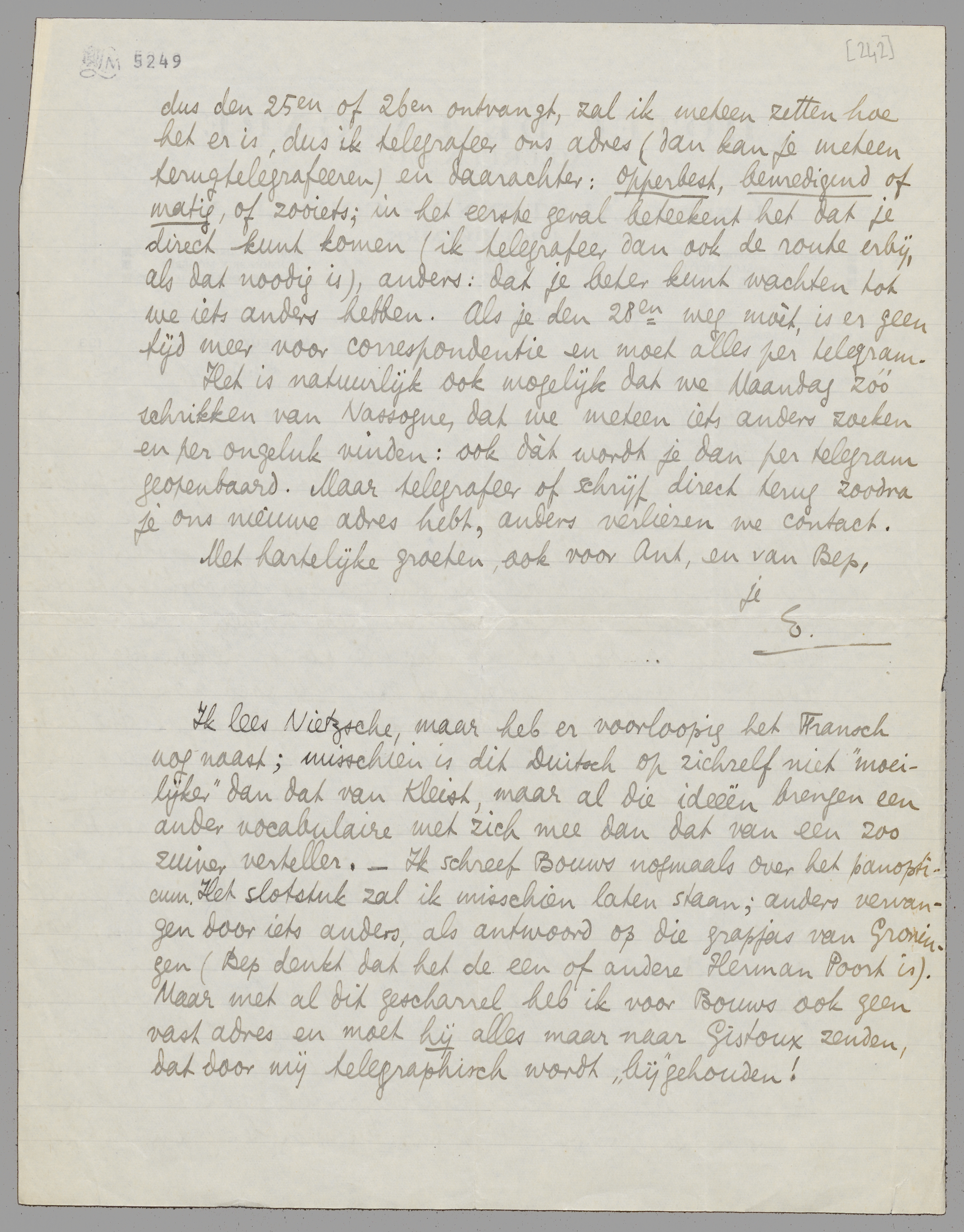 Ik lees Nietzsche, maar heb er voorloopig het Fransch nog naast; misschien is dit Duitsch op zichzelf niet ‘moeilijker’ dan dat van Kleist, maar al die ideeën brengen een ander vocabulaire met zich mee dan dat van een zoo zuiver verteller. - Ik schreef Bouws nogmaals over het panopticum. Het slotstuk zal ik misschien laten staan; anders vervangen door iets anders, als antwoord op die grapjas van Groningen (Bep denkt dat het de een of andere Herman Poort is). Maar met al dit gescharrel heb ik voor Bouws ook geen vast adres en moet hij alles maar naar Gistoux zenden, dat door mij telegraphisch wordt ‘bij’gehouden!