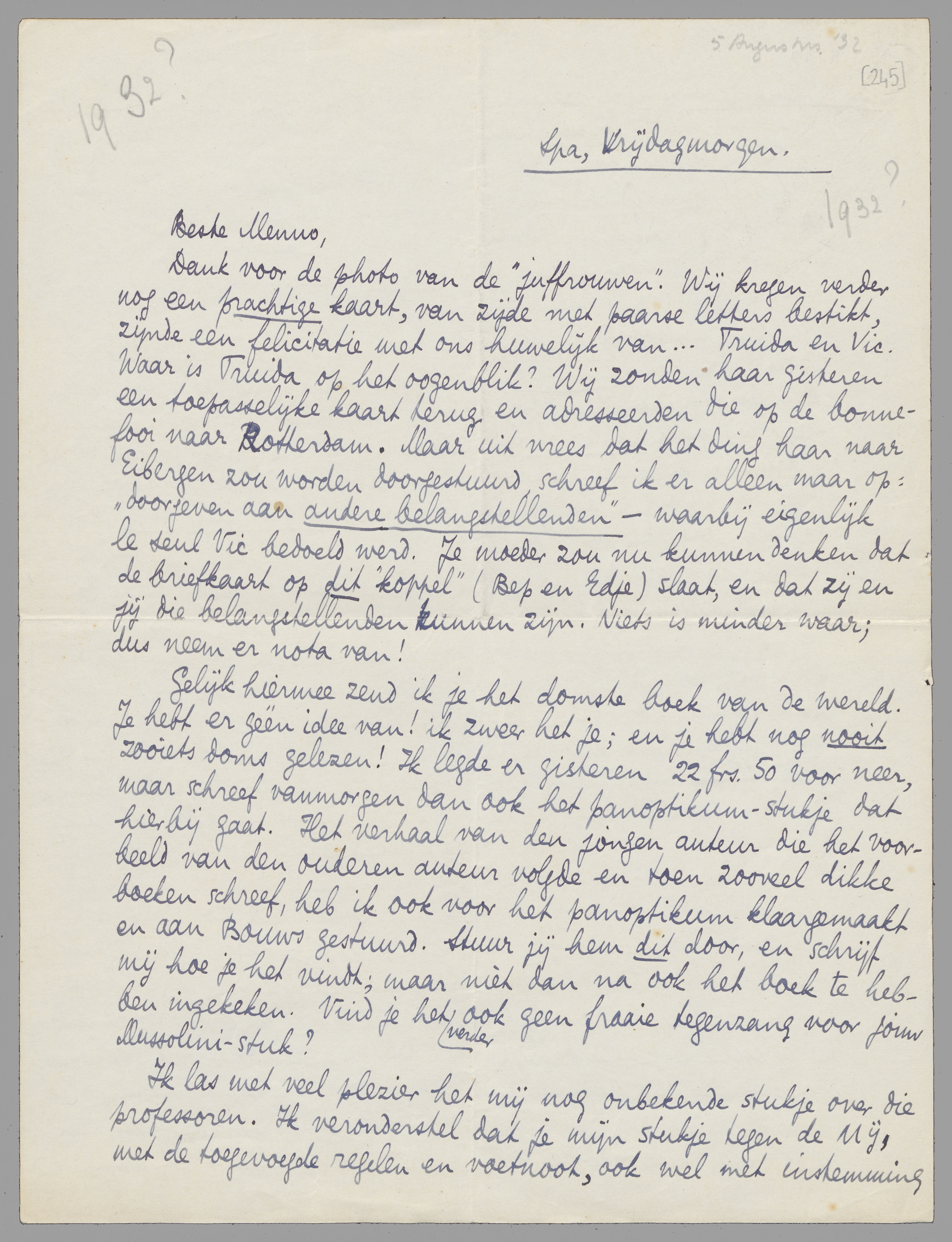Gelijk hiermee zend ik je het domste boek van de wereld. Je hebt er géén idee van! ik zweer het je; en je hebt nog nooit zooiets doms gelezen! Ik legde er gisteren 22 frs. 50 voor neer, maar schreef vanmorgen dan ook het panopticum-stukje dat hierbij gaat. Het verhaal van den jongen auteur die het voorbeeld van den ouderen auteur volgde en toen zooveel dikke boeken schreef, heb ik ook voor het panoptikum klaargemaakt en aan Bouws gestuurd. Stuur jij hem dit door, en schrijf mij hoe je het vindt; maar niet dan na ook het boek te hebben ingekeken. Vind je het verder ook geen fraaie tegenzang voor jouw Mussolini-stuk?
